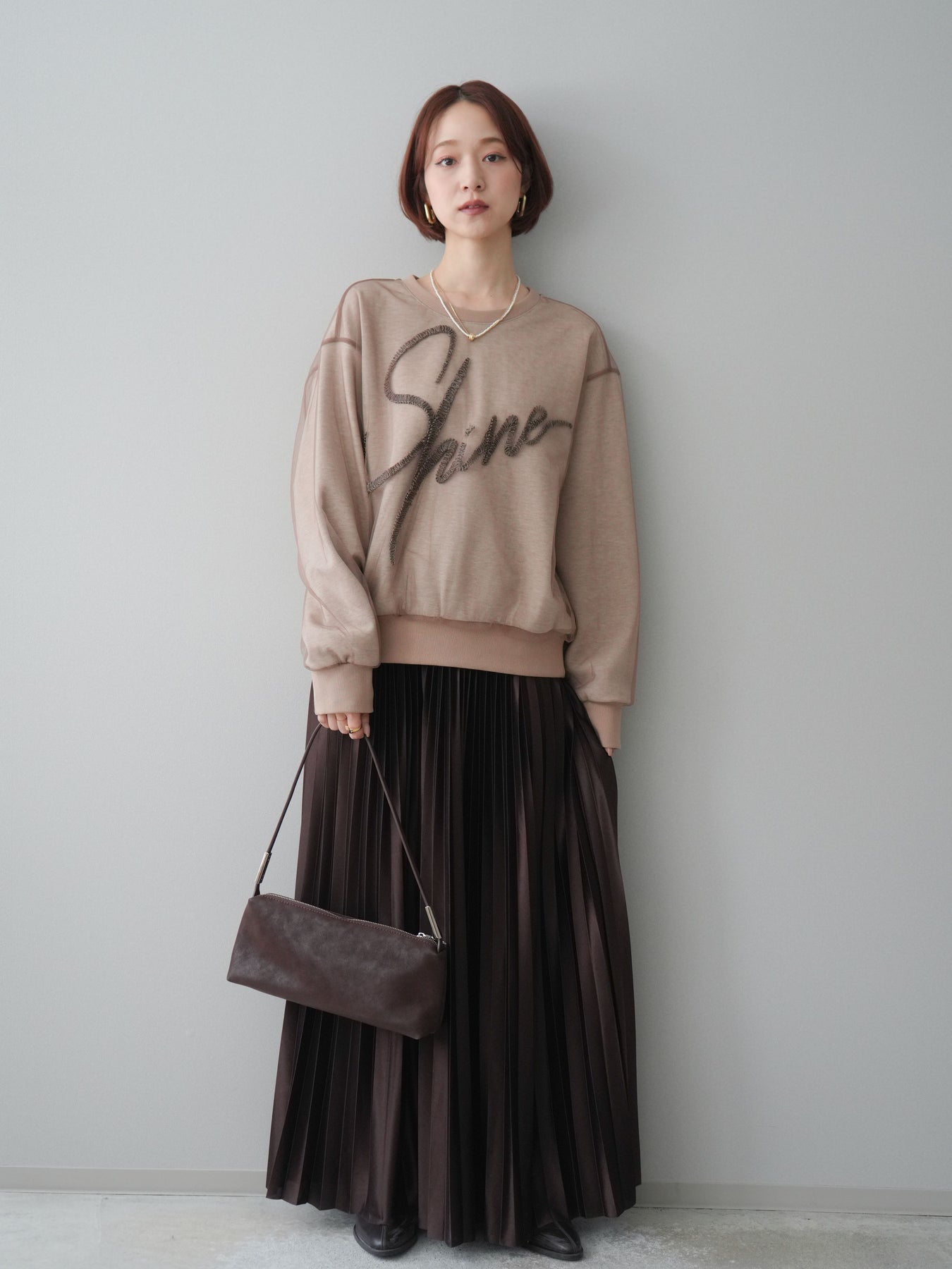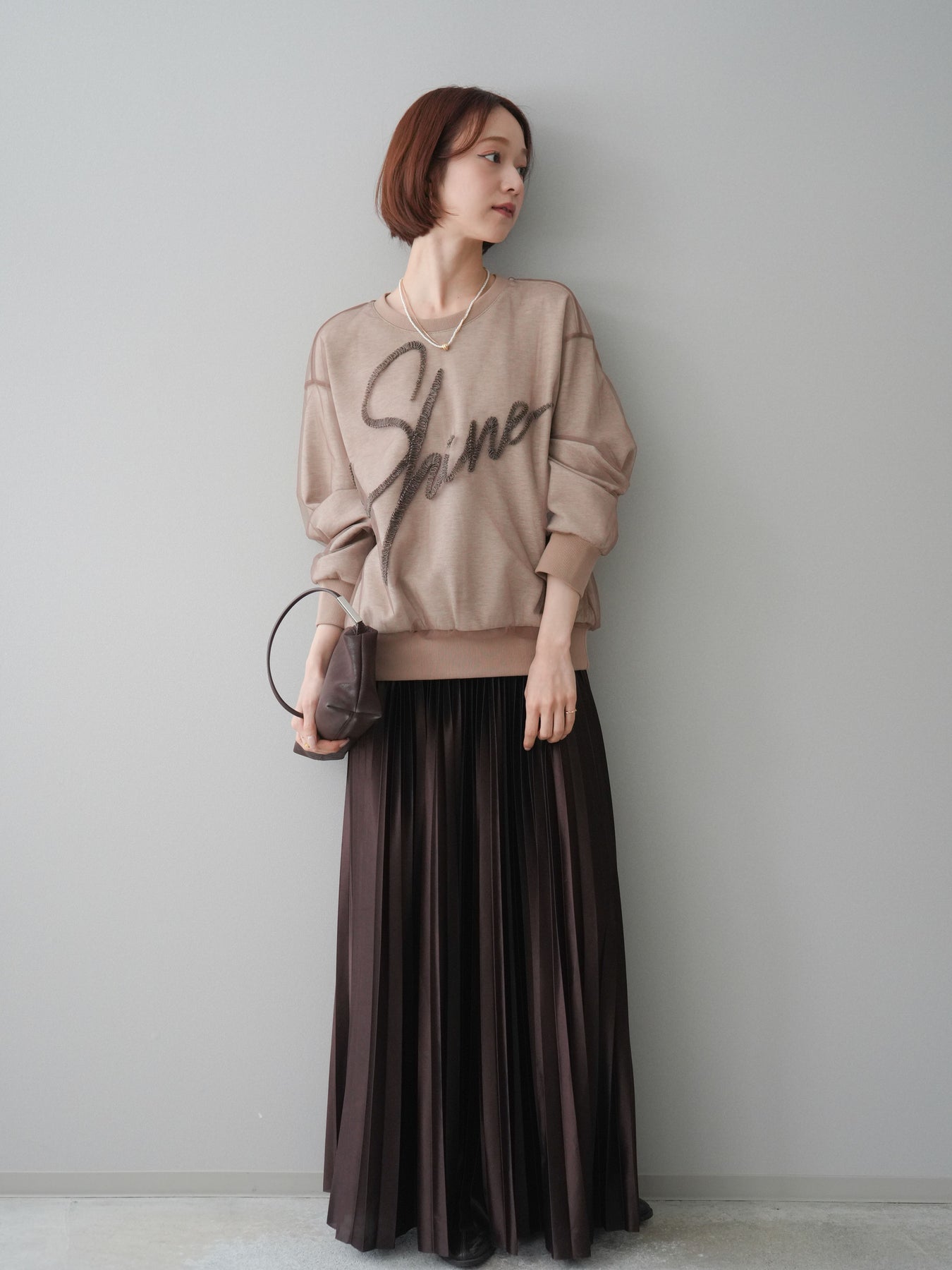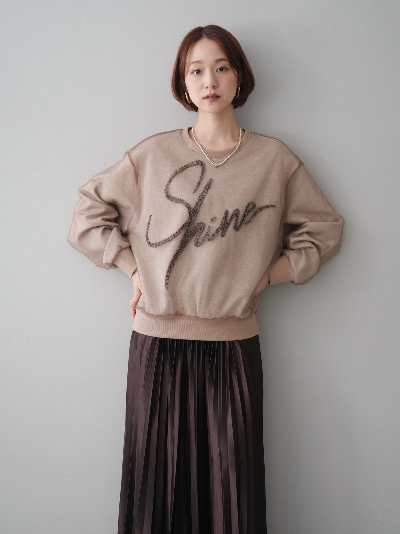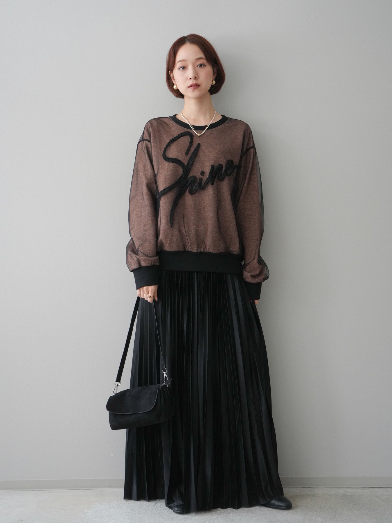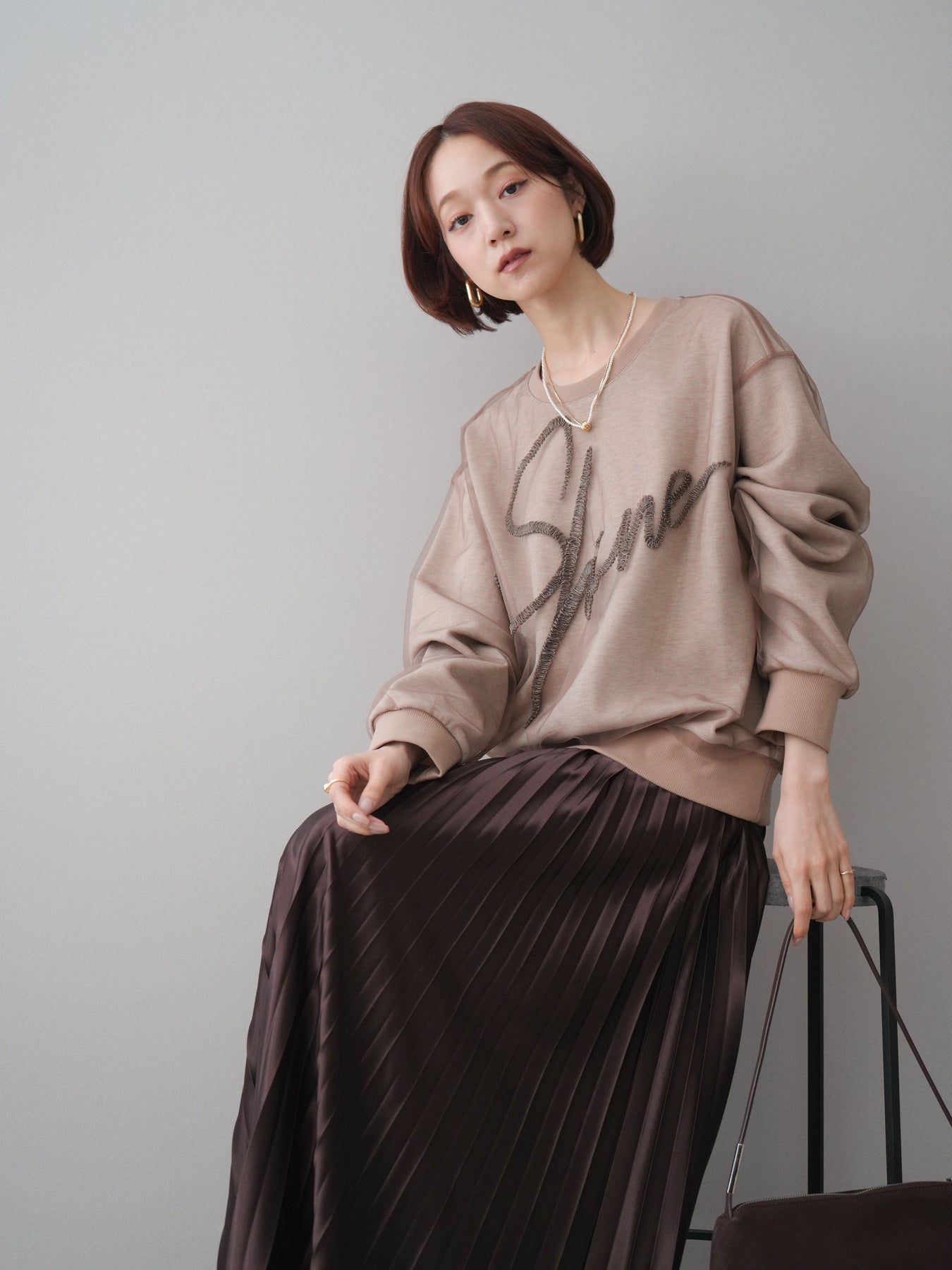[SET]チュールレイヤードロゴスエットプルオーバー+サテンプリーツマキシスカート(2set)