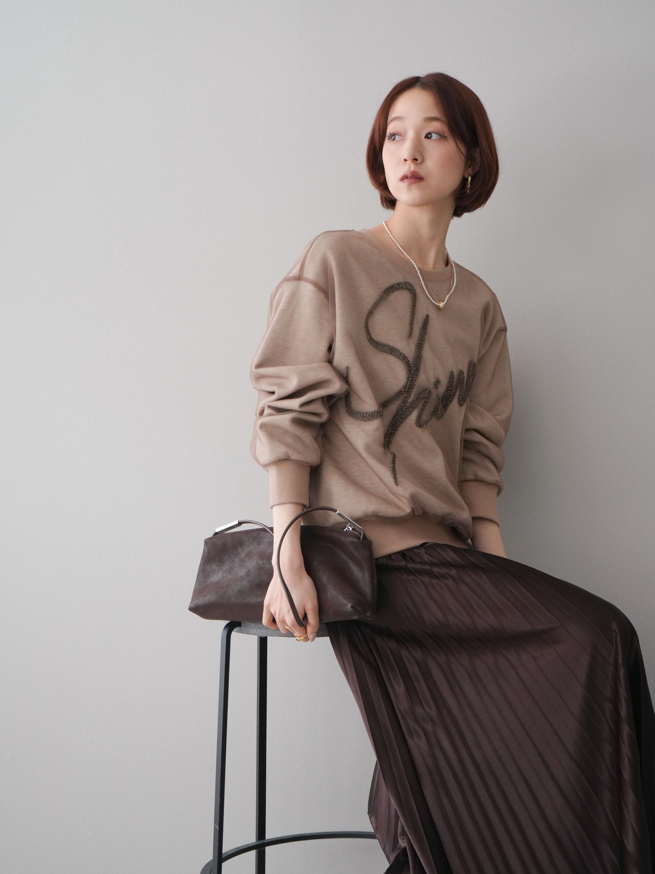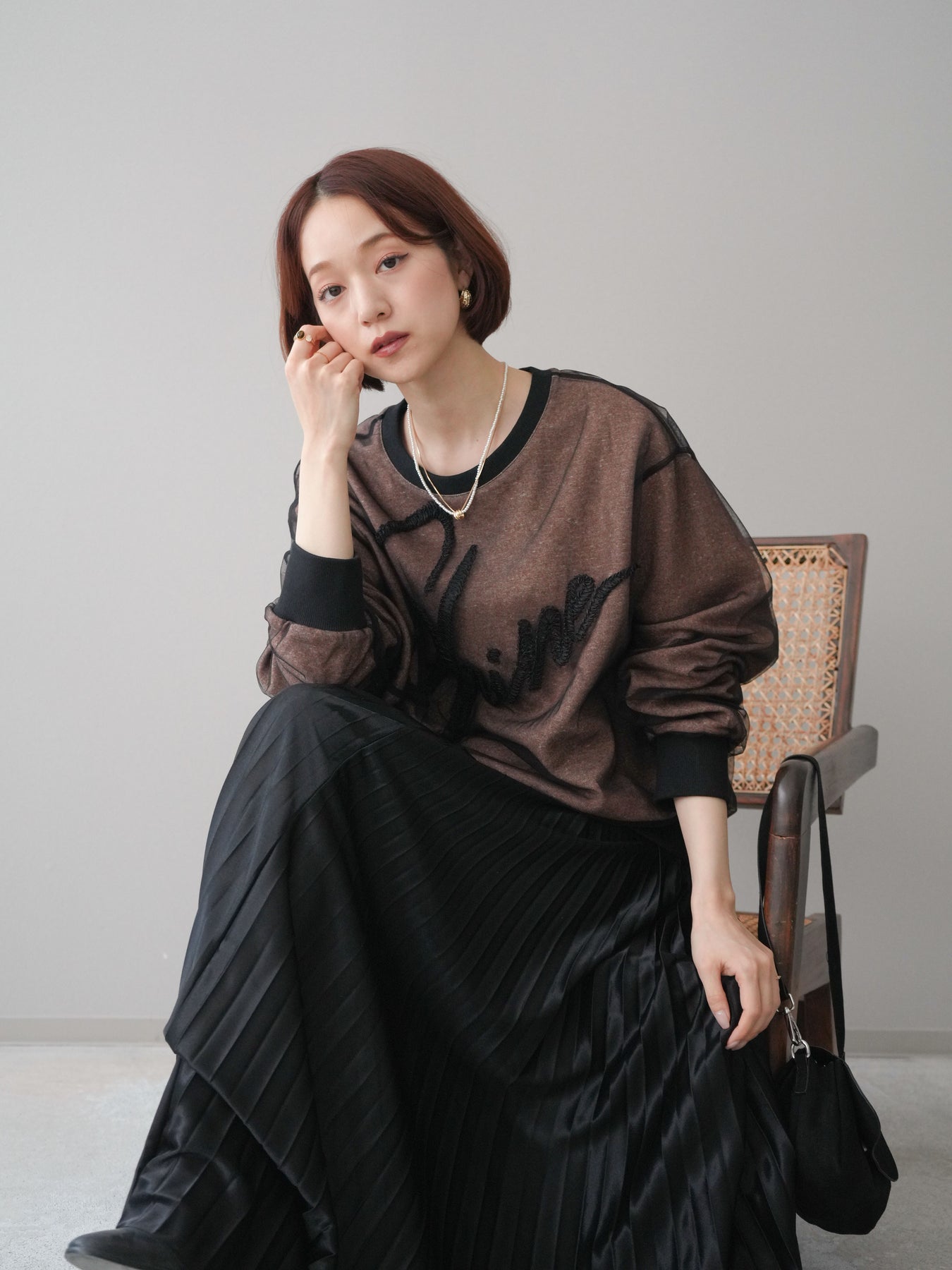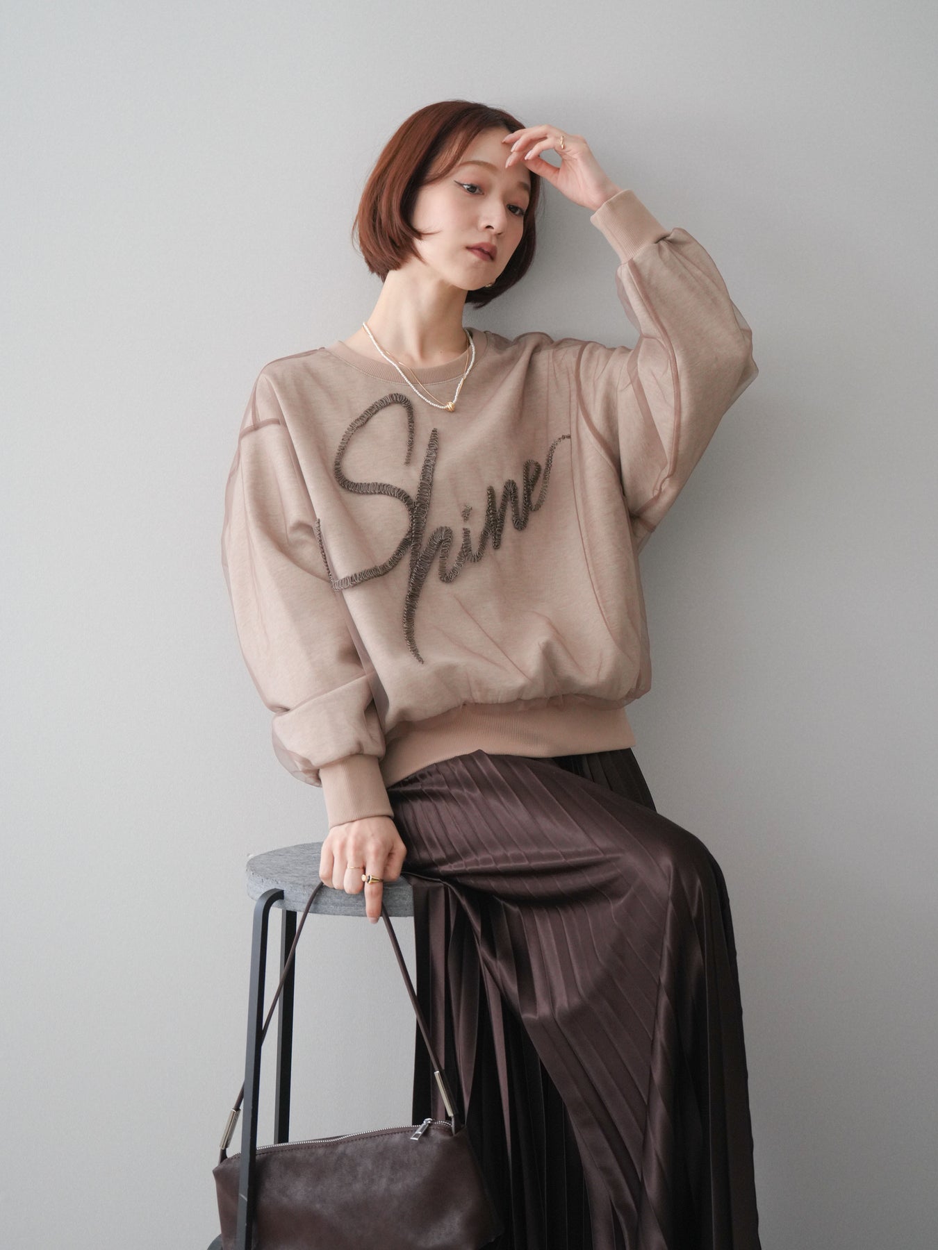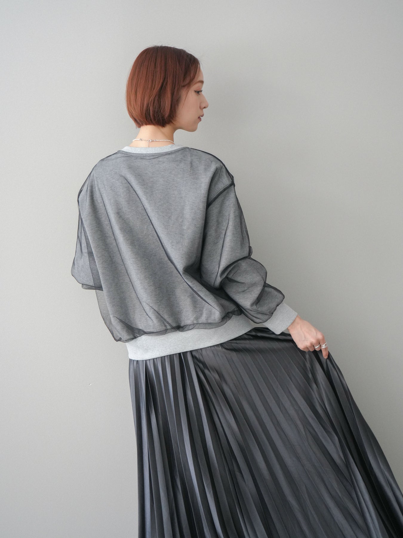 [SET]チュールレイヤードロゴスエットプルオーバー+サテンプリーツマキシスカート(2set)