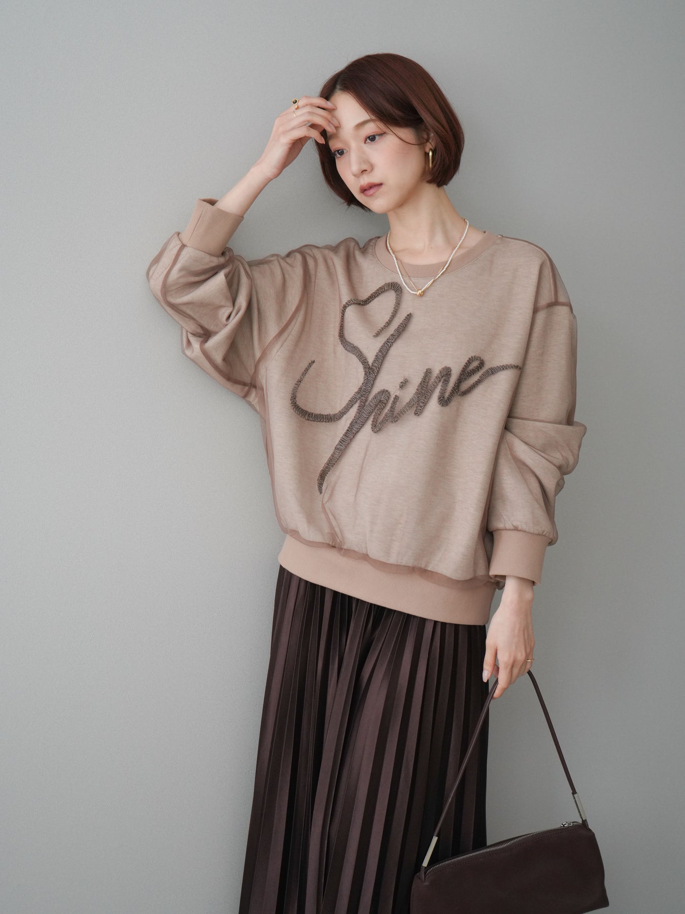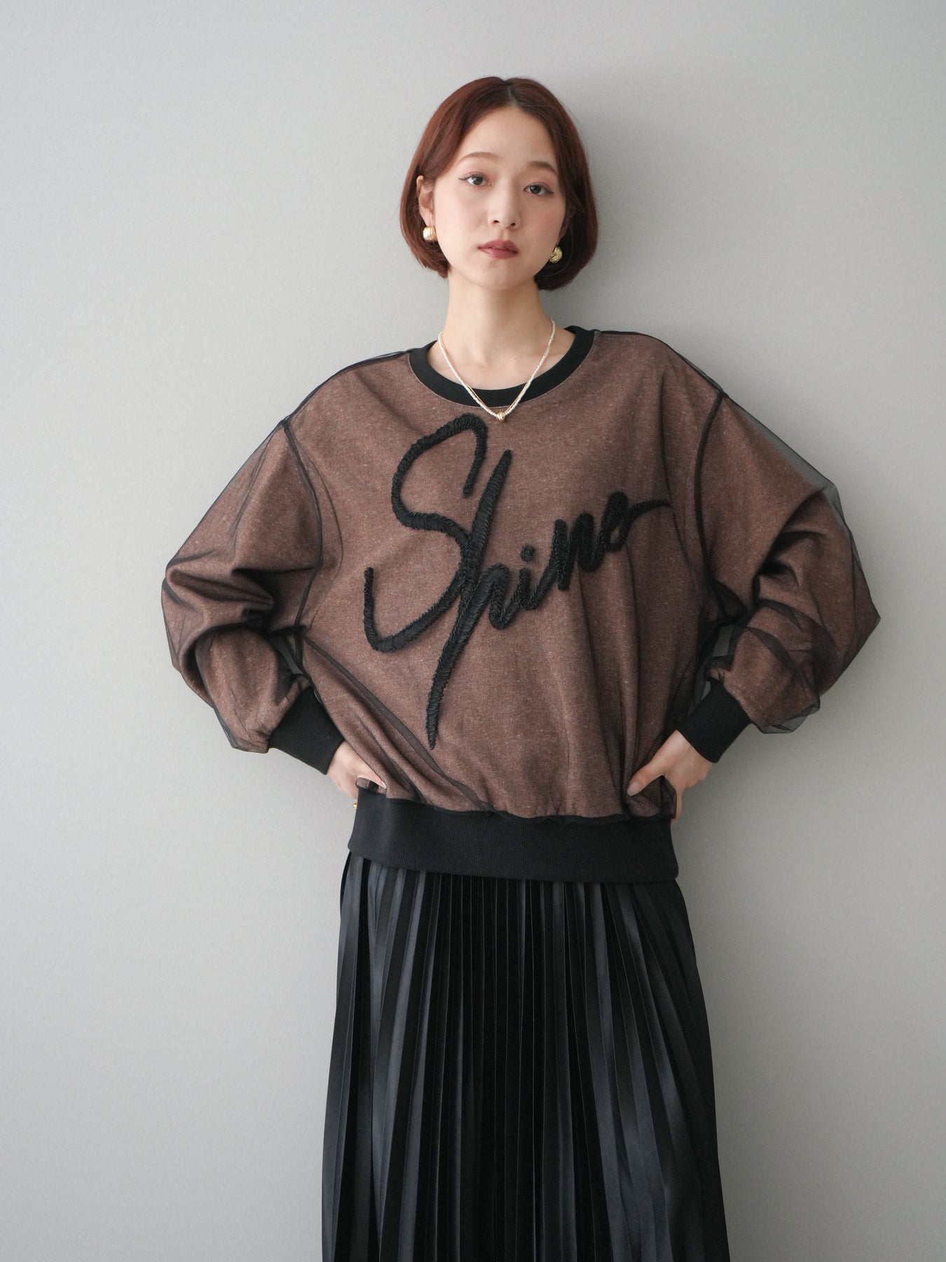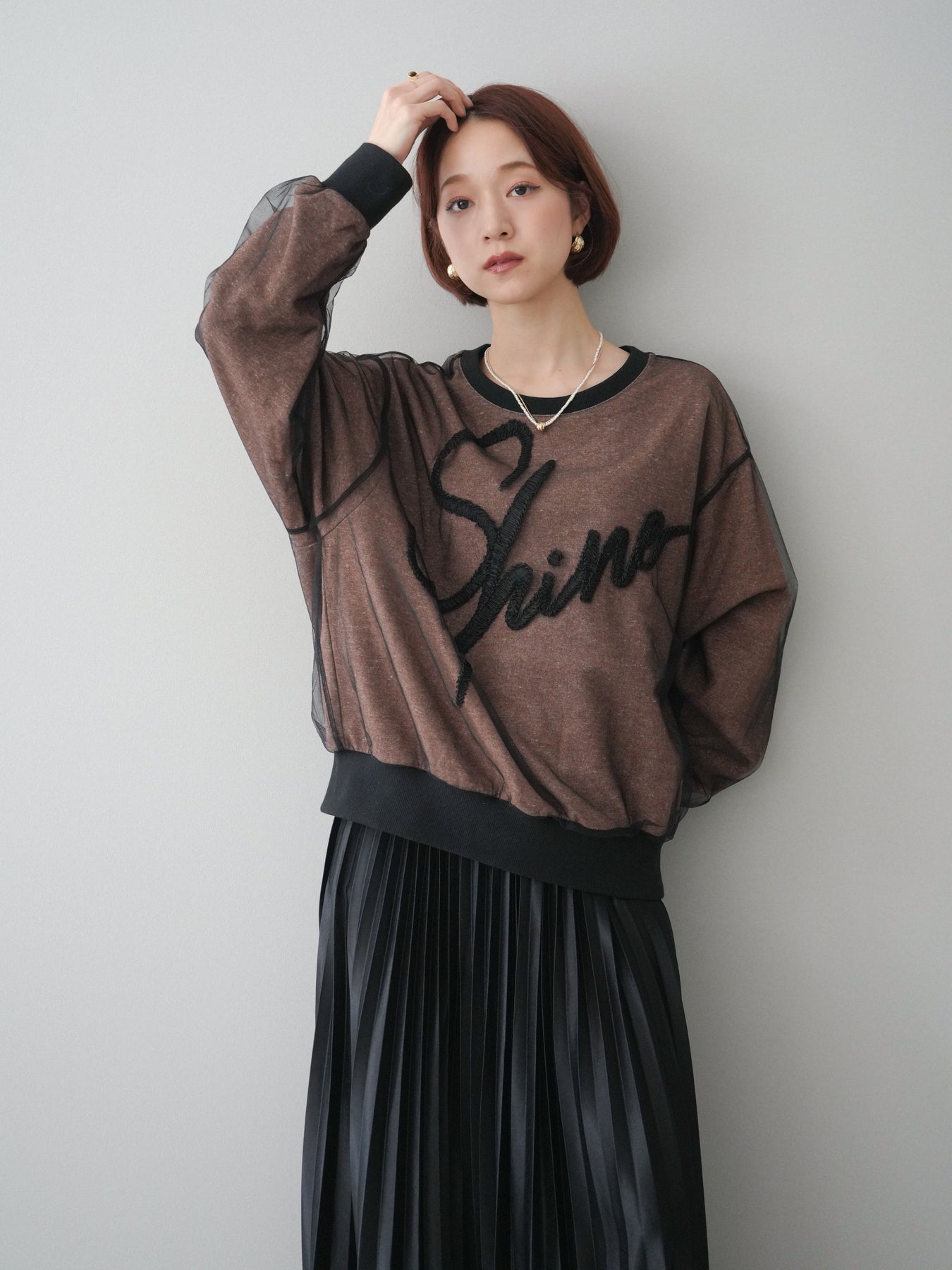 ロゴデザインにチュール素材を重ねた、存在感のあるレイヤード風スエットプルオーバー。透け感のあるチュールがロゴや全体の表情に奥行きを与え、カジュアルな中にも女性らしい抜け感をプラスします。程よくゆとりのあるシルエットで、リラックスした着心地ながらもスタイリングの主役になる一着。シンプルなボトムスと合わせるだけでバランスの取れたコーディネートが完成し、デイリー使いからちょっとしたお出かけまで幅広く活躍します。 ※ボトムス、キャミソール(インナー)以外の商品は一律でインナーは付属していません。