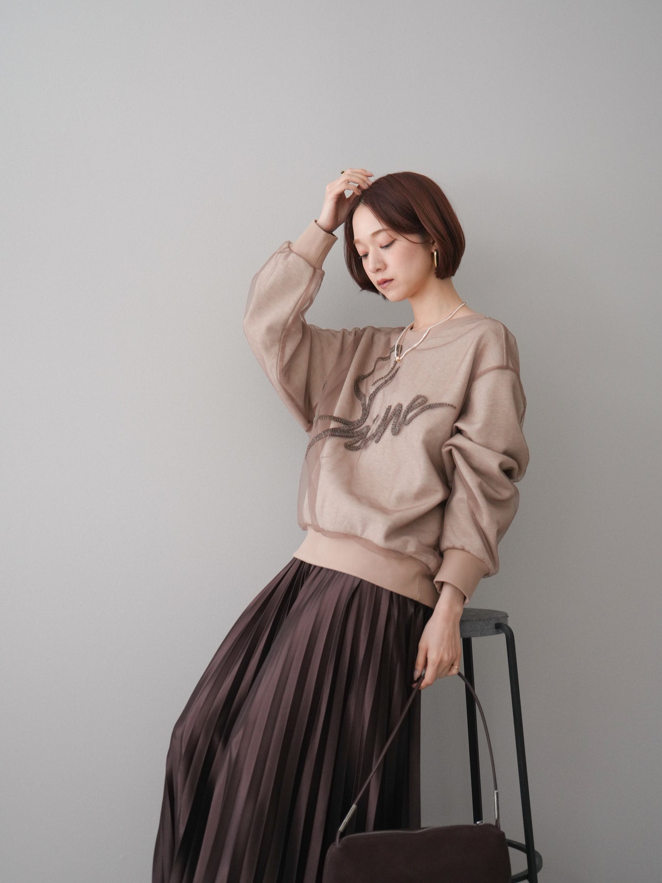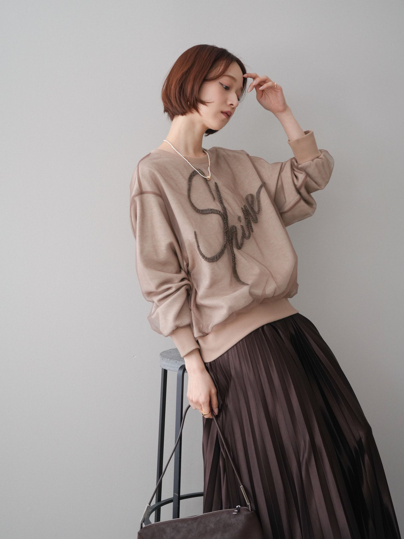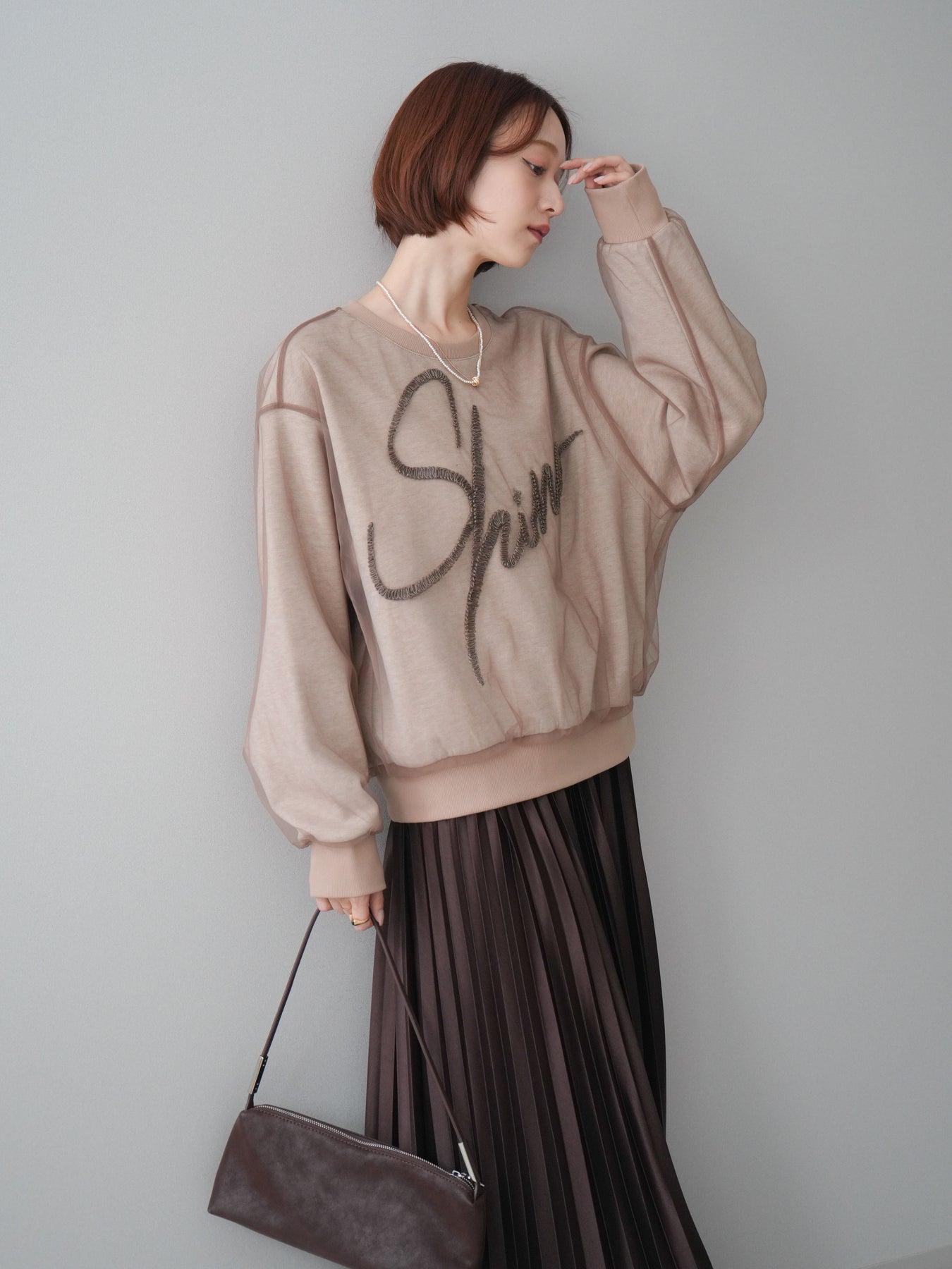 ロゴデザインにチュール素材を重ねた、存在感のあるレイヤード風スエットプルオーバー。透け感のあるチュールがロゴや全体の表情に奥行きを与え、カジュアルな中にも女性らしい抜け感をプラスします。程よくゆとりのあるシルエットで、リラックスした着心地ながらもスタイリングの主役になる一着。シンプルなボトムスと合わせるだけでバランスの取れたコーディネートが完成し、デイリー使いからちょっとしたお出かけまで幅広く活躍します。 ※ボトムス、キャミソール(インナー)以外の商品は一律でインナーは付属していません。
