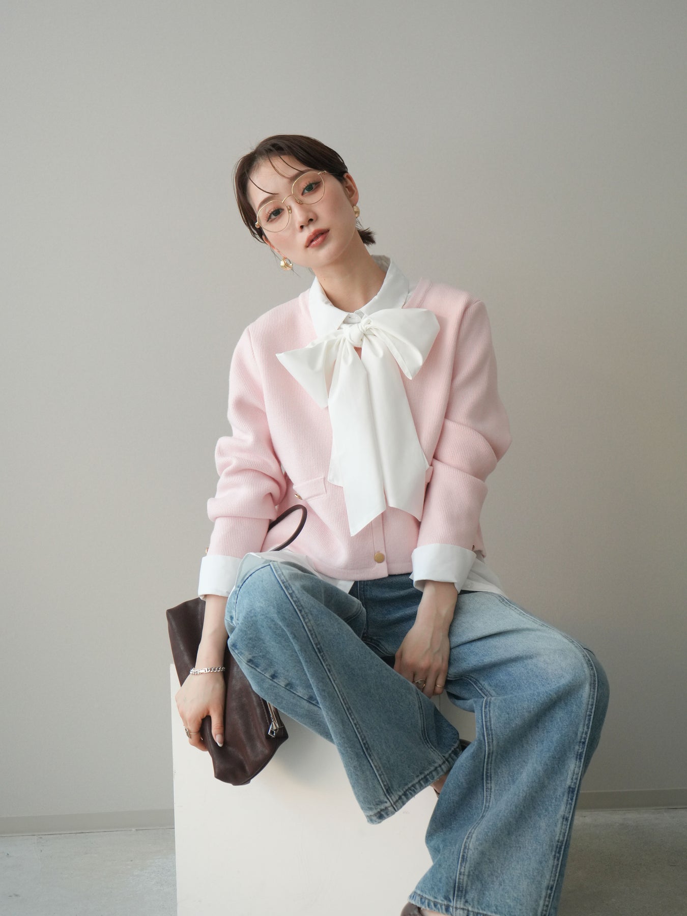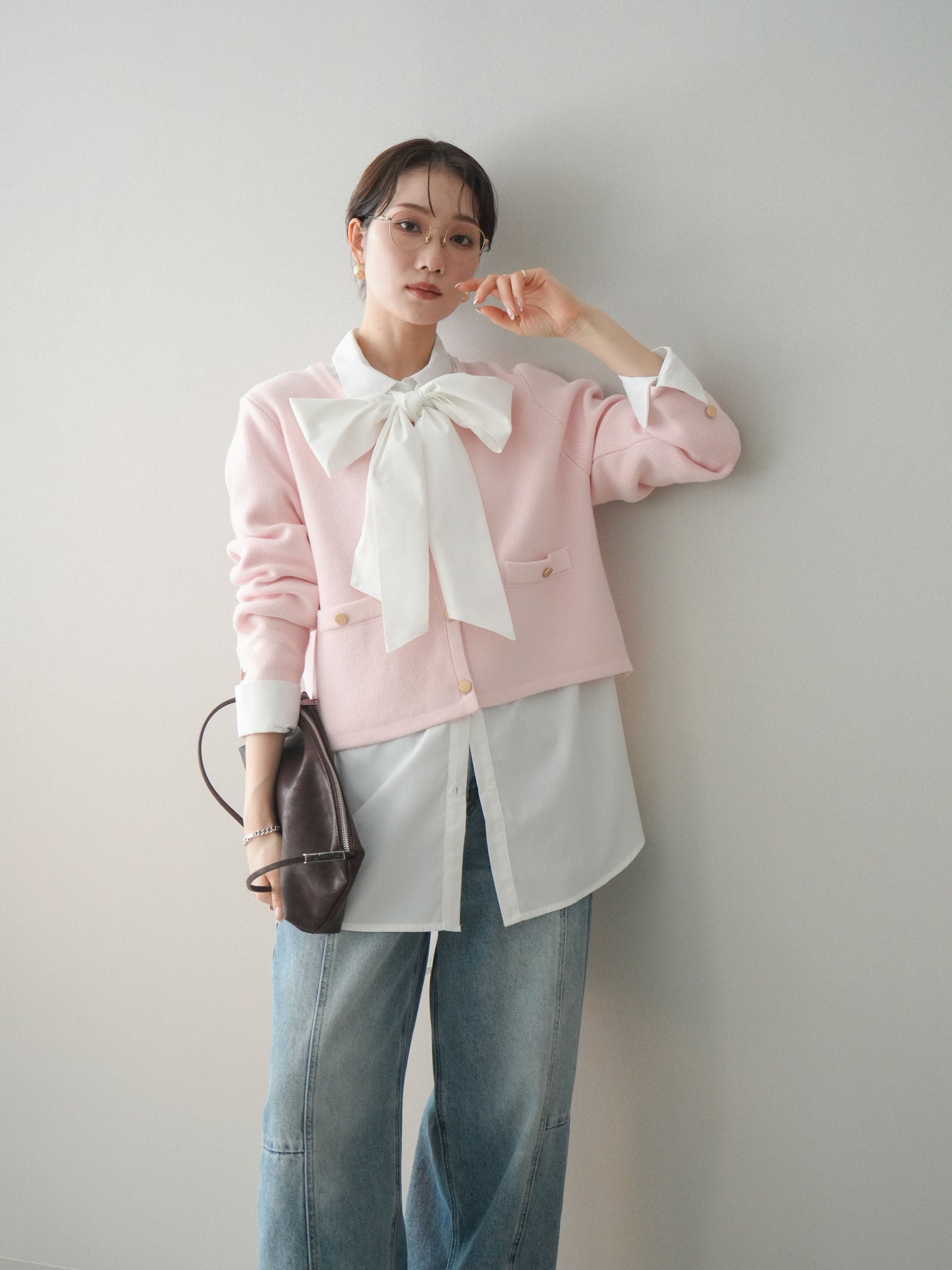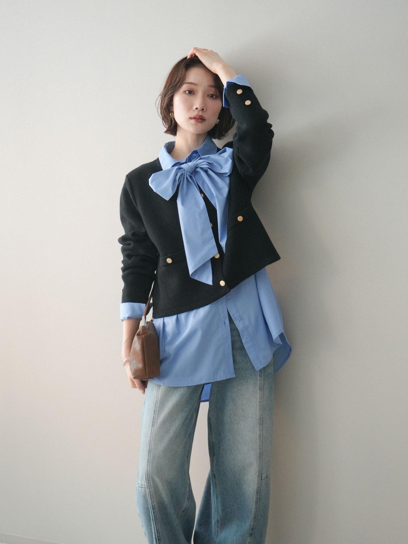 [SET]ゴールドボタンノーカラーニットジャケット+ボウタイ付オーバーシャツ(2set)