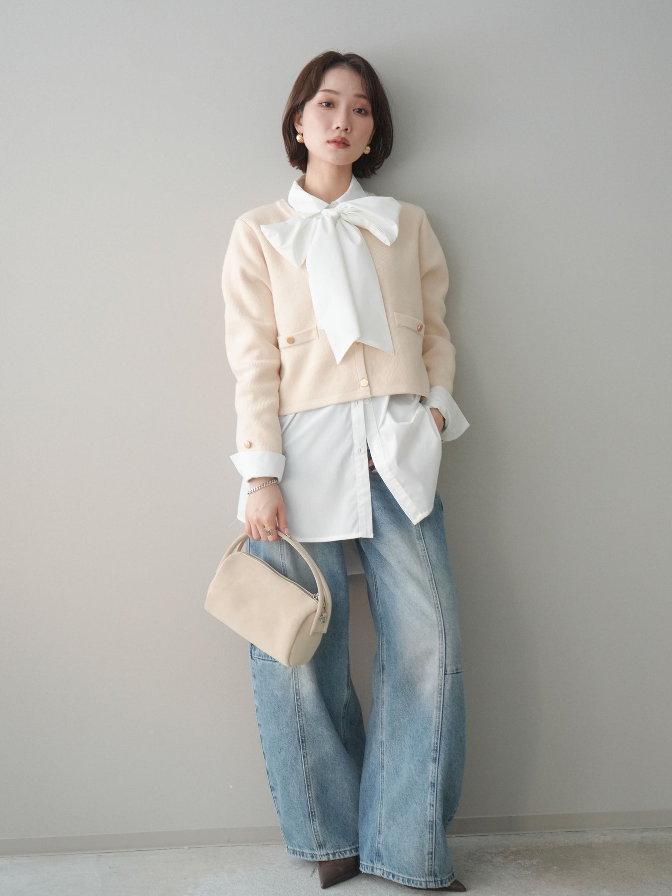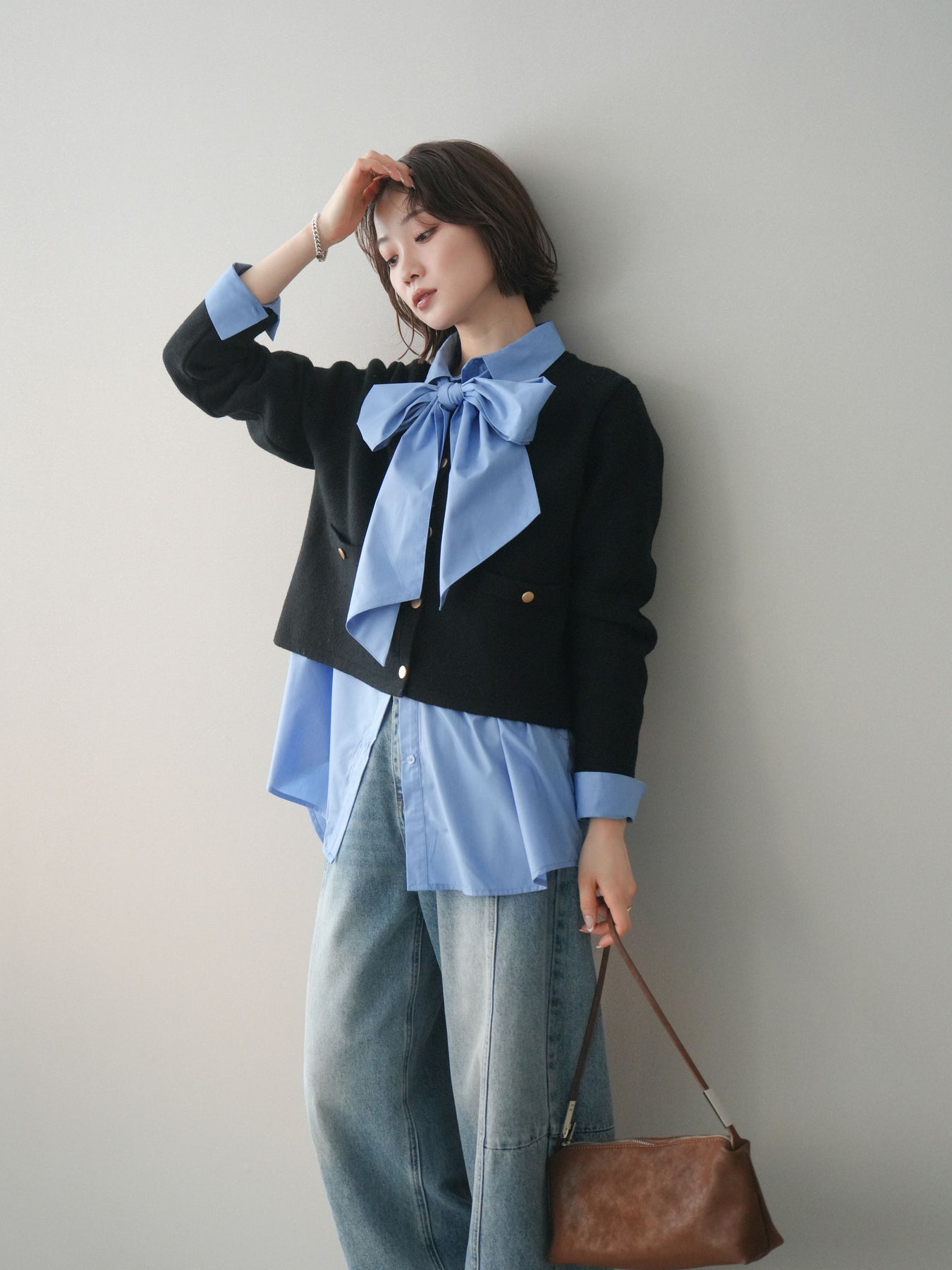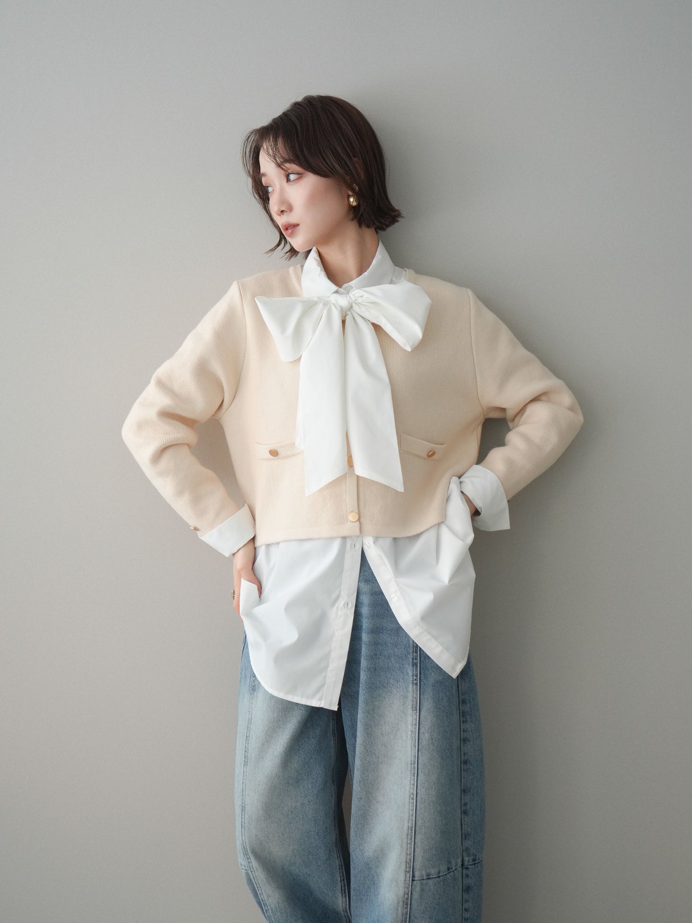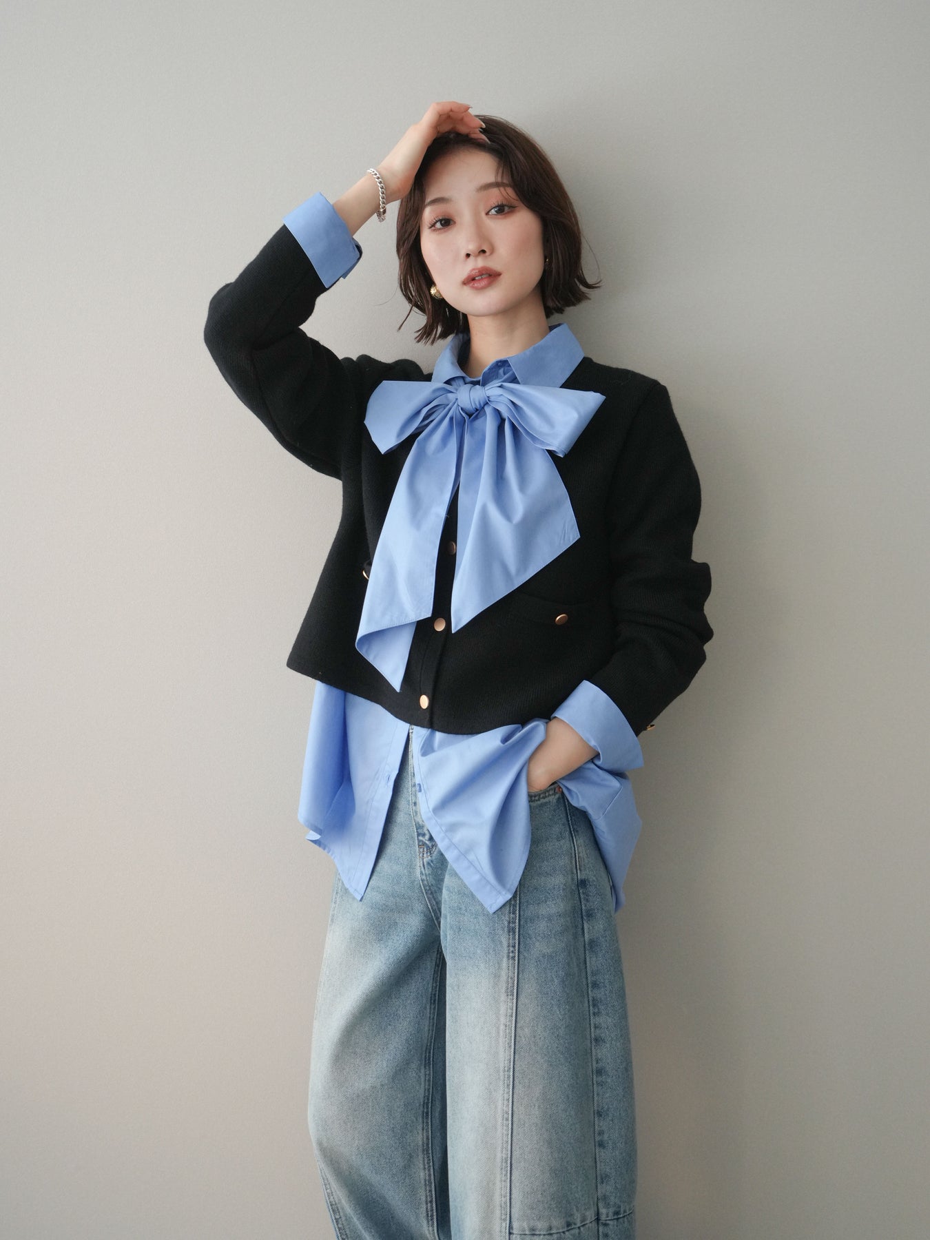 [SET]ゴールドボタンノーカラーニットジャケット+ボウタイ付オーバーシャツ+ガーメントウォッシュカーブデニムパンツ(3set)