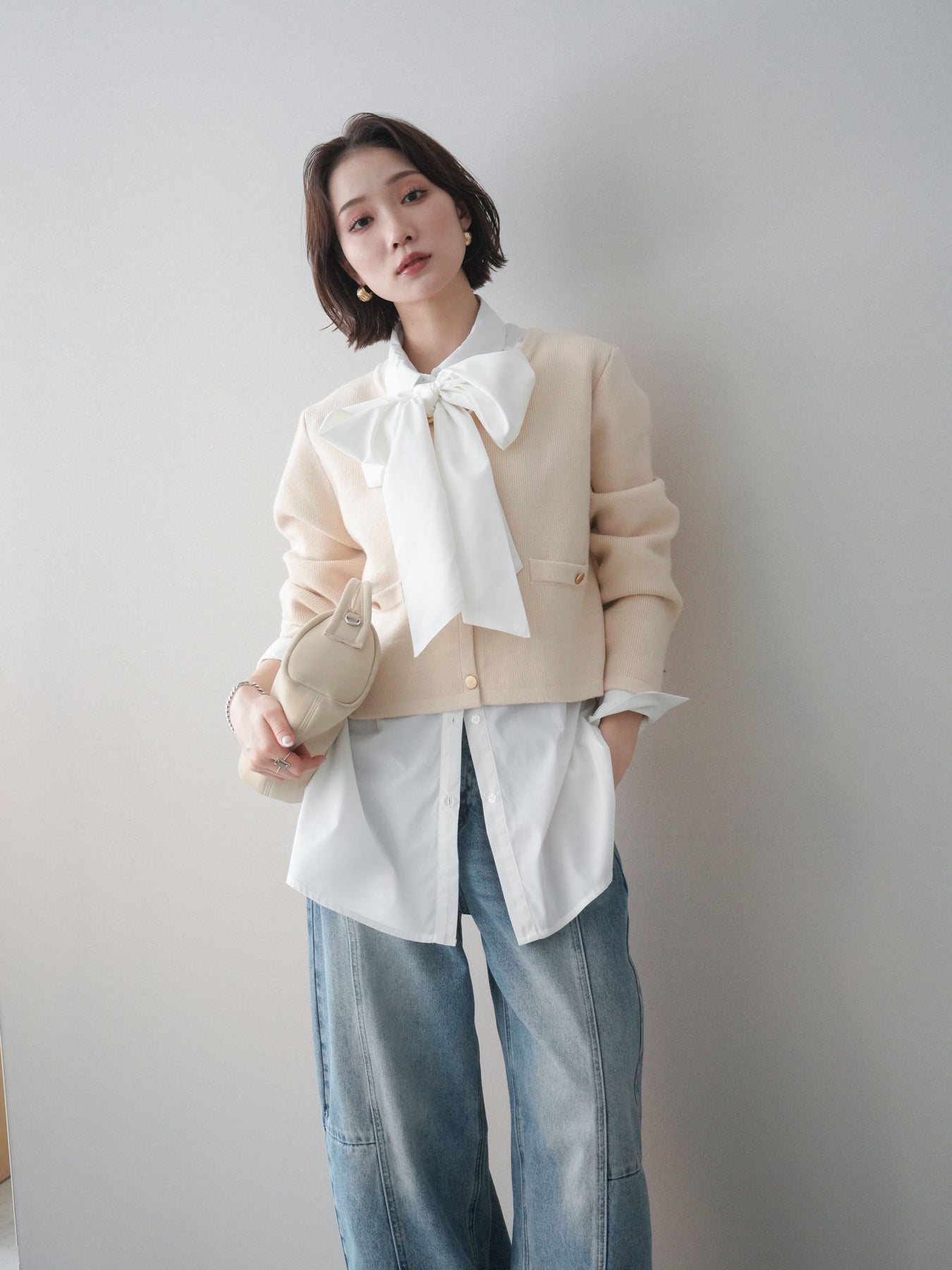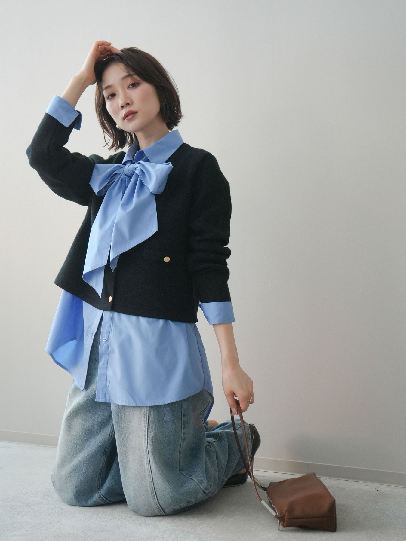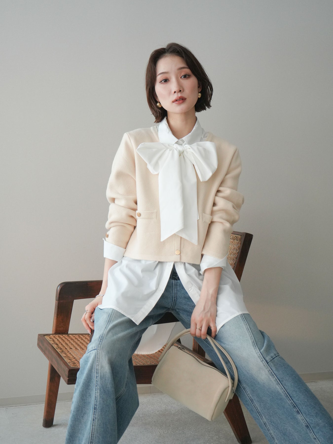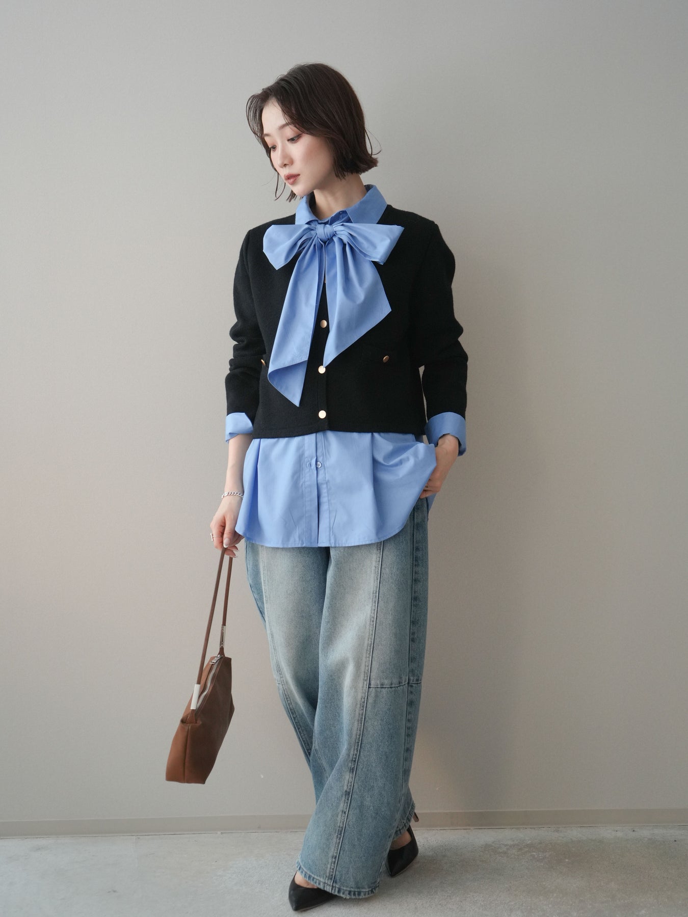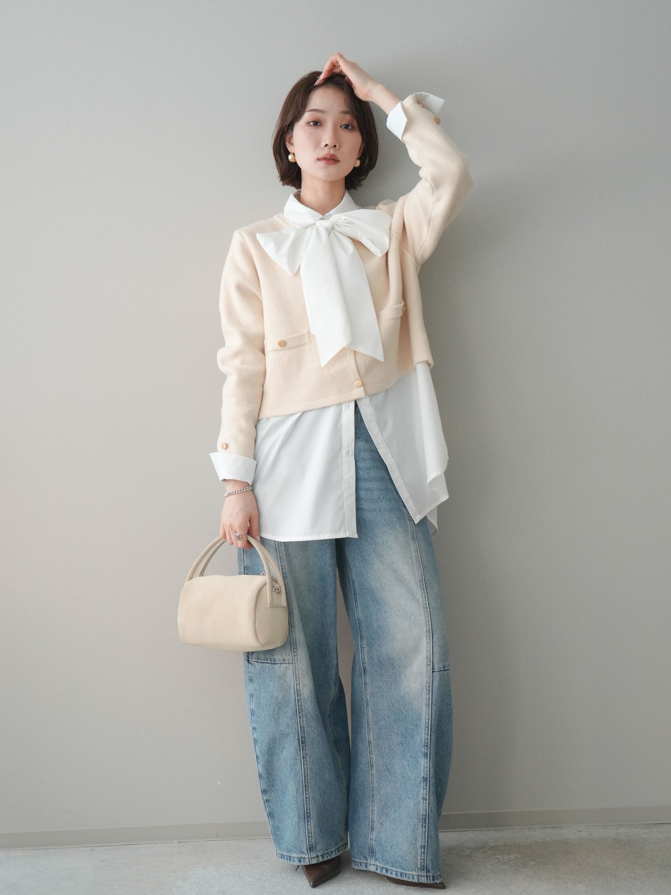 [SET]ゴールドボタンノーカラーニットジャケット+ボウタイ付オーバーシャツ+ガーメントウォッシュカーブデニムパンツ(3set)