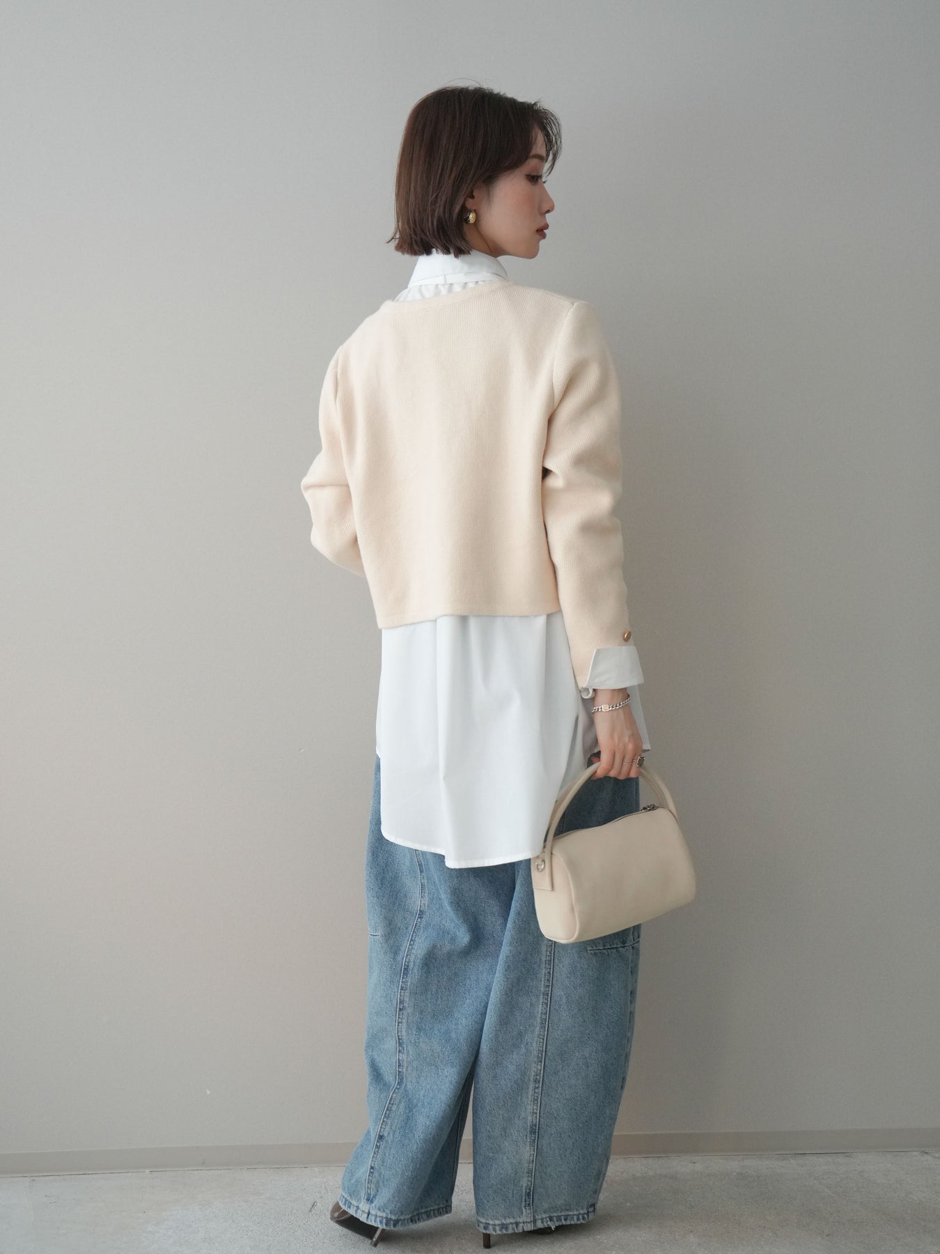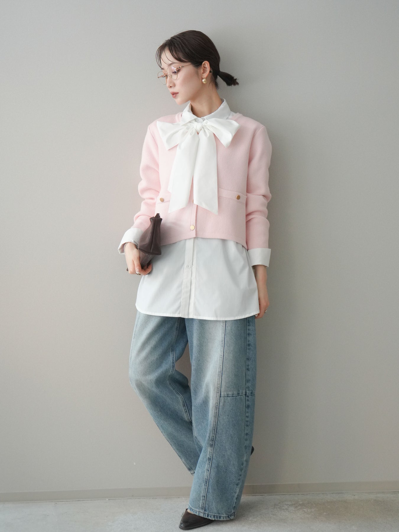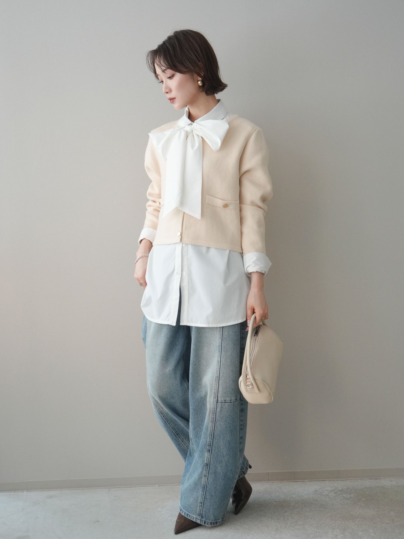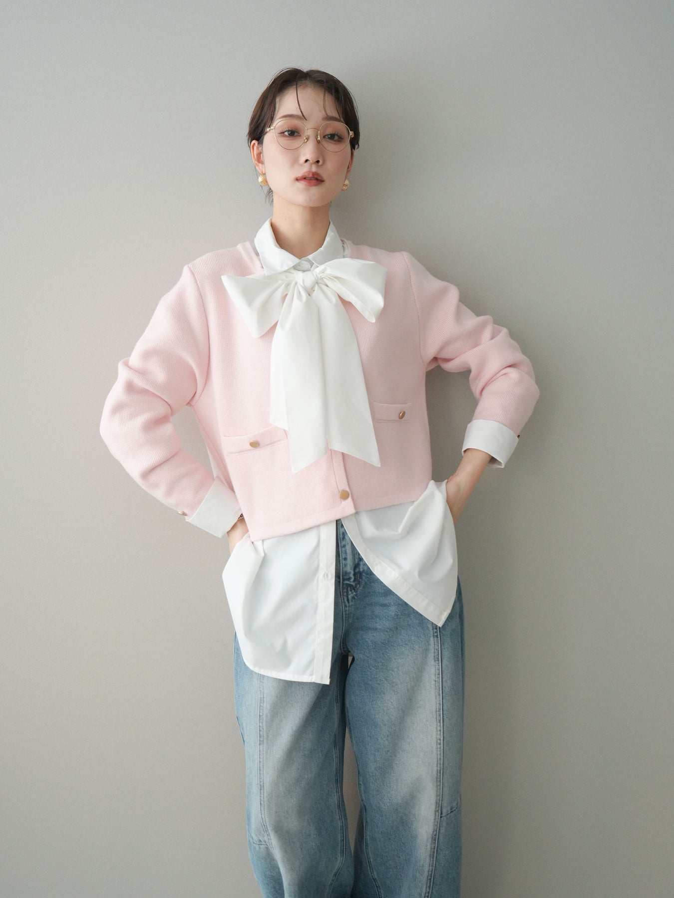 [SET]ゴールドボタンノーカラーニットジャケット+ボウタイ付オーバーシャツ+ガーメントウォッシュカーブデニムパンツ(3set)