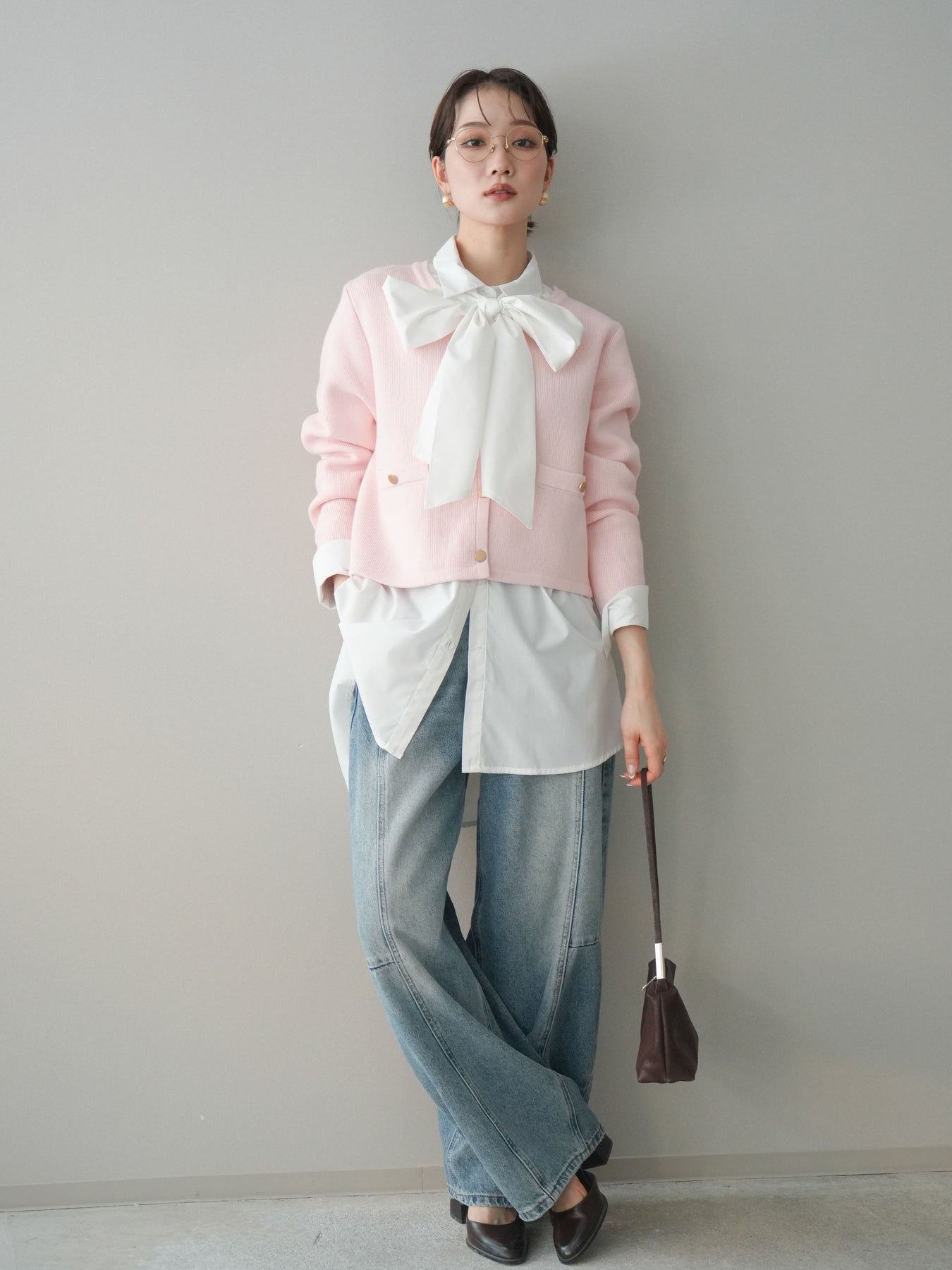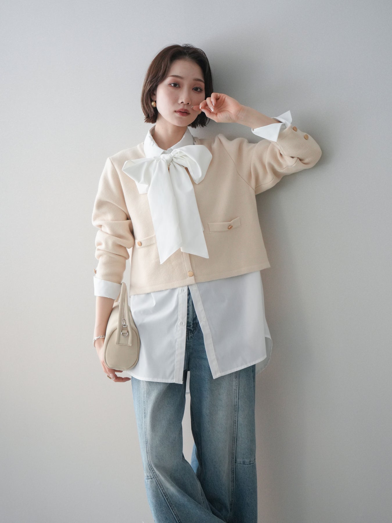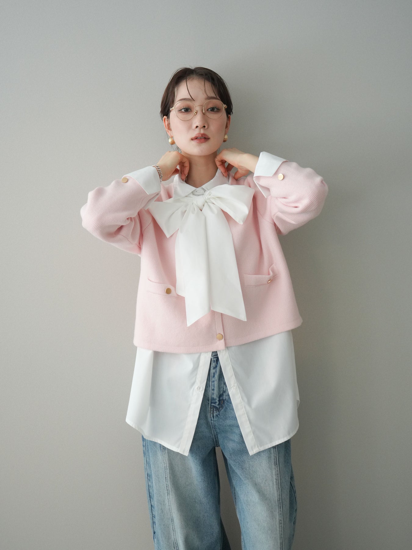 程よく力の抜けたシルエットに、ゴールドボタンがアクセントとして映えるノーカラーニットジャケット。 柔らかなニット素材ならではの軽やかさがあり、アウター感覚というよりも、カーディガンに近い感覚で取り入れやすい一枚です。 ノーカラーデザインですっきりとした首元に仕上がり、インナーやアクセサリーの合わせ方次第で印象に変化をつけられるのも魅力。 コンパクトすぎない丈感で、ボトムスとのバランスが取りやすく、ラフなアイテムと合わせても全体をきれいにまとめてくれます。 日常使いから少し整えたいシーンまで、幅広く活躍するニットジャケットです。 ※ボトムス、キャミソール(インナー)以外の商品は一律でインナーは付属していません。