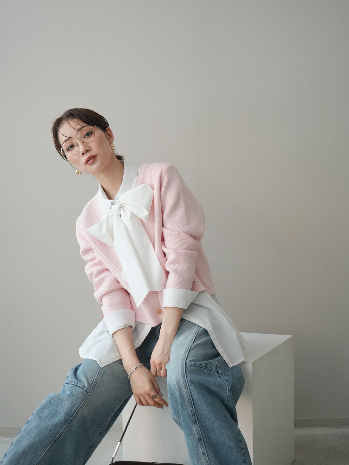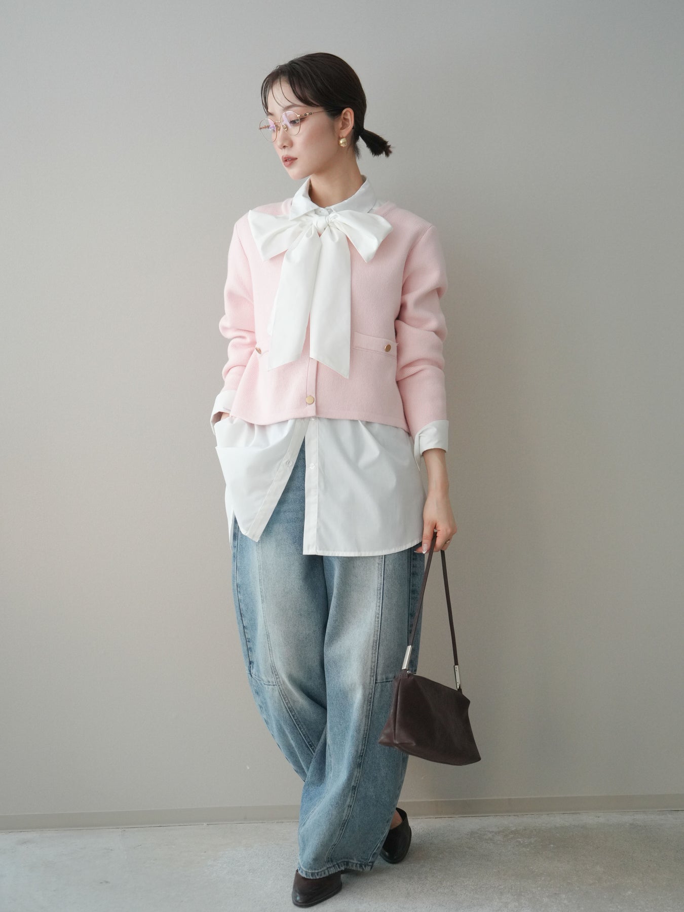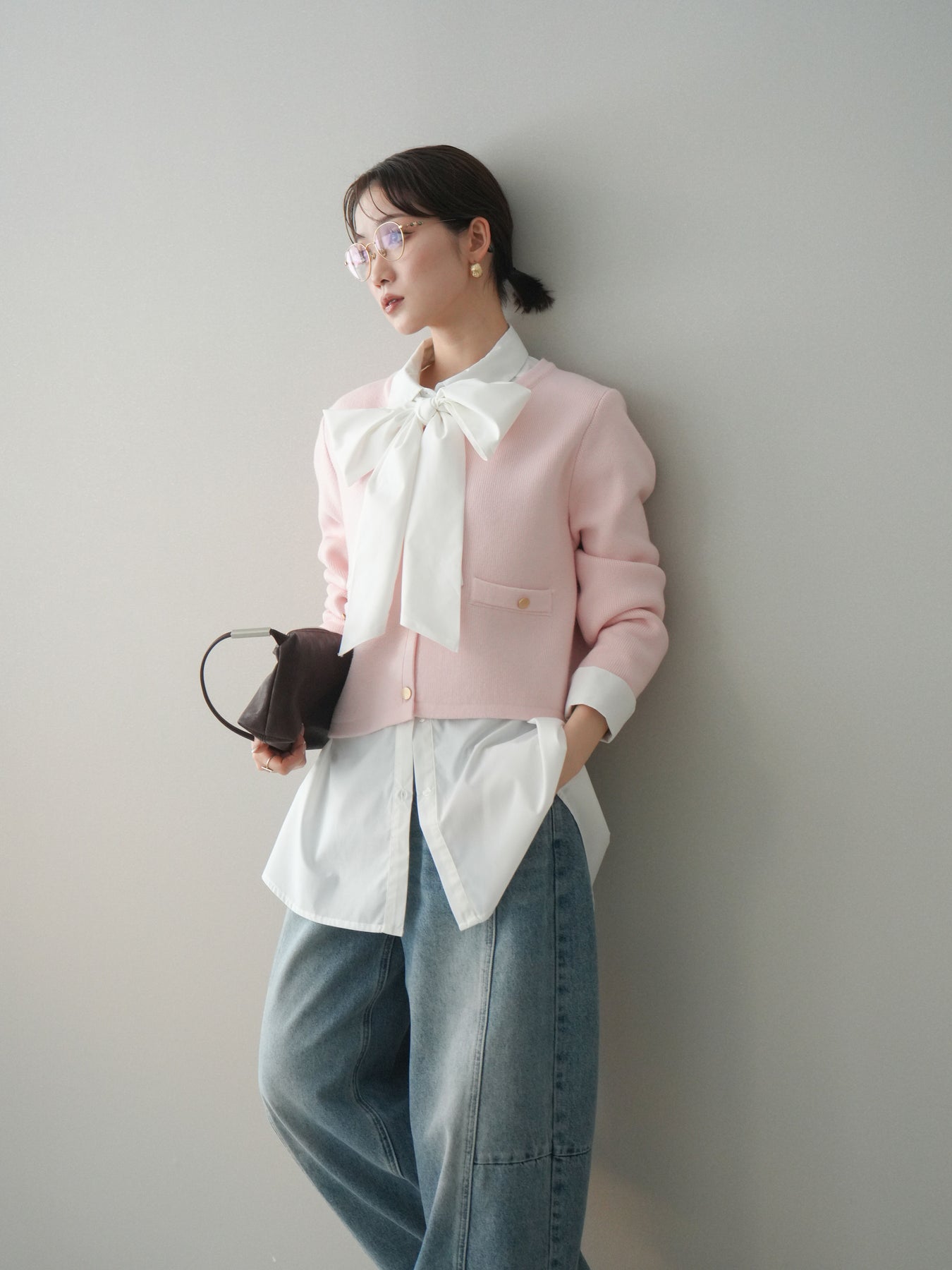 程よく力の抜けたシルエットに、ゴールドボタンがアクセントとして映えるノーカラーニットジャケット。 柔らかなニット素材ならではの軽やかさがあり、アウター感覚というよりも、カーディガンに近い感覚で取り入れやすい一枚です。 ノーカラーデザインですっきりとした首元に仕上がり、インナーやアクセサリーの合わせ方次第で印象に変化をつけられるのも魅力。 コンパクトすぎない丈感で、ボトムスとのバランスが取りやすく、ラフなアイテムと合わせても全体をきれいにまとめてくれます。 日常使いから少し整えたいシーンまで、幅広く活躍するニットジャケットです。 ※ボトムス、キャミソール(インナー)以外の商品は一律でインナーは付属していません。