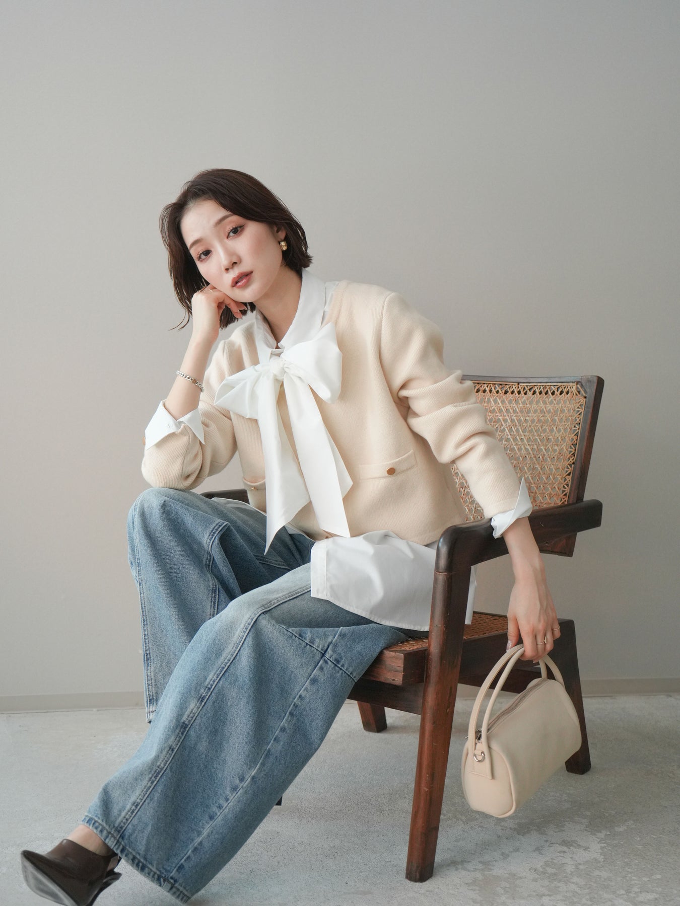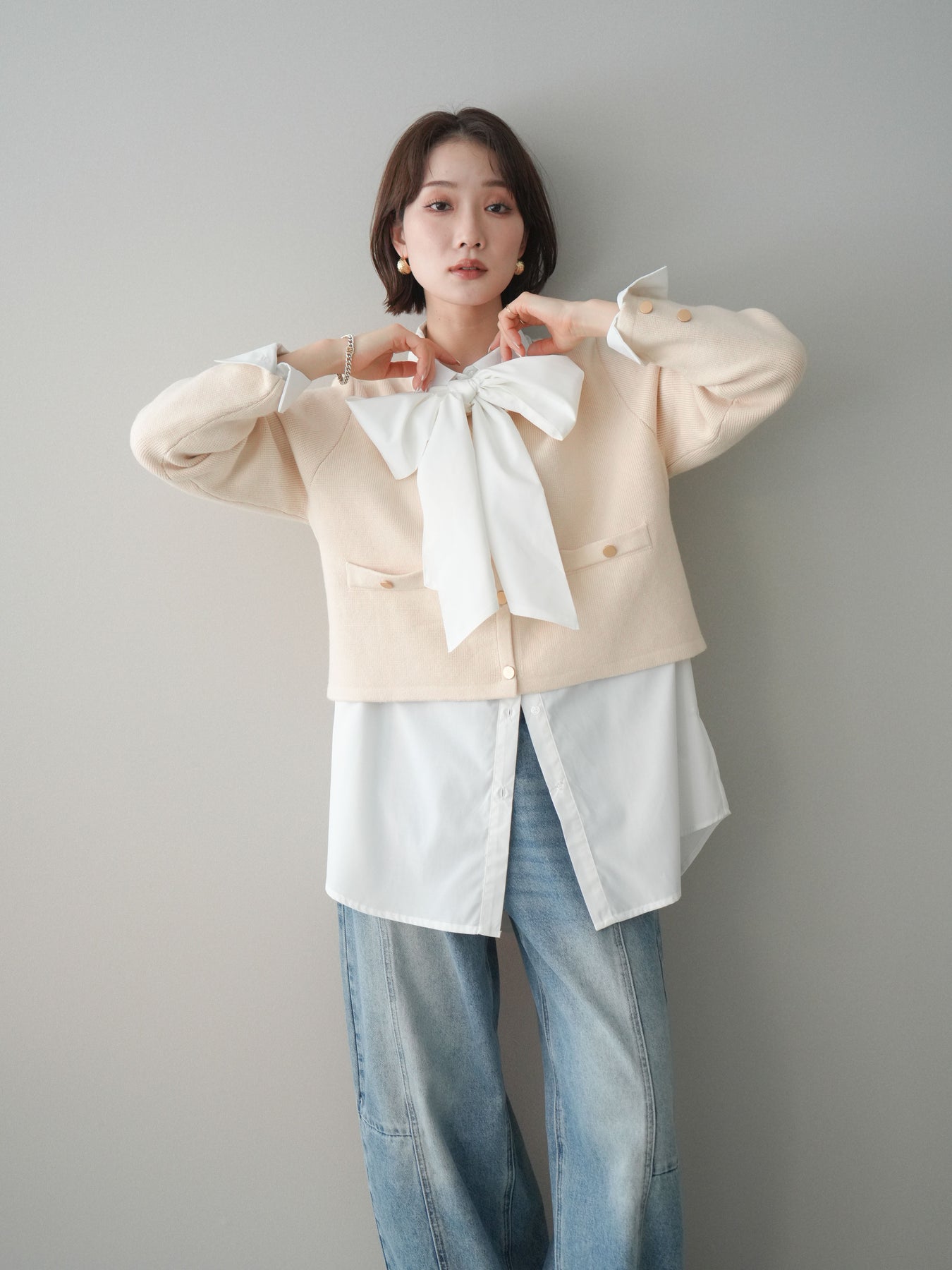 [SET]ゴールドボタンノーカラーニットジャケット+ガーメントウォッシュカーブデニムパンツ(2set)