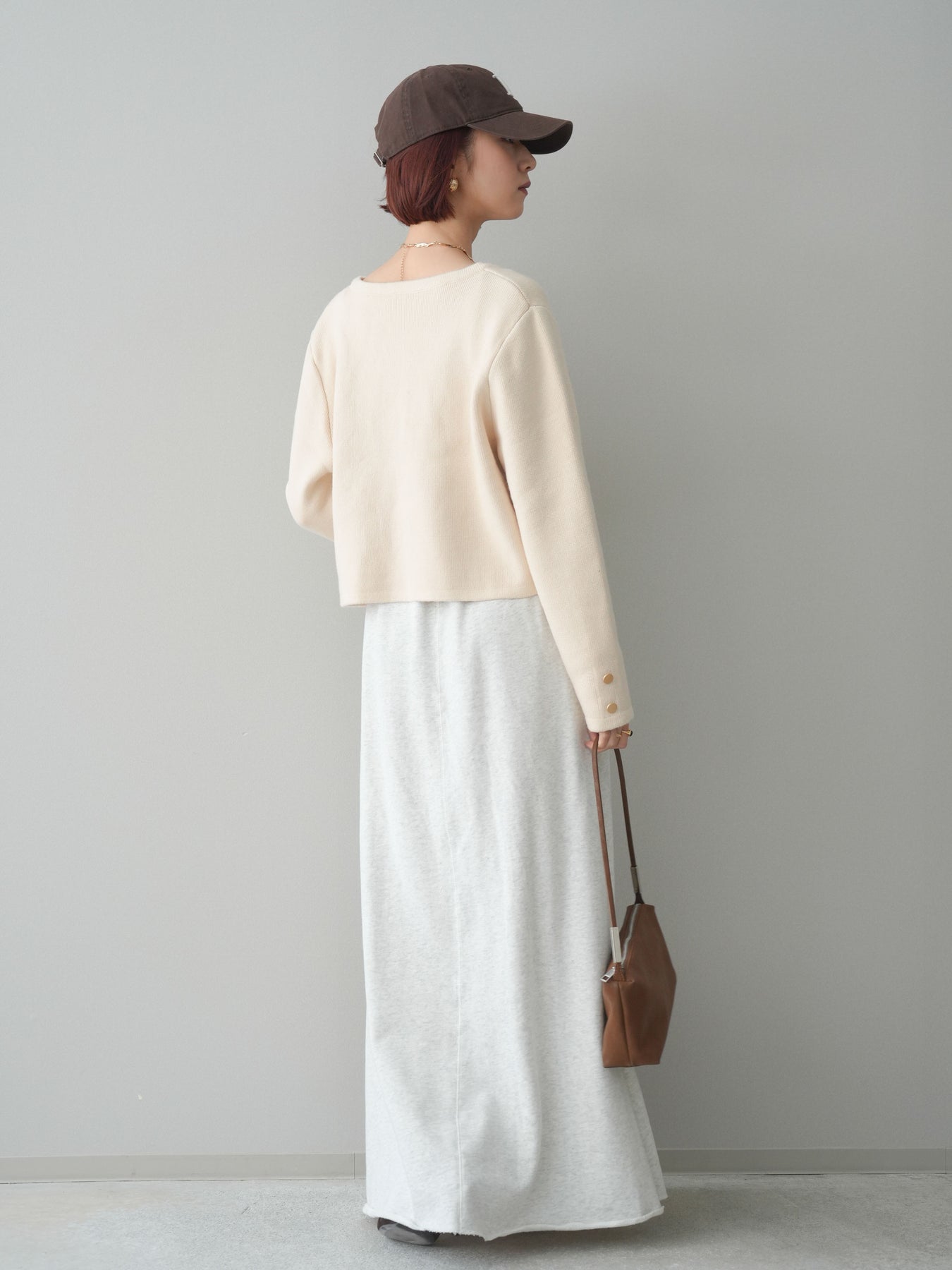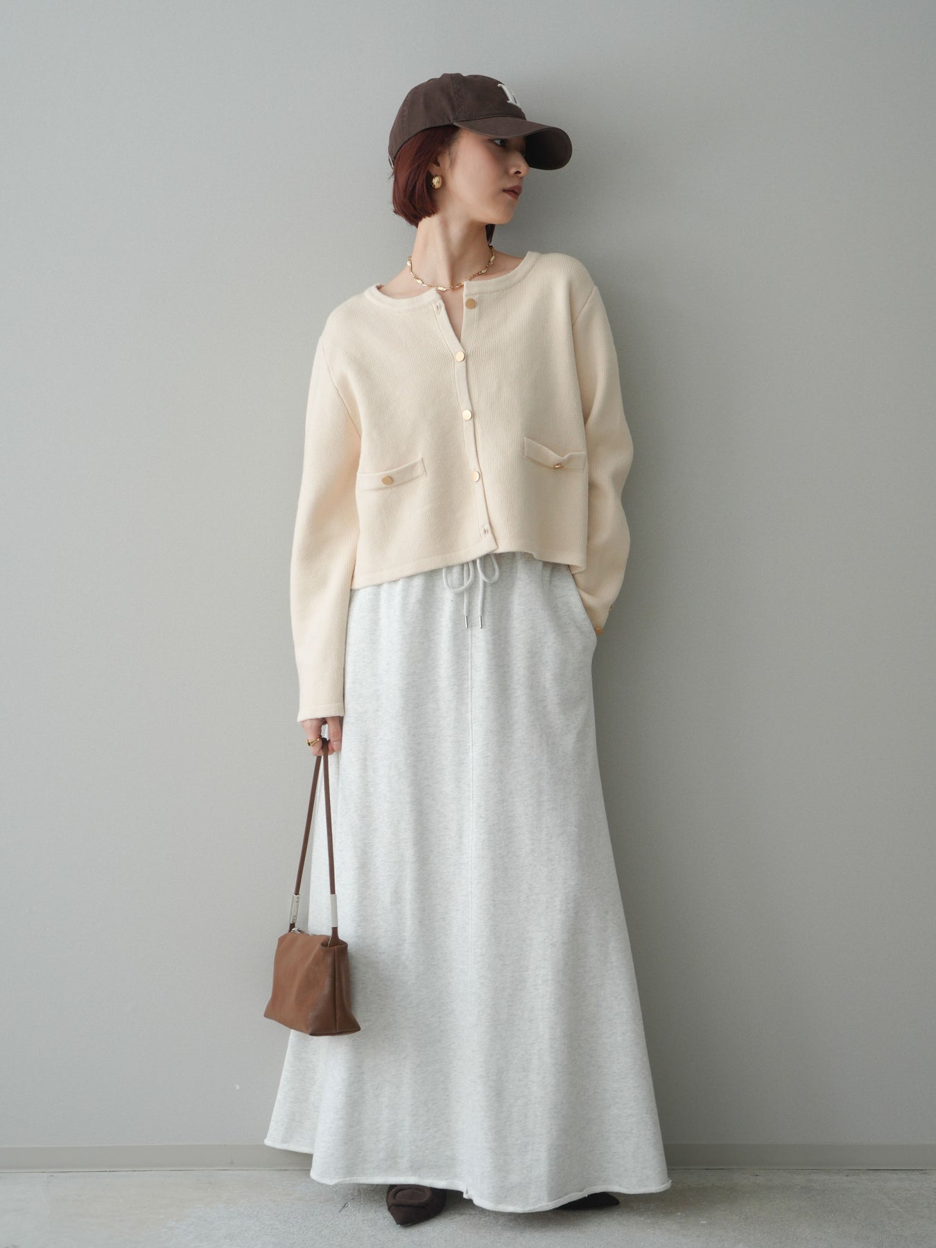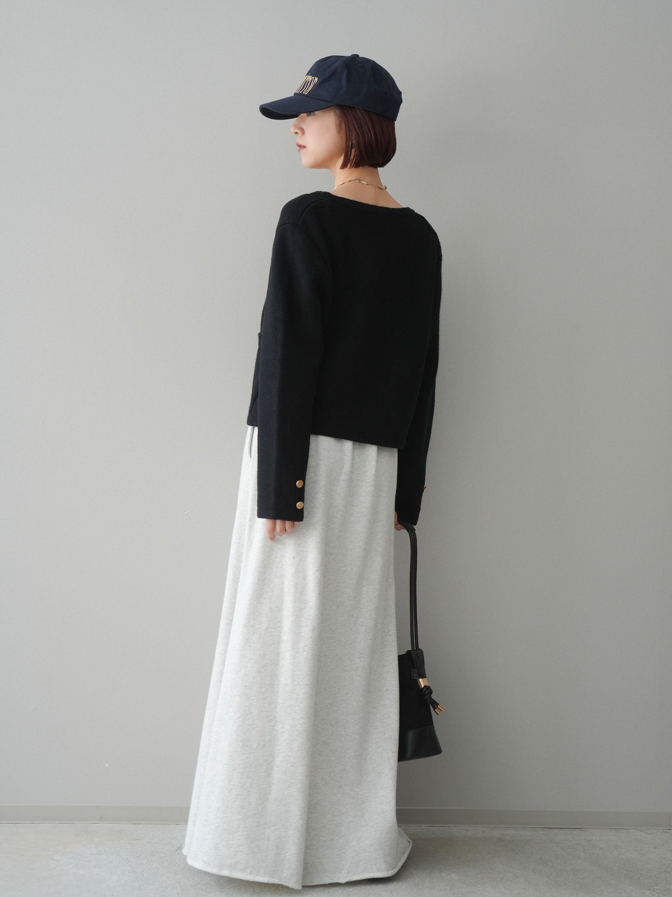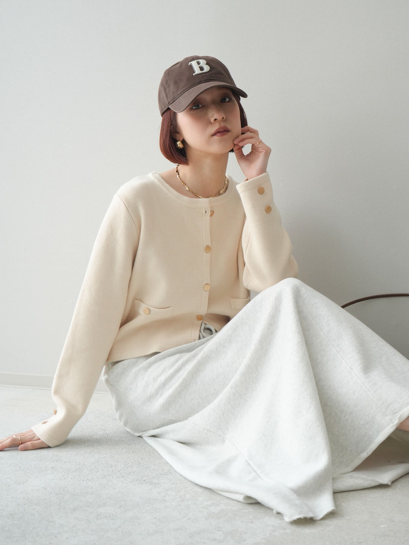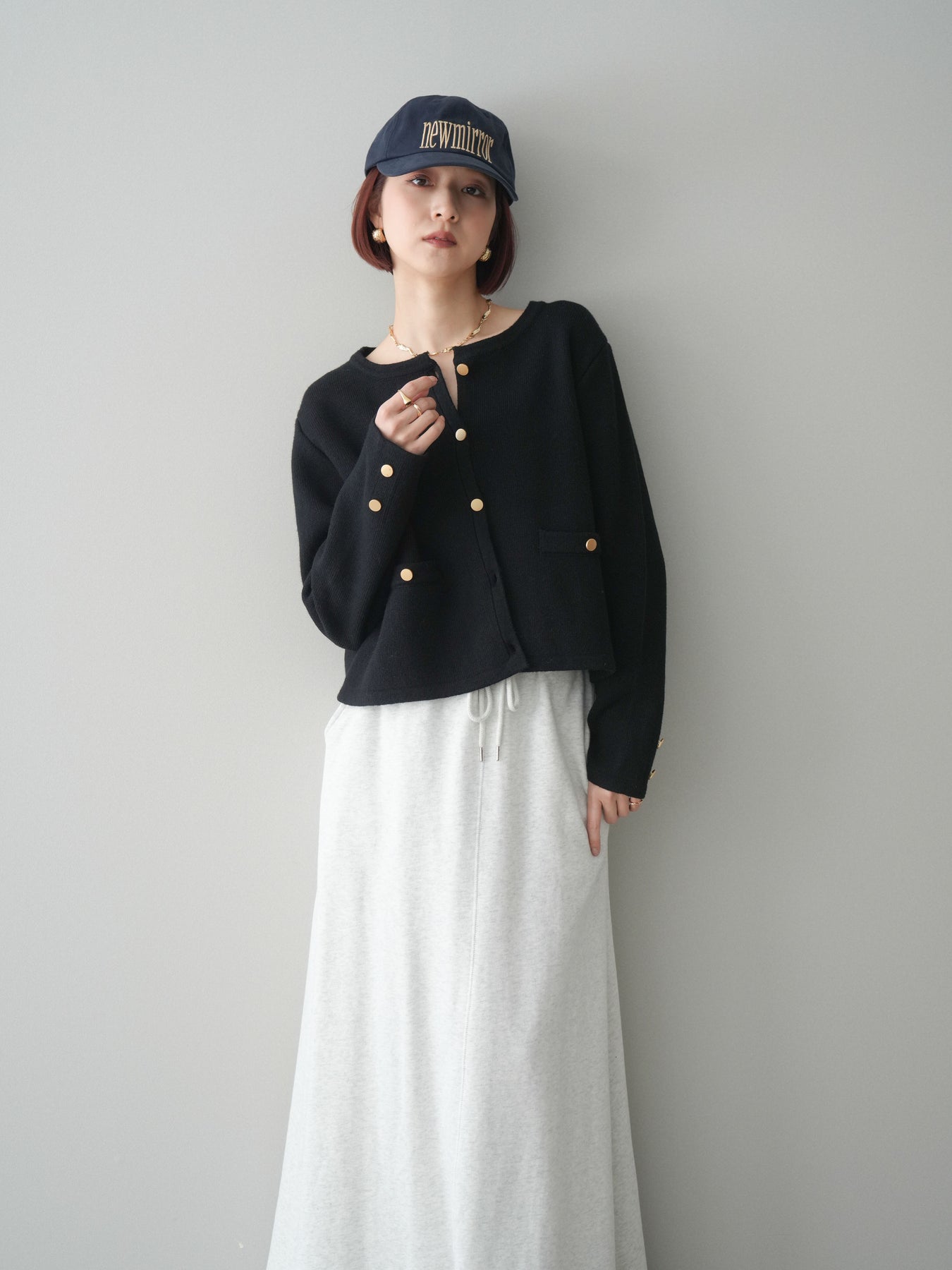 [SET]ゴールドボタンノーカラーニットジャケット+スウェットフレアロングスカート(2set)