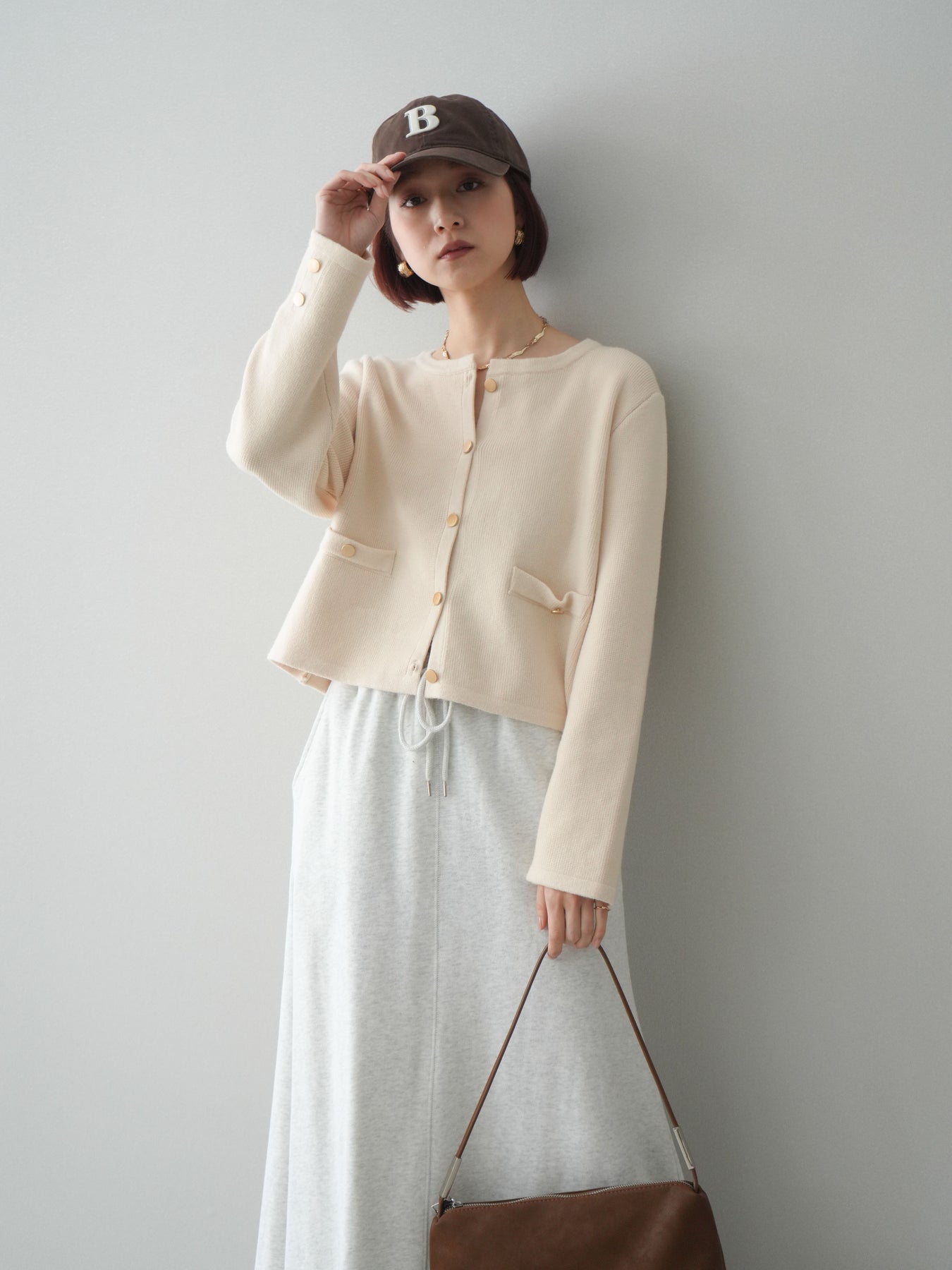 程よく力の抜けたシルエットに、ゴールドボタンがアクセントとして映えるノーカラーニットジャケット。 柔らかなニット素材ならではの軽やかさがあり、アウター感覚というよりも、カーディガンに近い感覚で取り入れやすい一枚です。 ノーカラーデザインですっきりとした首元に仕上がり、インナーやアクセサリーの合わせ方次第で印象に変化をつけられるのも魅力。 コンパクトすぎない丈感で、ボトムスとのバランスが取りやすく、ラフなアイテムと合わせても全体をきれいにまとめてくれます。 日常使いから少し整えたいシーンまで、幅広く活躍するニットジャケットです。 ※ボトムス、キャミソール(インナー)以外の商品は一律でインナーは付属していません。