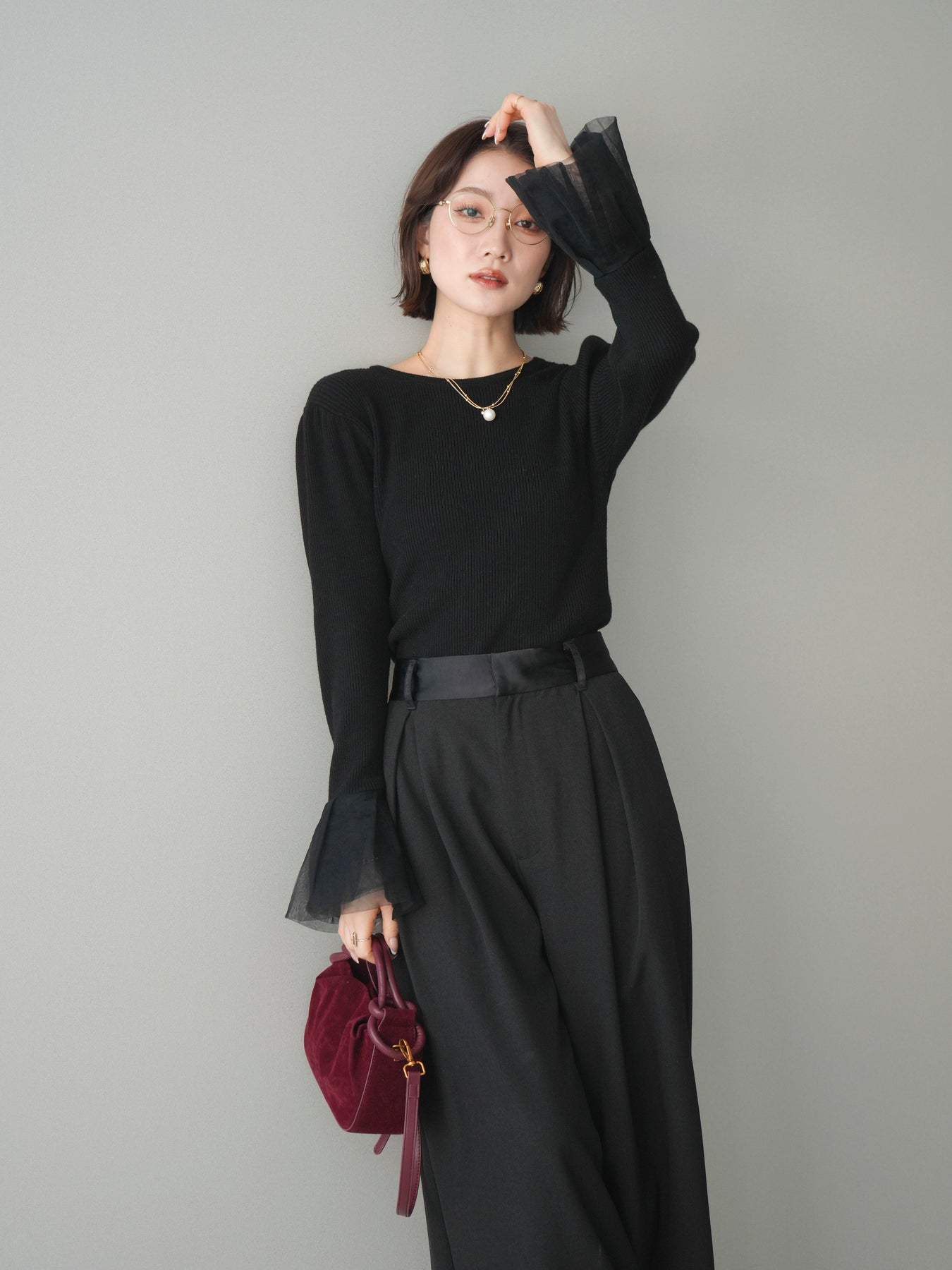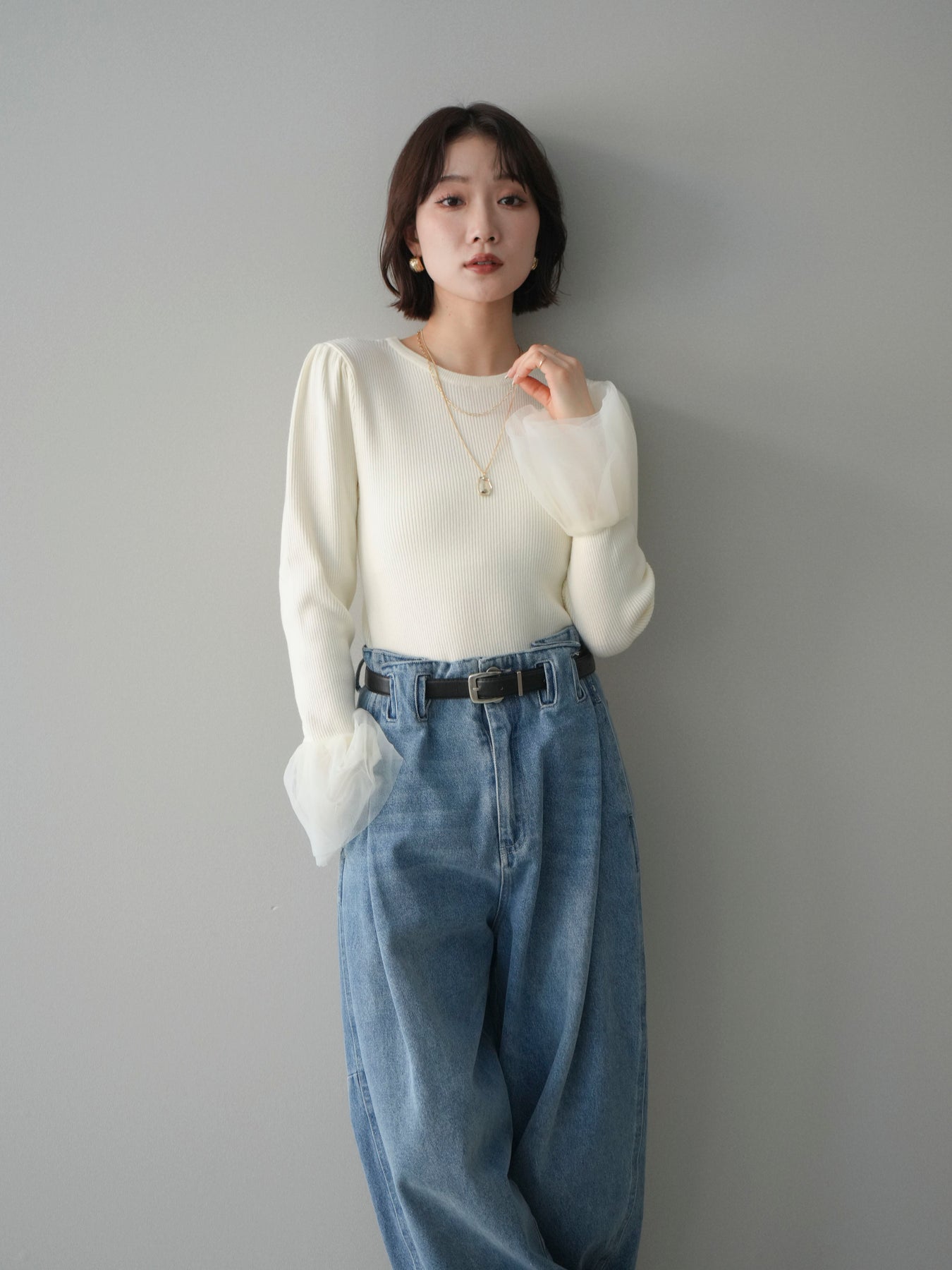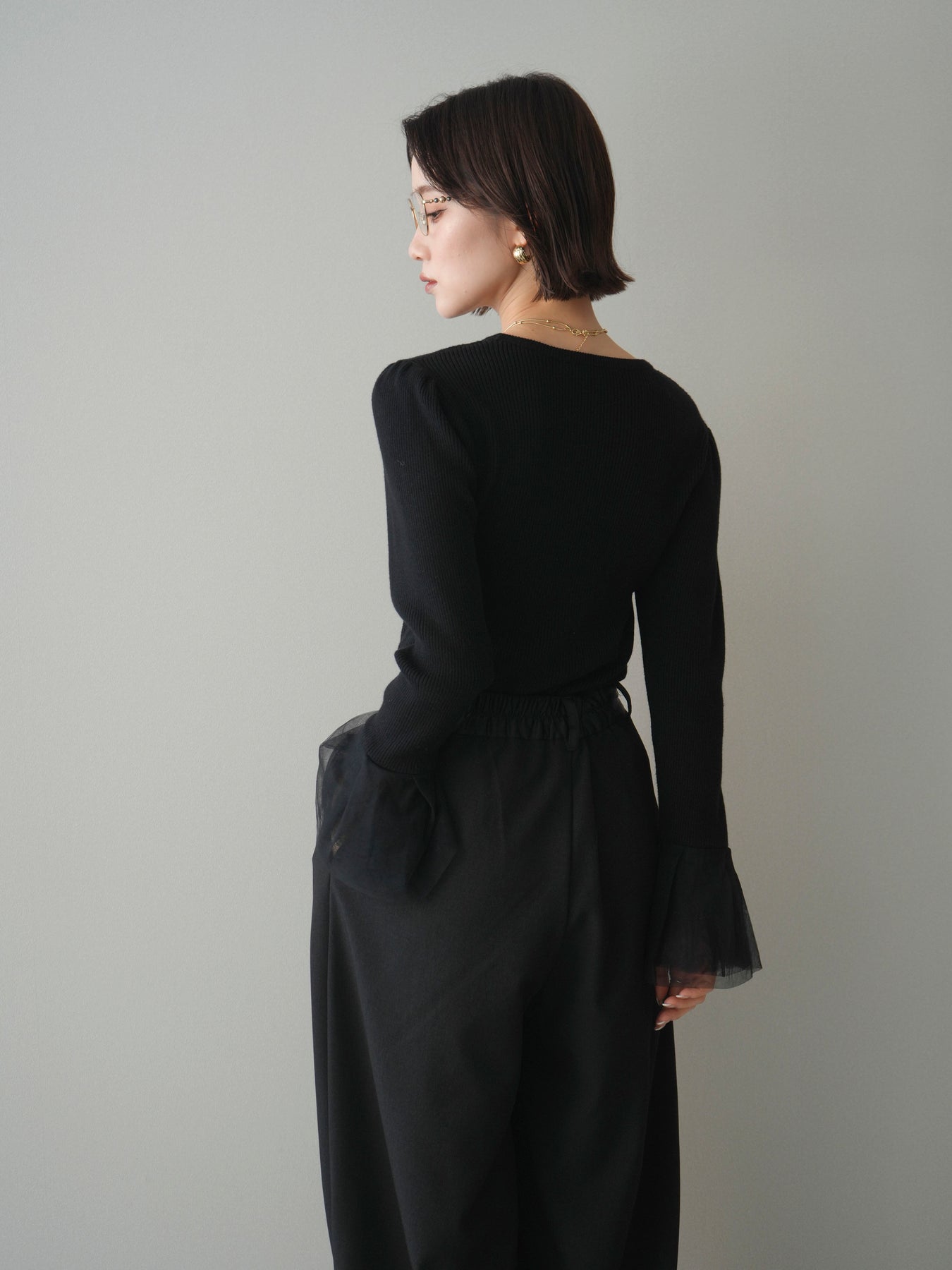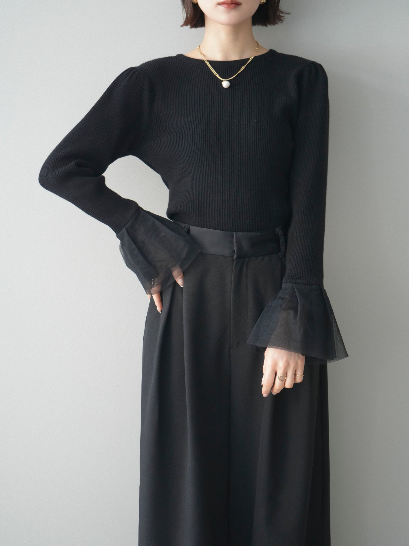 [SET]袖チュールパワショルリブニットトップス+選べるアクセセット(2set)