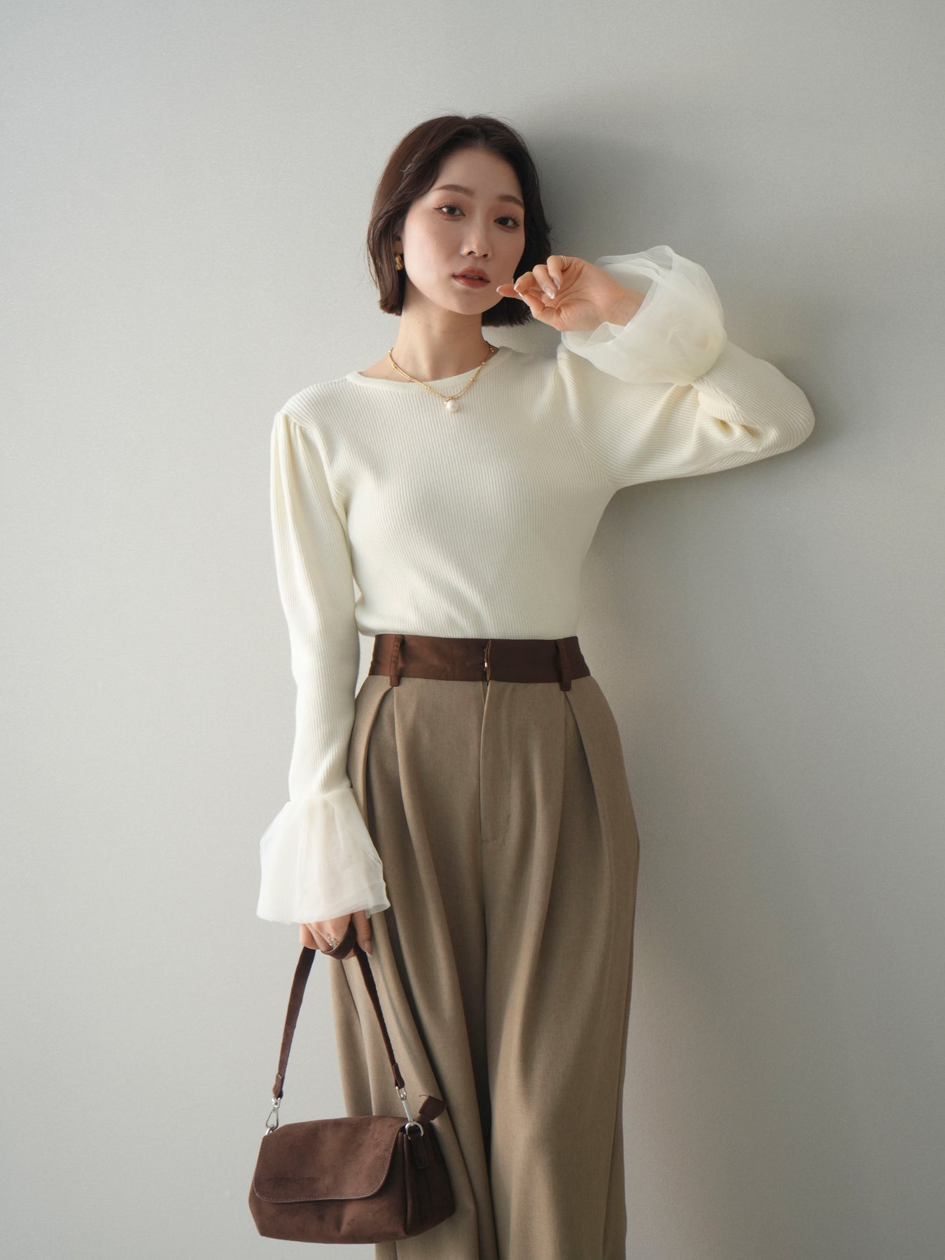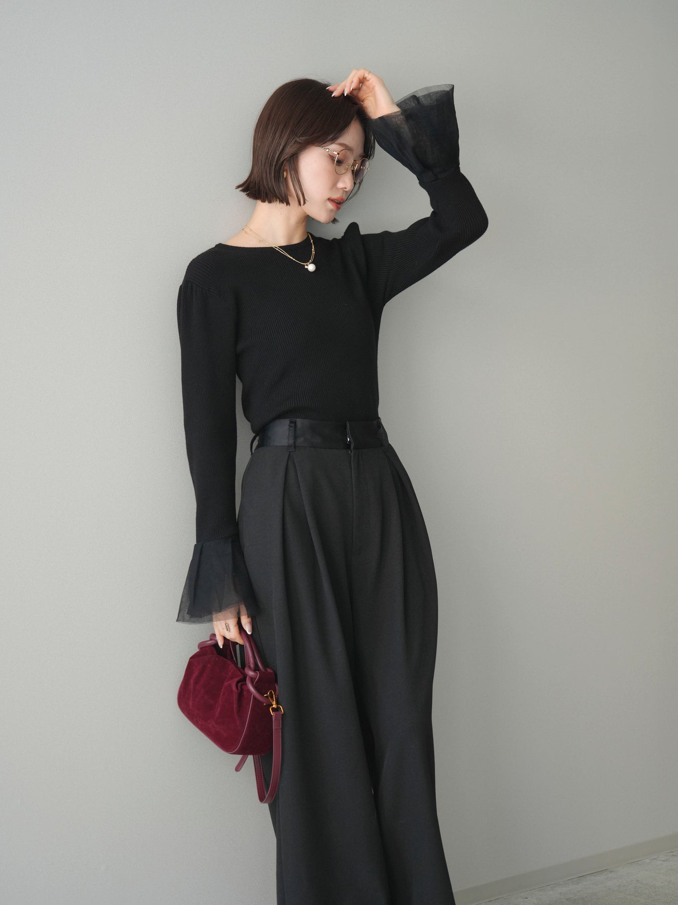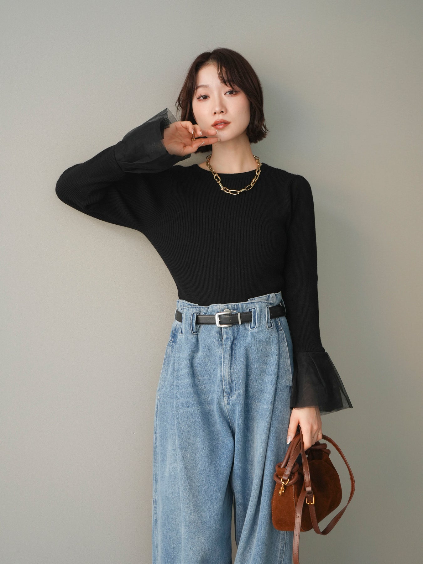 [SET]袖チュールパワショルリブニットトップス+選べるアクセセット(2set)