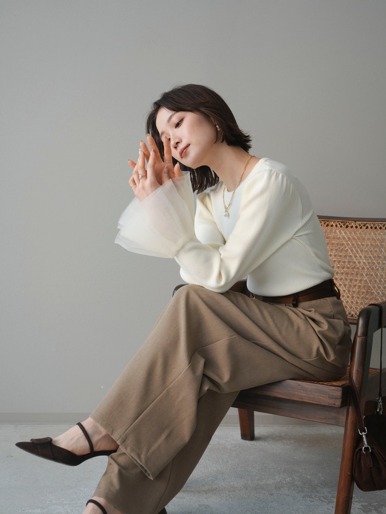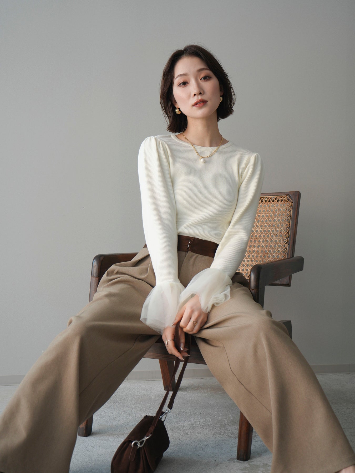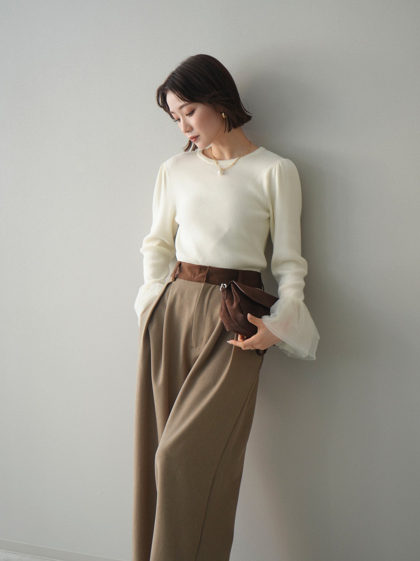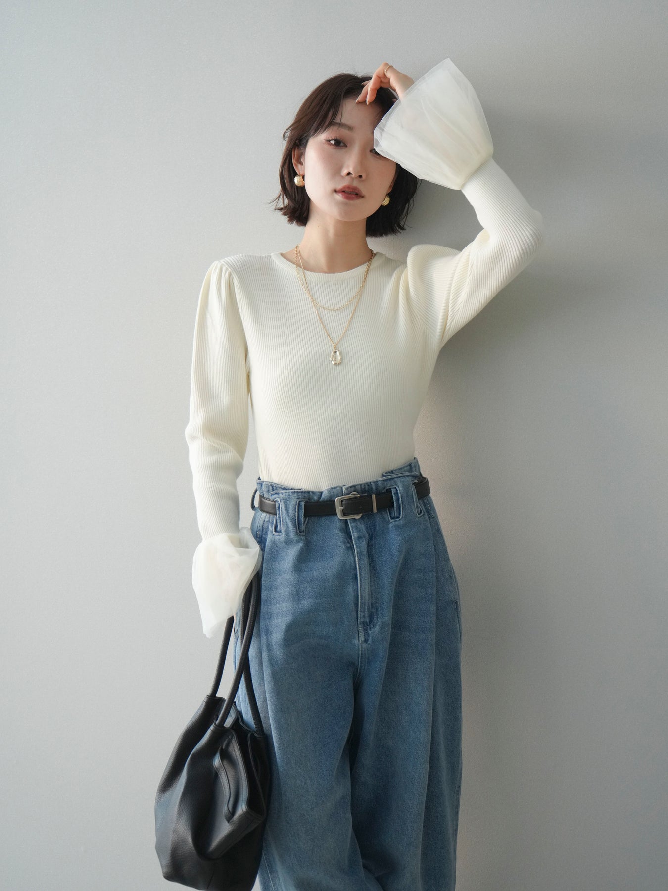 [SET]袖チュールパワショルリブニットトップス+選べるアクセセット(2set)