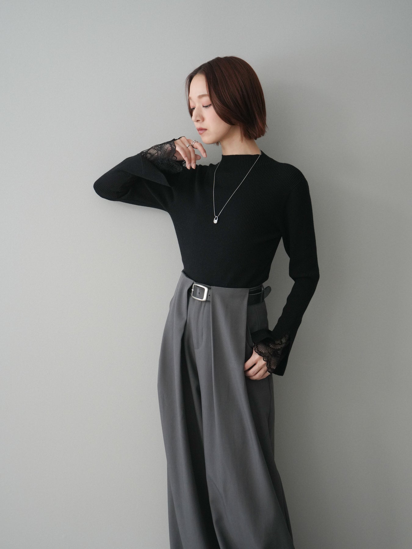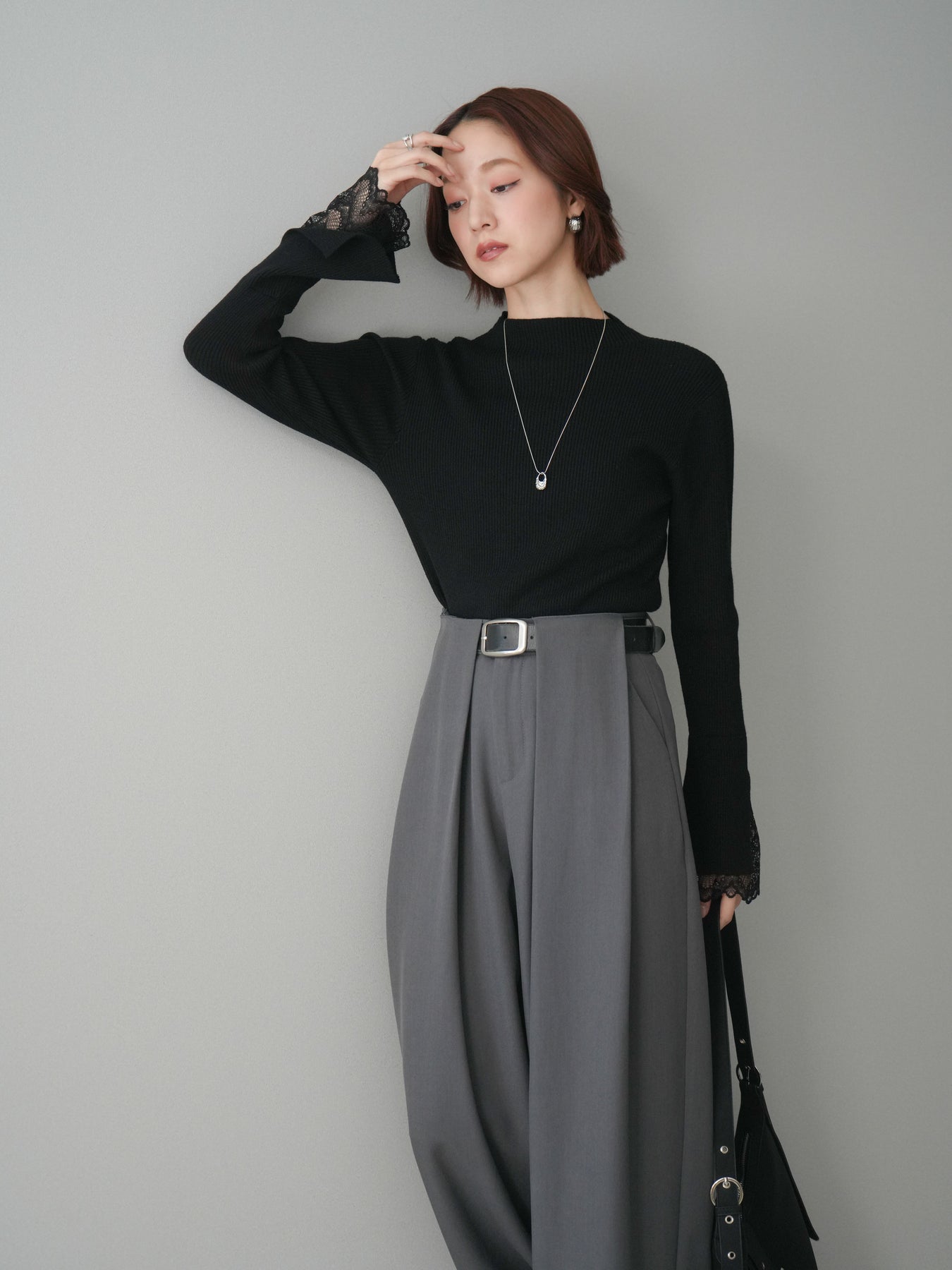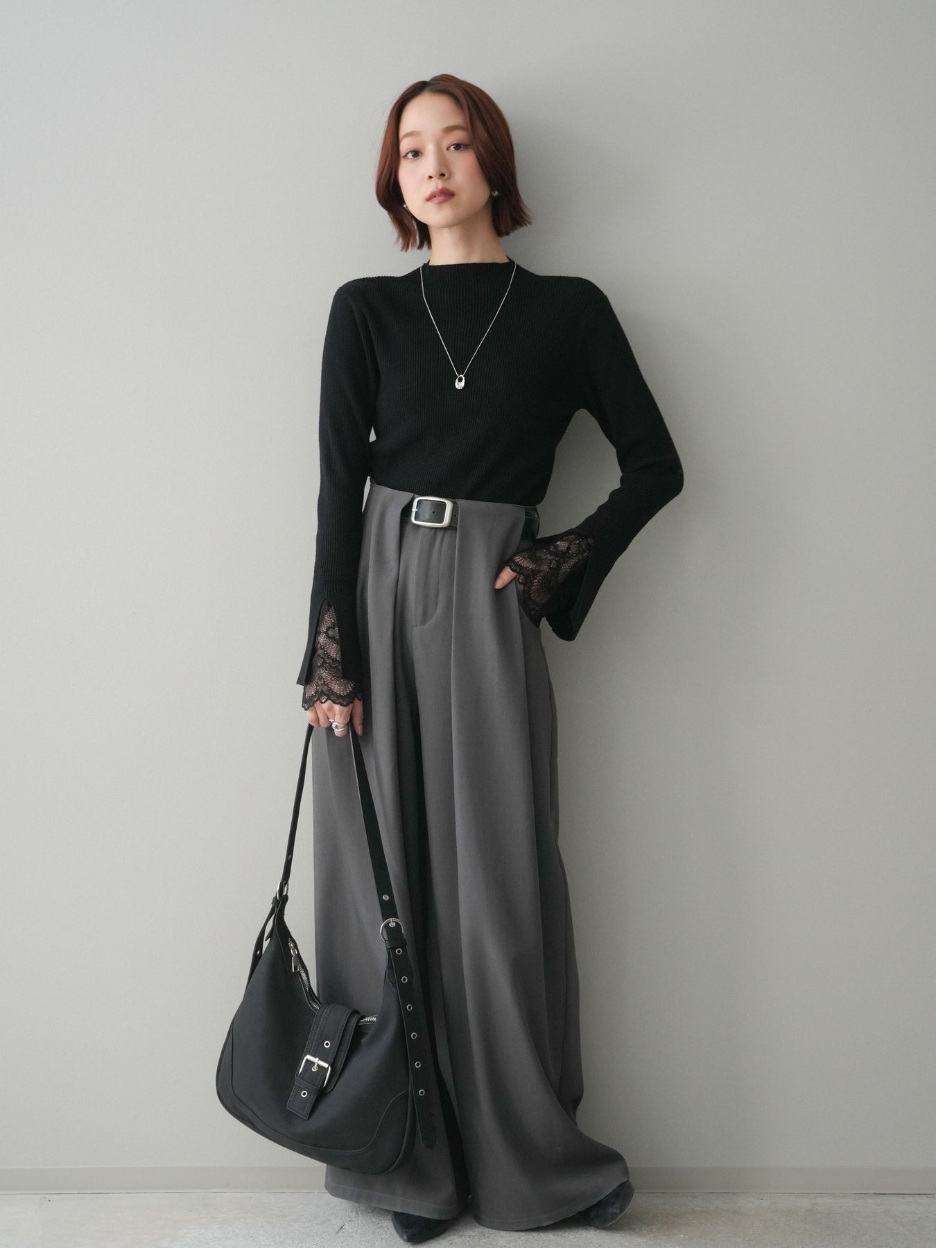 [SET]袖スカラップレースオフネックニットトップス+ベルトループデザインワイドパンツ(2set)