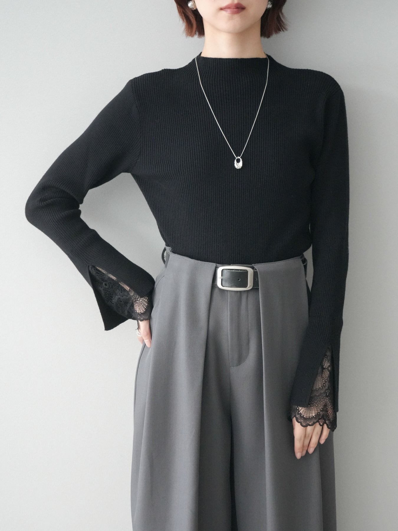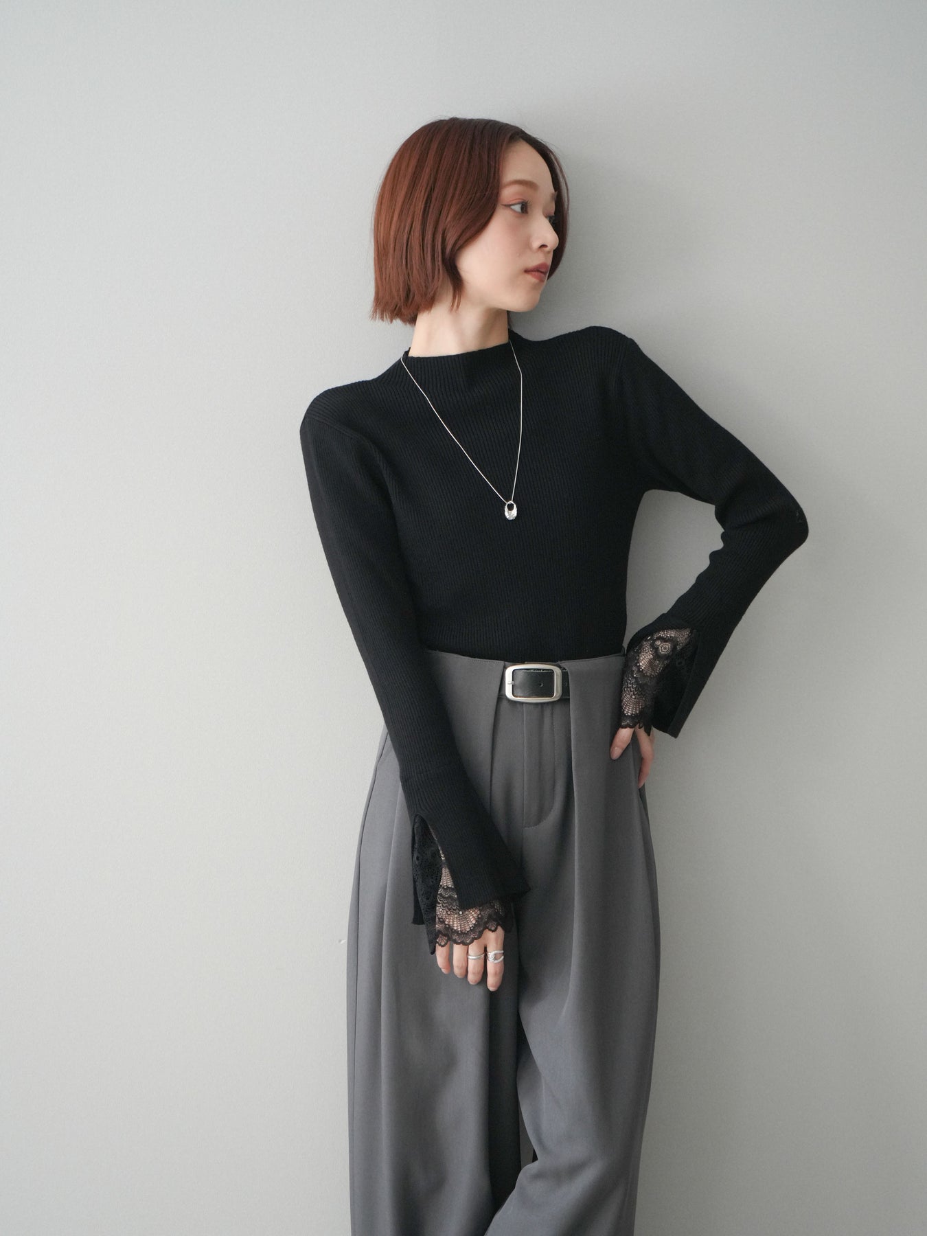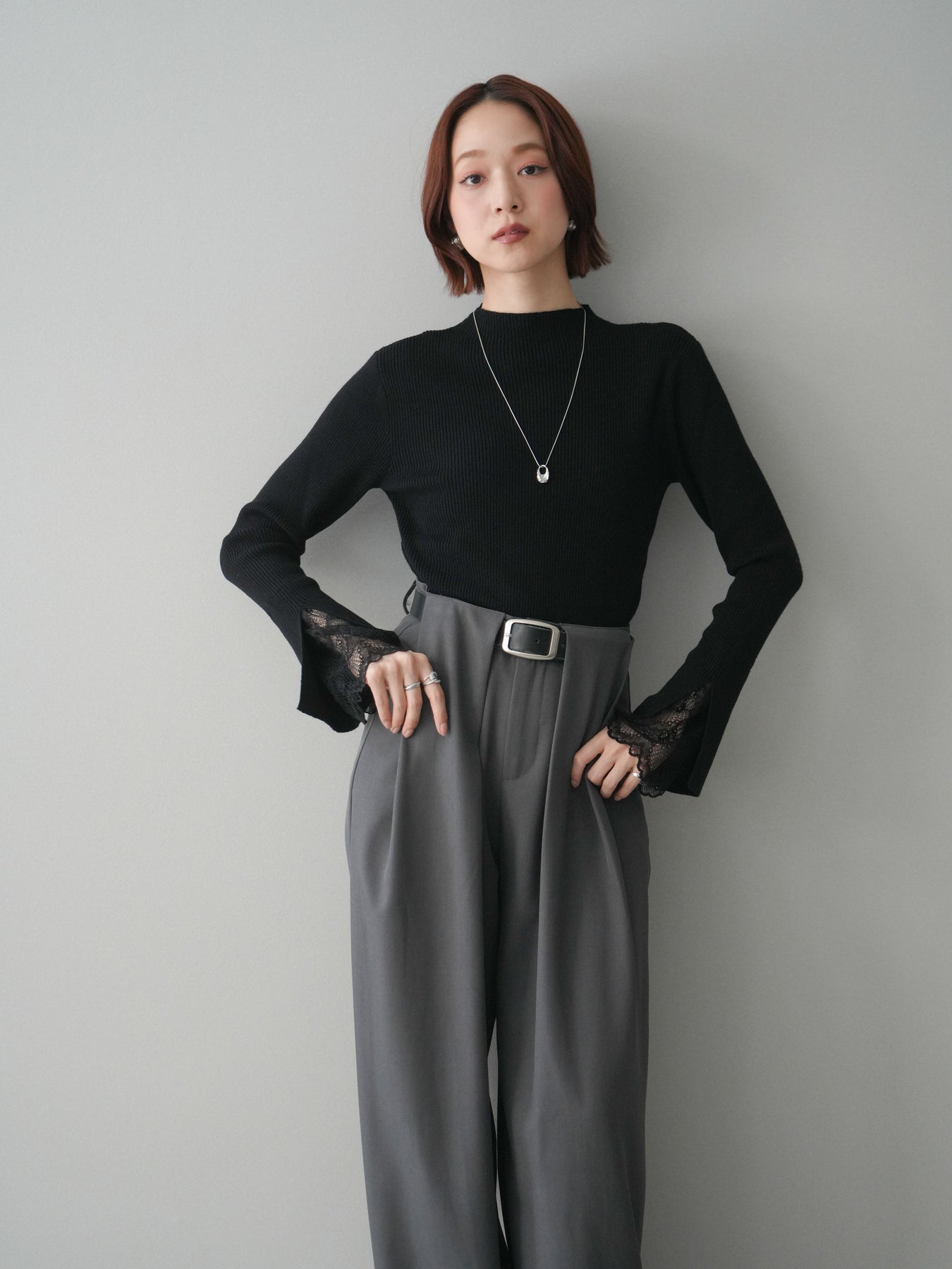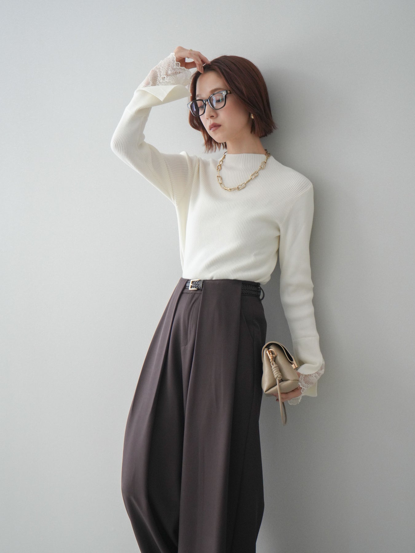 袖口にあしらったスカラップレースが、さりげないアクセントになるオフネックニットトップス。 首元は程よく高さのあるオフネック仕様で、顔まわりにやわらかな印象を添えつつ、上品なバランスに仕上げています。 身頃は縦ラインを強調するリブ編みで、すっきりとしたシルエットをキープ。 袖先から覗く繊細なレースが動きに合わせて表情を生み、シンプルな中に奥行きを感じさせる一枚です。 パンツやスカートとも合わせやすく、きれいめにもデイリーにも取り入れやすいデザイン。 レイヤードせずとも一枚でスタイリングが整う、頼れるニットトップスです。 ※ボトムス、キャミソール(インナー)以外の商品は一律でインナーは付属していません。
