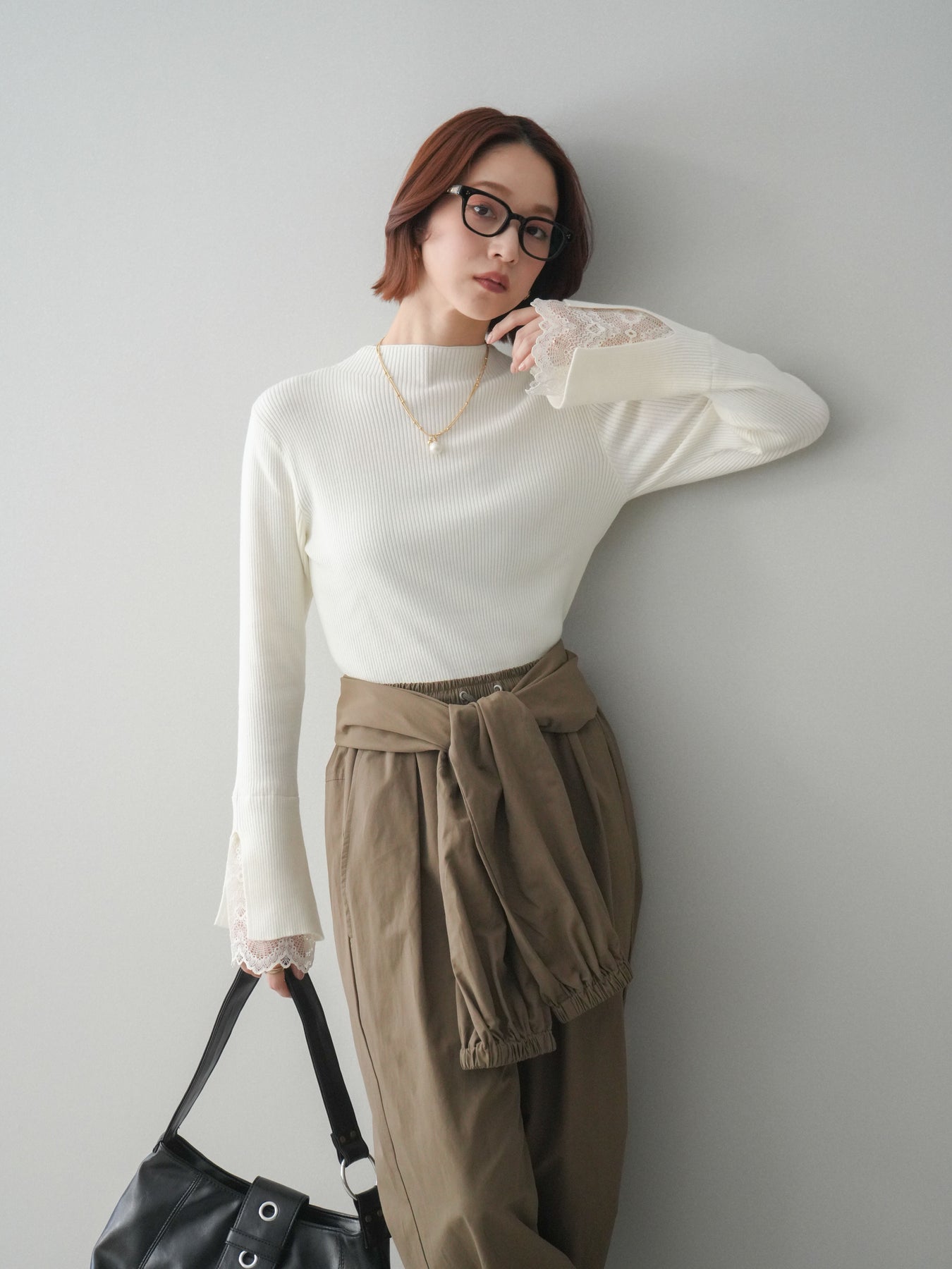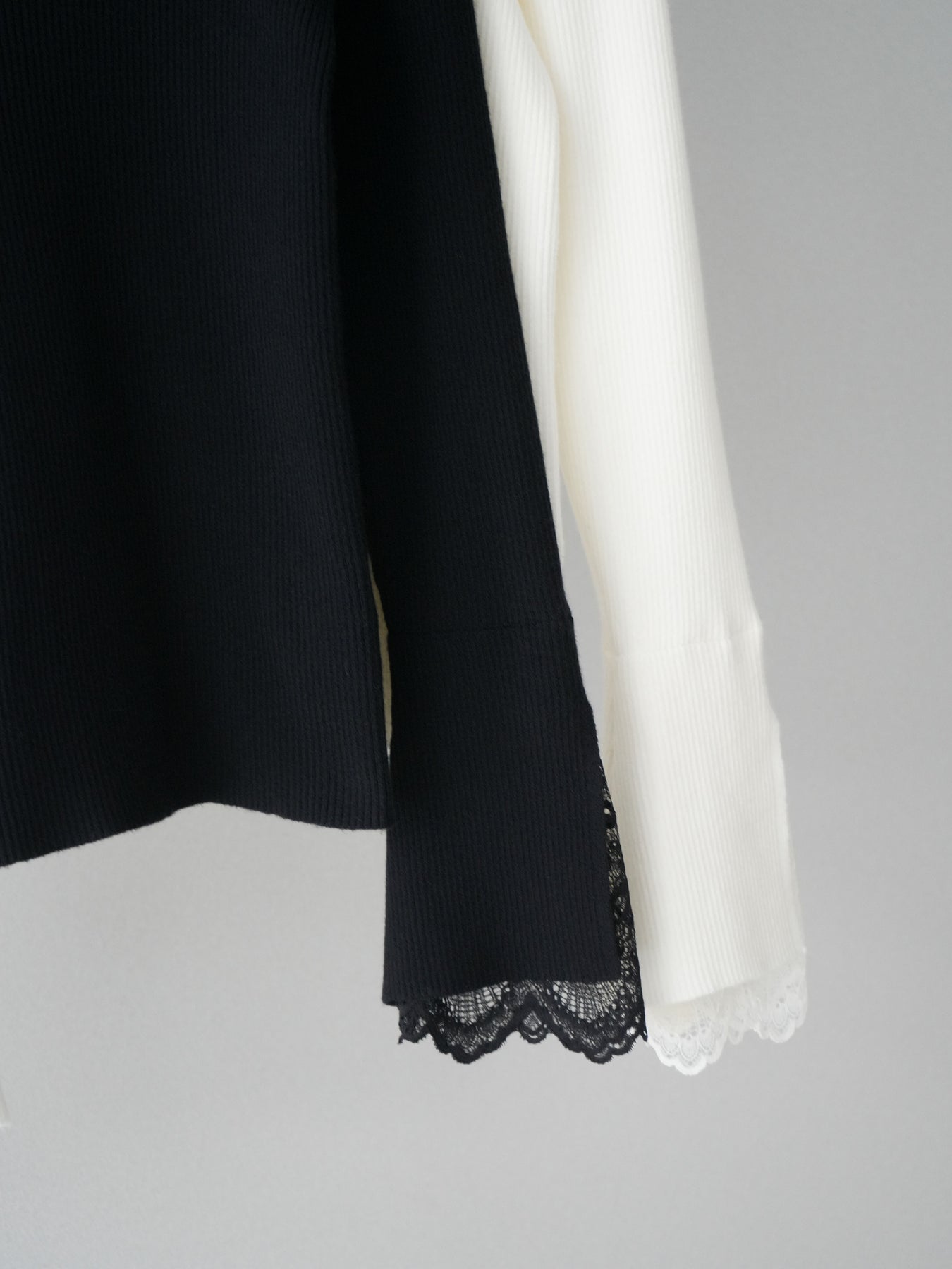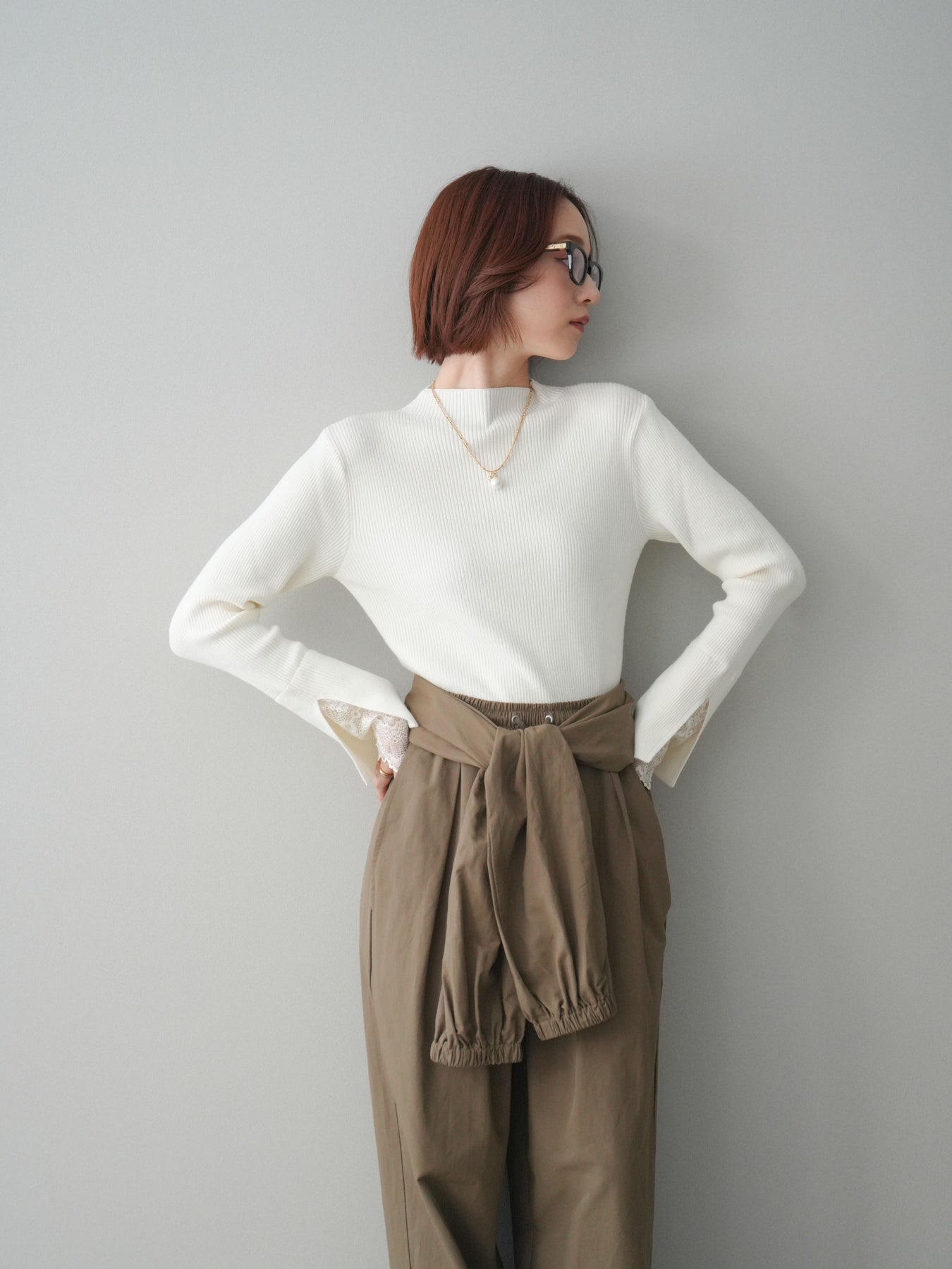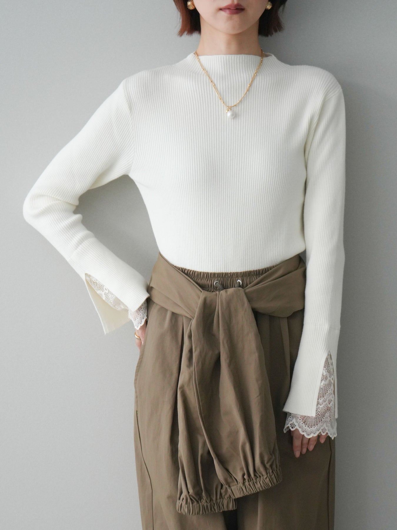 袖口にあしらったスカラップレースが、さりげないアクセントになるオフネックニットトップス。 首元は程よく高さのあるオフネック仕様で、顔まわりにやわらかな印象を添えつつ、上品なバランスに仕上げています。 身頃は縦ラインを強調するリブ編みで、すっきりとしたシルエットをキープ。 袖先から覗く繊細なレースが動きに合わせて表情を生み、シンプルな中に奥行きを感じさせる一枚です。 パンツやスカートとも合わせやすく、きれいめにもデイリーにも取り入れやすいデザイン。 レイヤードせずとも一枚でスタイリングが整う、頼れるニットトップスです。 ※ボトムス、キャミソール(インナー)以外の商品は一律でインナーは付属していません。