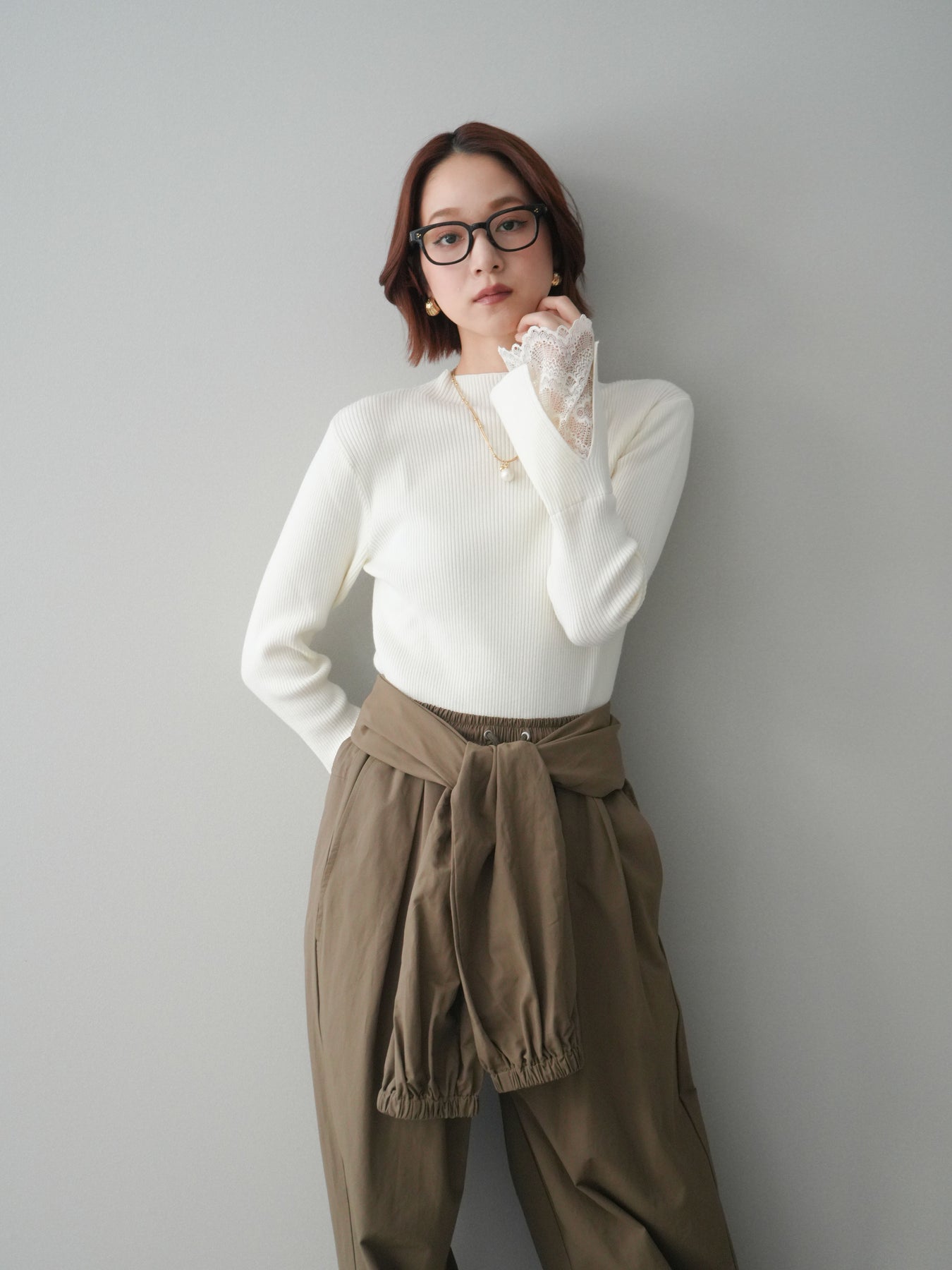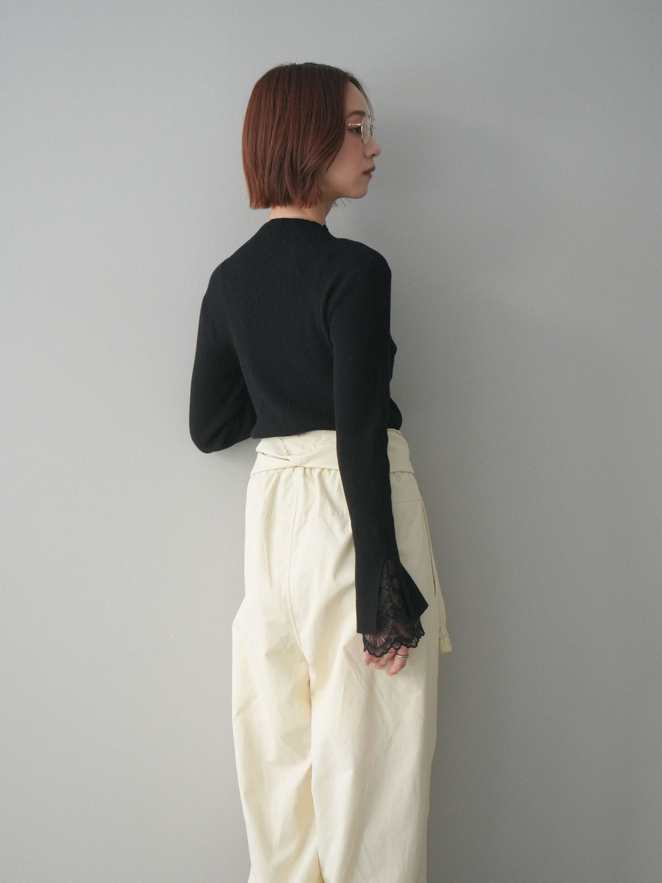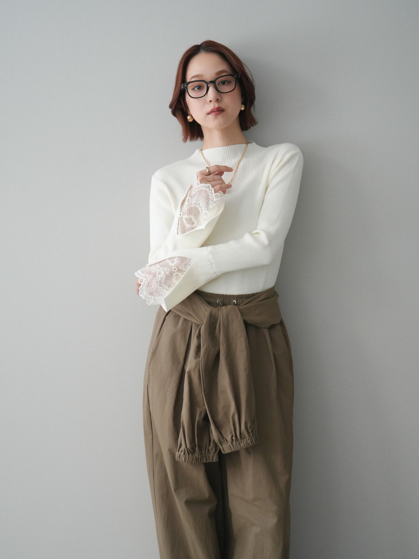 袖口にあしらったスカラップレースが、さりげないアクセントになるオフネックニットトップス。 首元は程よく高さのあるオフネック仕様で、顔まわりにやわらかな印象を添えつつ、上品なバランスに仕上げています。 身頃は縦ラインを強調するリブ編みで、すっきりとしたシルエットをキープ。 袖先から覗く繊細なレースが動きに合わせて表情を生み、シンプルな中に奥行きを感じさせる一枚です。 パンツやスカートとも合わせやすく、きれいめにもデイリーにも取り入れやすいデザイン。 レイヤードせずとも一枚でスタイリングが整う、頼れるニットトップスです。 ※ボトムス、キャミソール(インナー)以外の商品は一律でインナーは付属していません。