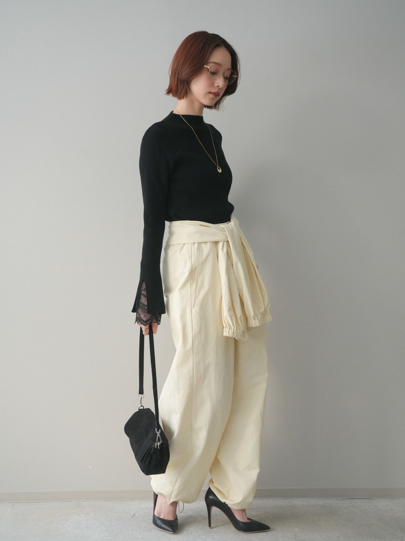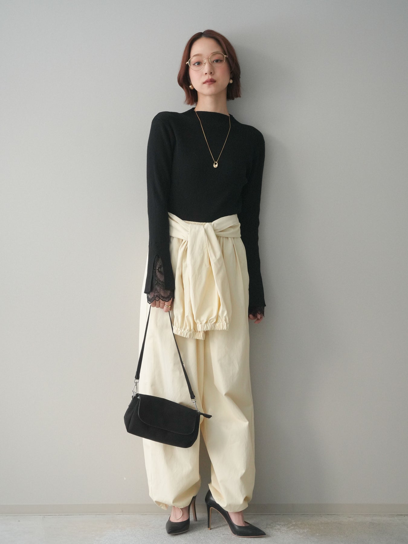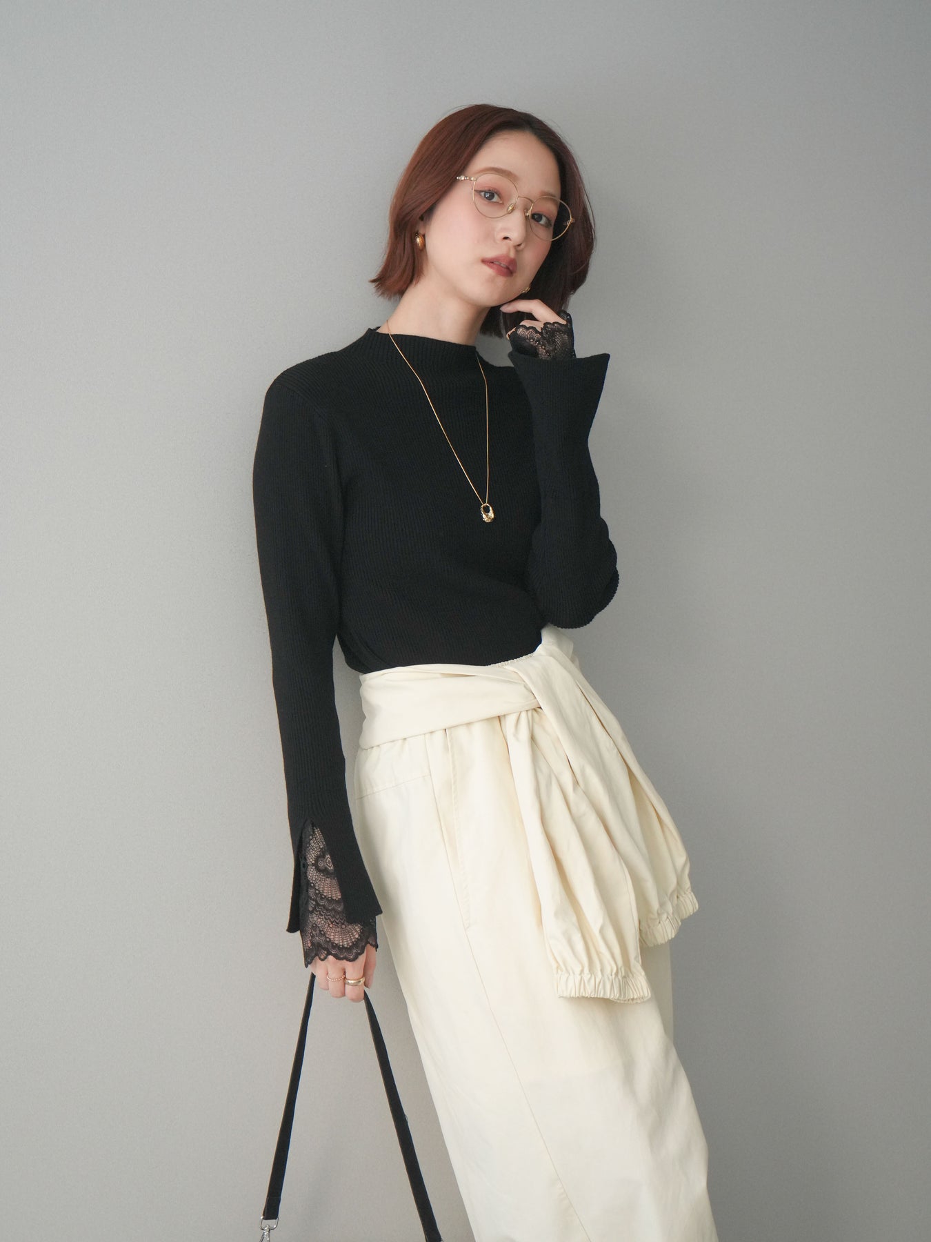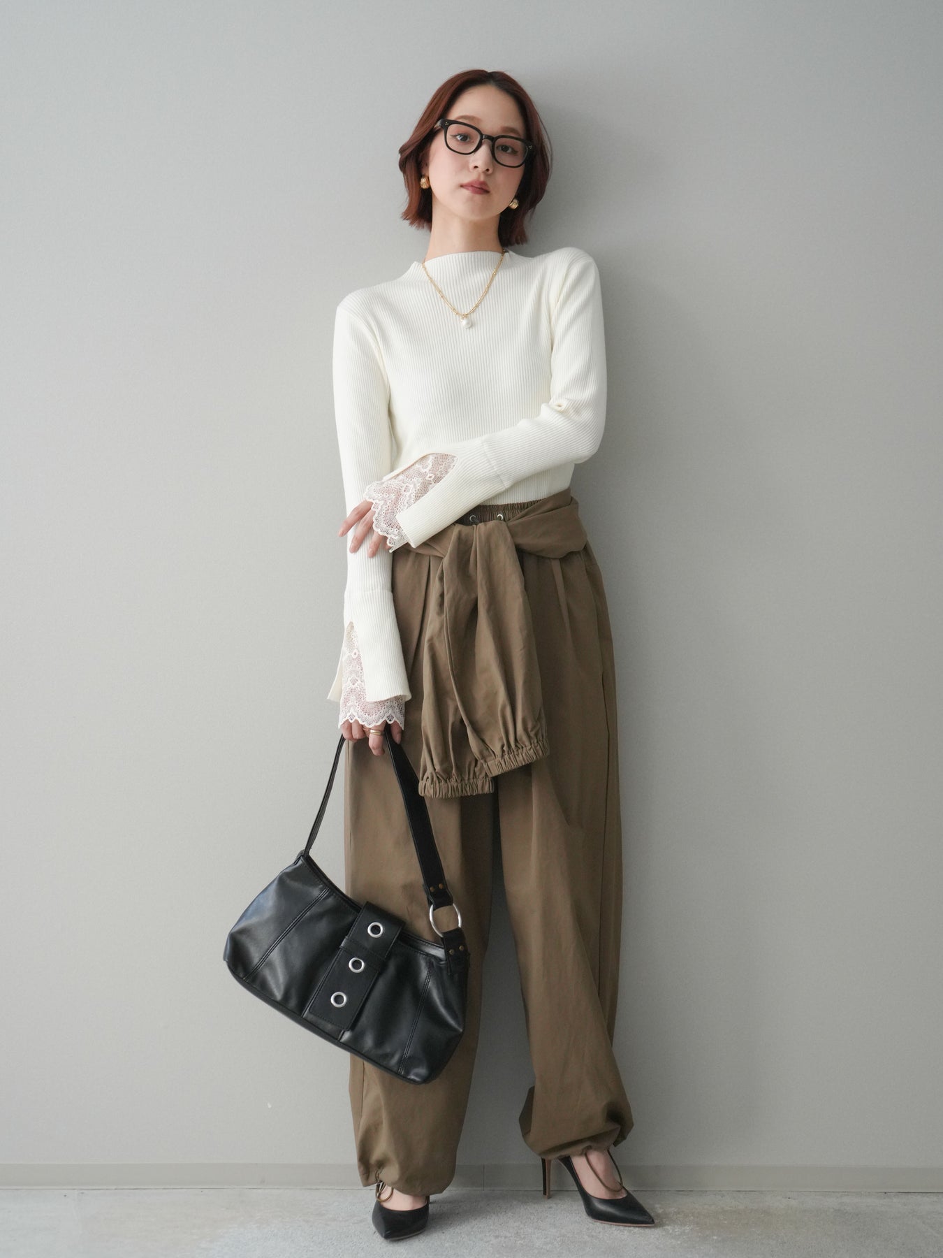 袖口にあしらったスカラップレースが、さりげないアクセントになるオフネックニットトップス。 首元は程よく高さのあるオフネック仕様で、顔まわりにやわらかな印象を添えつつ、上品なバランスに仕上げています。 身頃は縦ラインを強調するリブ編みで、すっきりとしたシルエットをキープ。 袖先から覗く繊細なレースが動きに合わせて表情を生み、シンプルな中に奥行きを感じさせる一枚です。 パンツやスカートとも合わせやすく、きれいめにもデイリーにも取り入れやすいデザイン。 レイヤードせずとも一枚でスタイリングが整う、頼れるニットトップスです。 ※ボトムス、キャミソール(インナー)以外の商品は一律でインナーは付属していません。