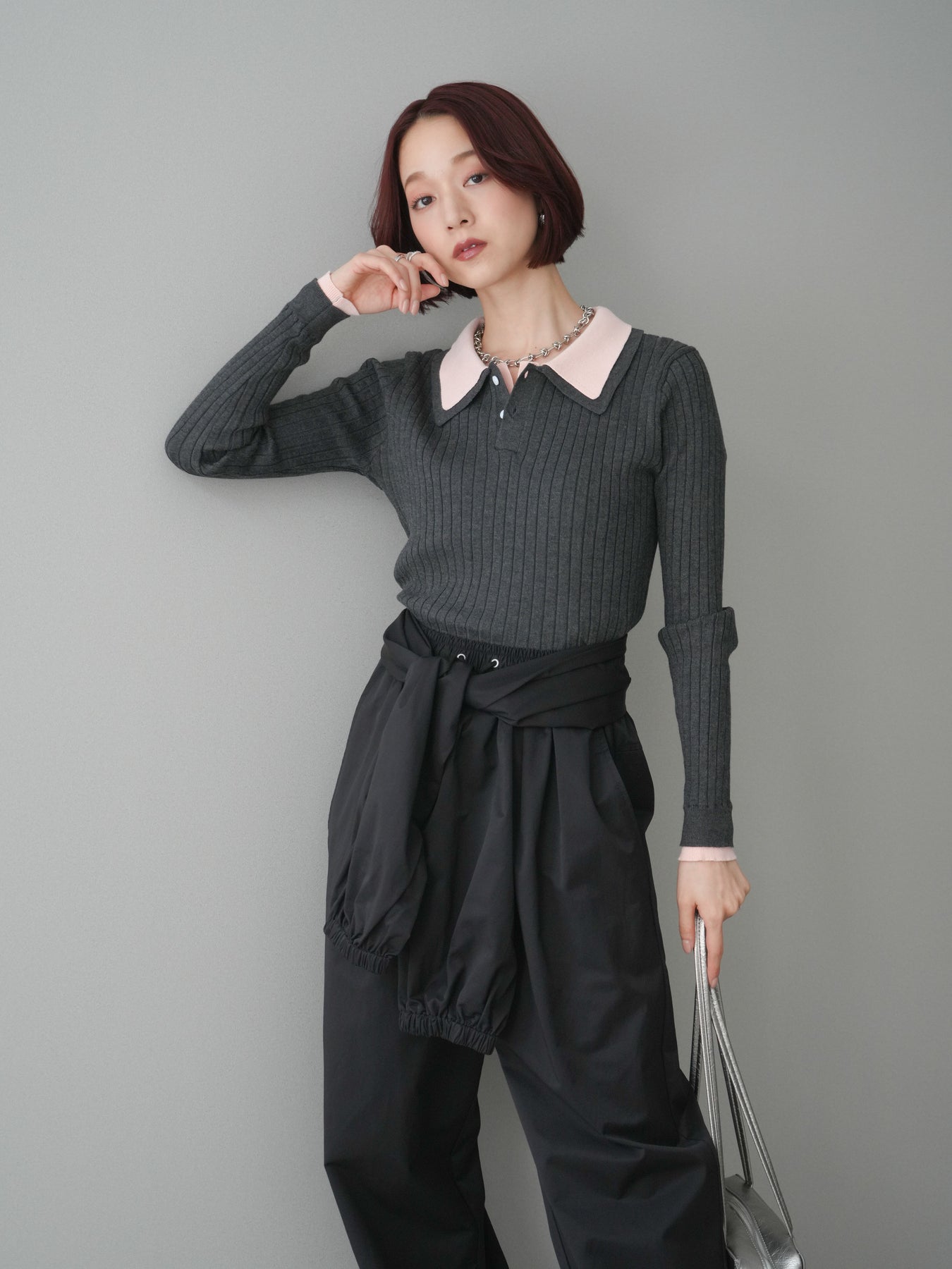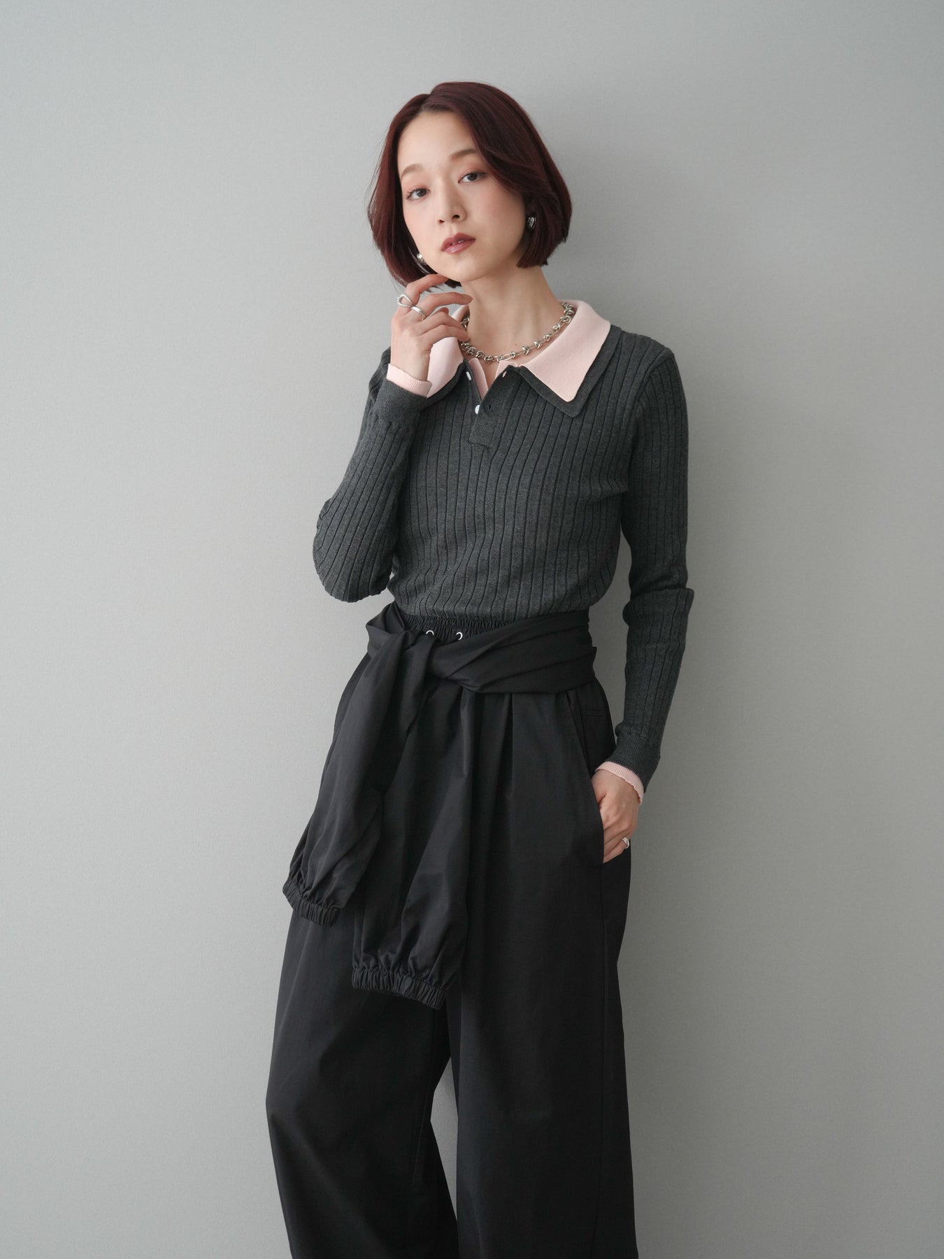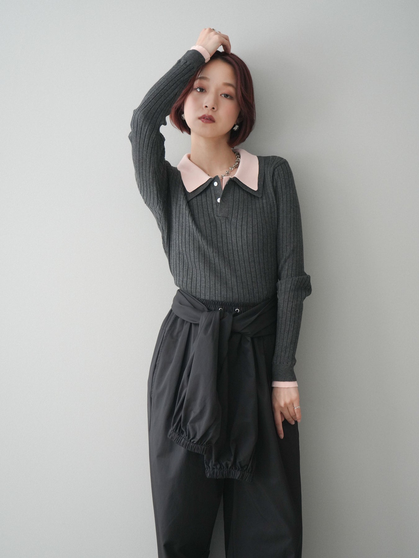 ◆ [予約]ダブル襟ポロリブニットトップス
