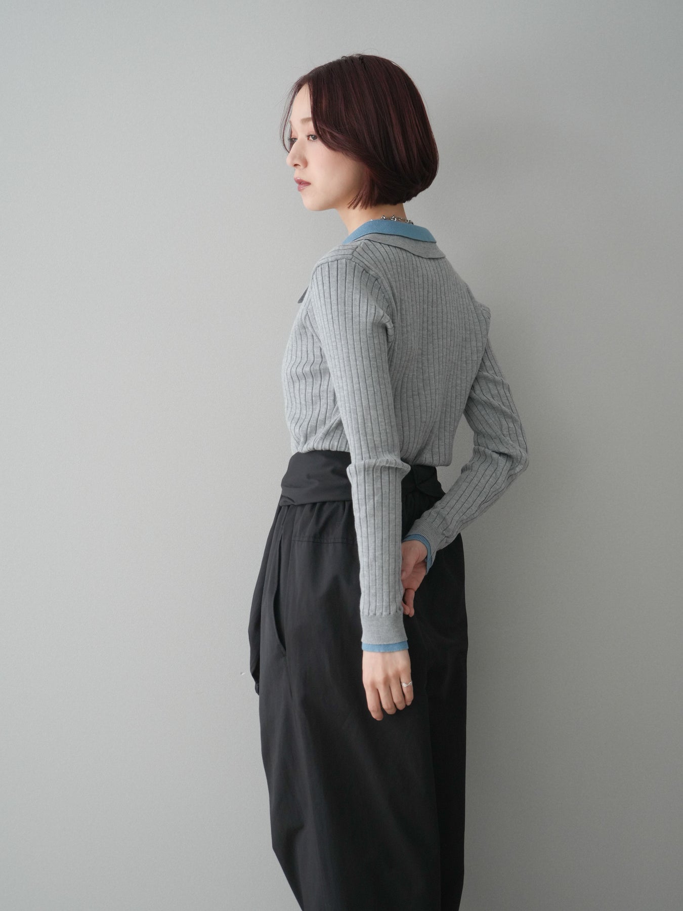 クラシックなポロデザインに、配色のダブル襟を重ねたリブニットトップス。 首元にさりげない立体感が生まれ、シンプルながらも視線を引く一枚です。 縦ラインを強調するリブ編みが全体をすっきりと見せ、コンパクトなシルエットながら窮屈さを感じにくい着心地。 デニムやスラックスと合わせるだけでバランスが取りやすく、ジャケットやアウターのインナーとしても活躍します。 程よくきちんと感があり、日常使いから少しきれいめなスタイルまで幅広く取り入れやすいアイテムです。 ※ボトムス、キャミソール(インナー)以外の商品は一律でインナーは付属していません。