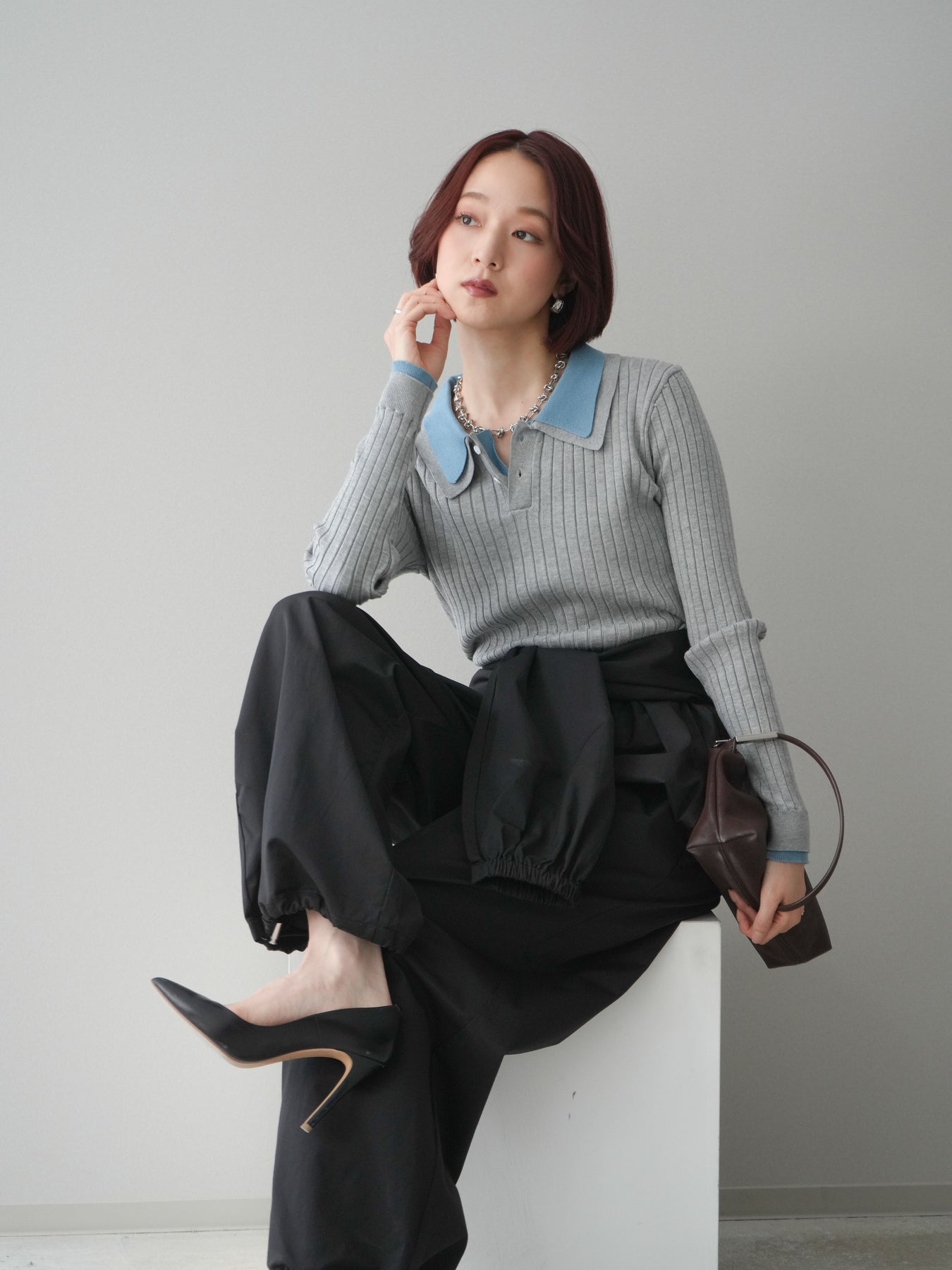 [SET]ダブル襟ポロリブニットトップス+ウエスト巻きデザインドロストコットンナイロンパンツ(2set)