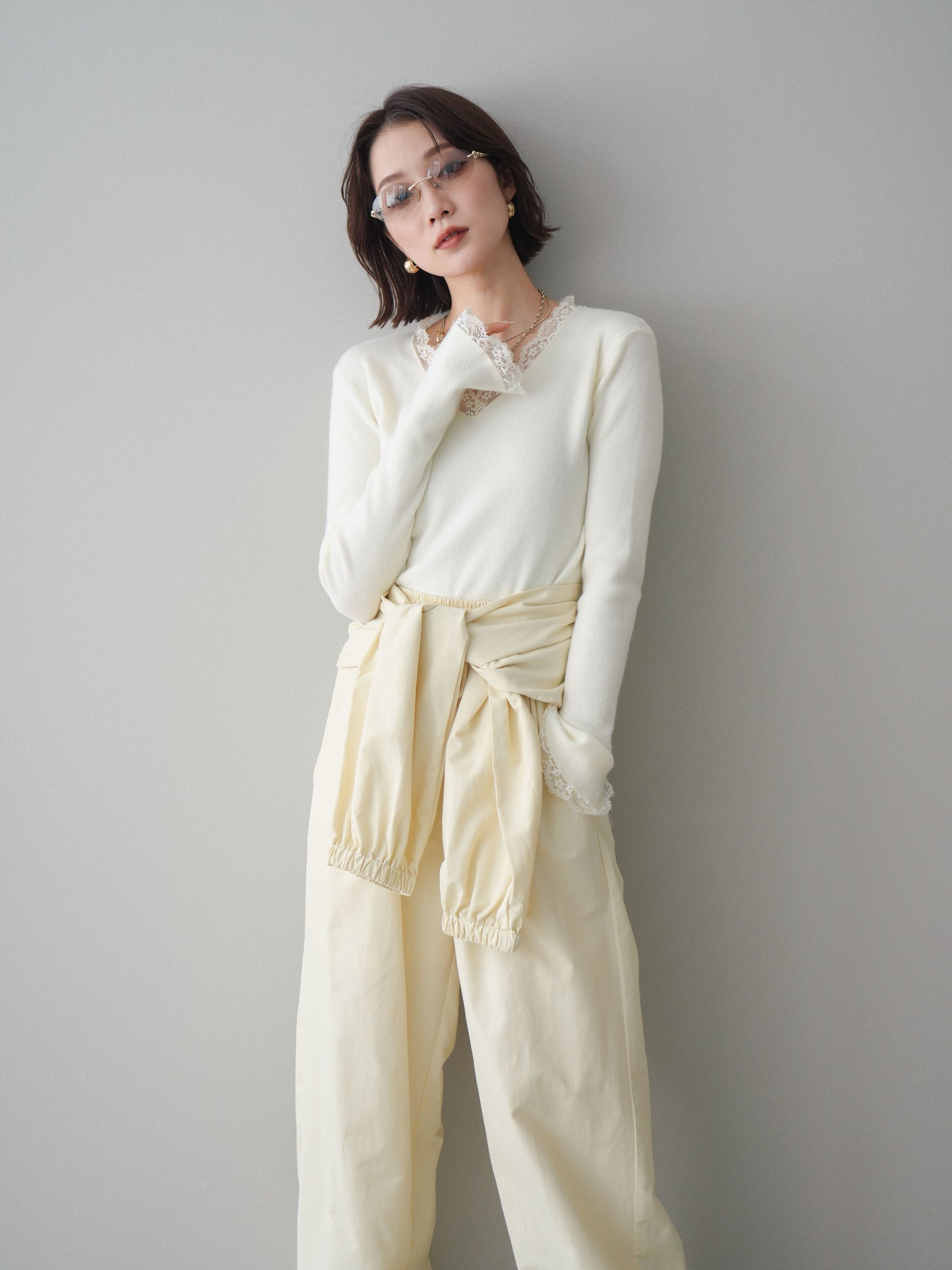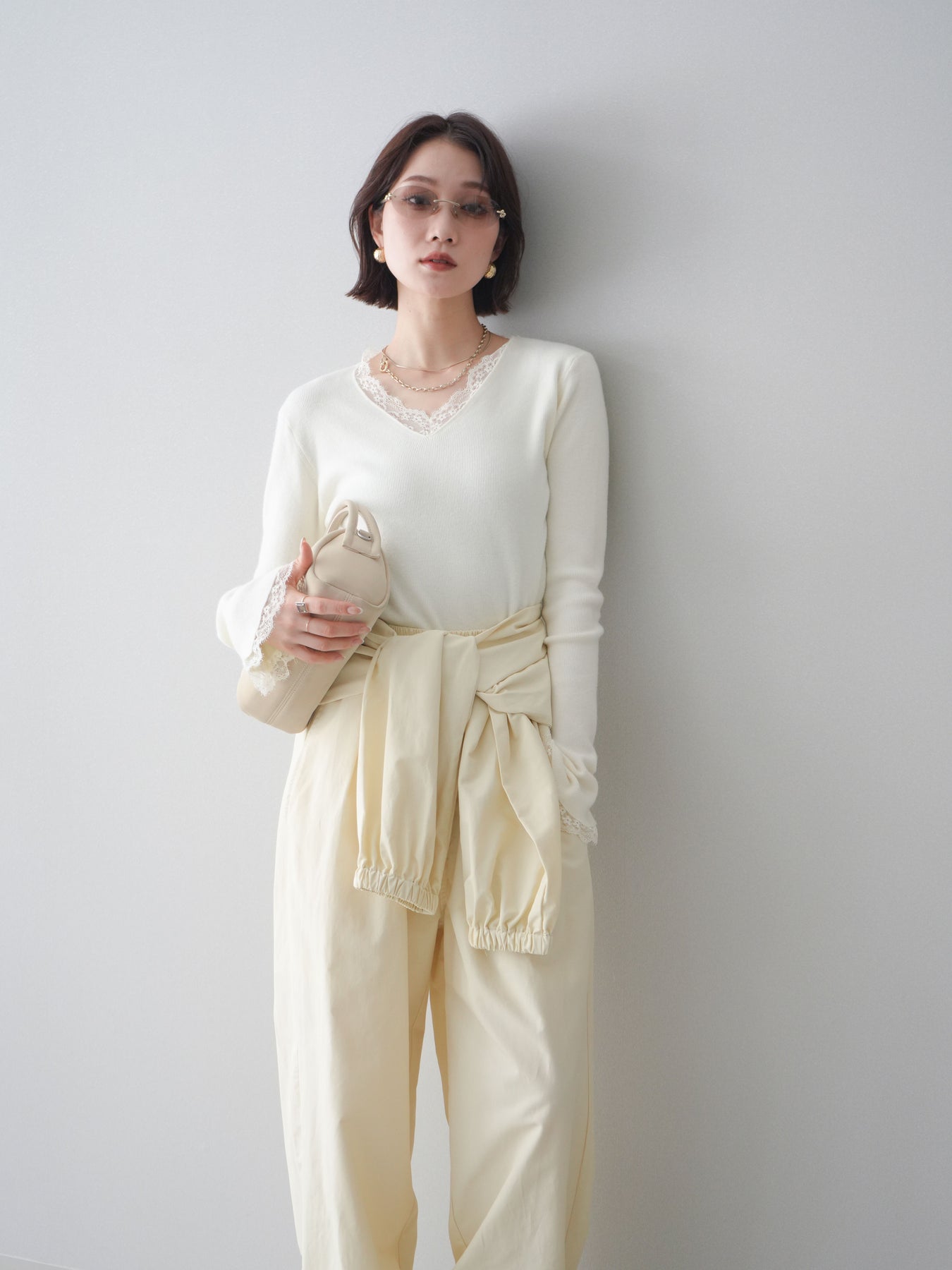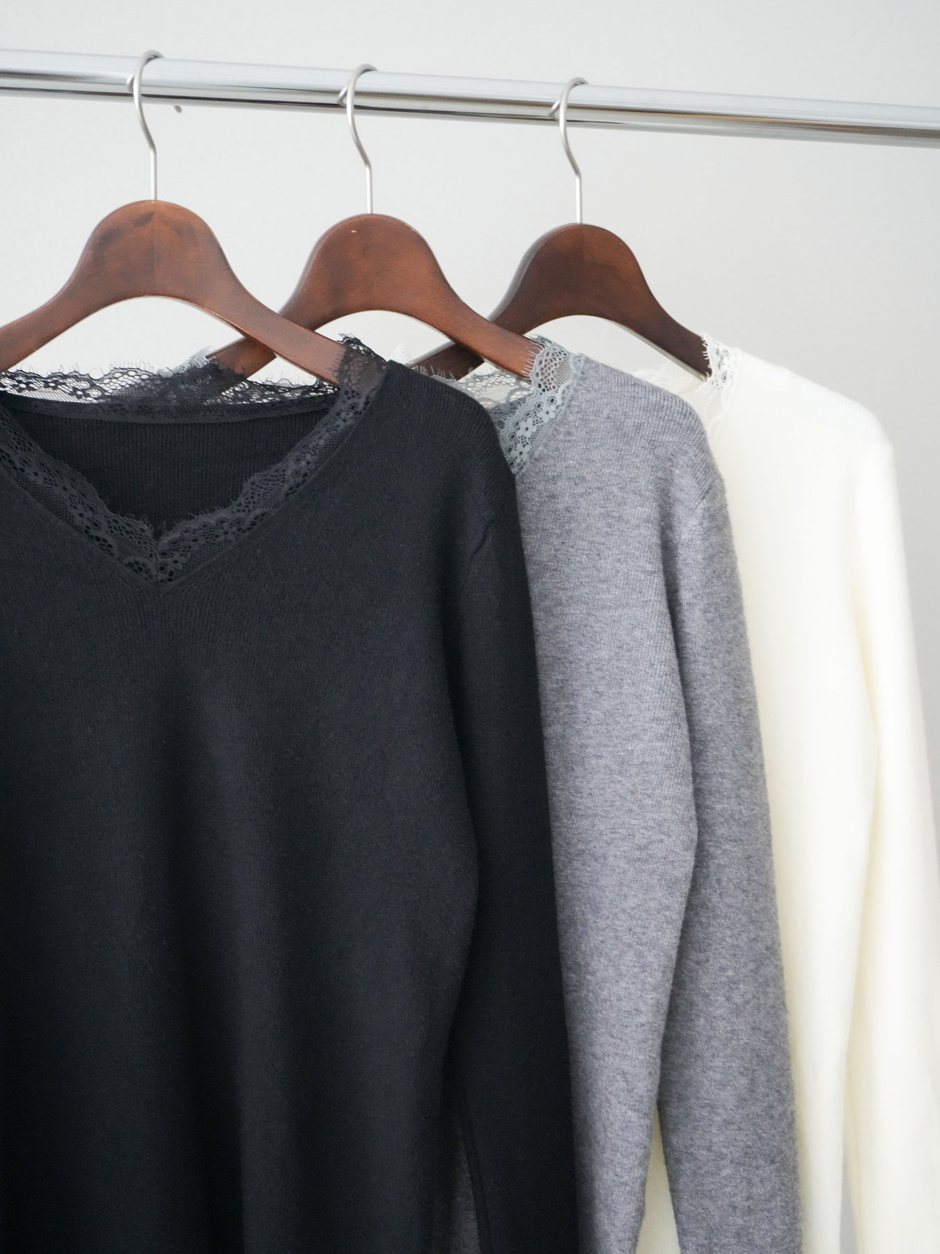 繊細なレースを重ねたVネックデザインが、さりげない表情を添えるニットトップス。 首元から覗くレースが上品な抜け感を生み、シンプルながらも印象に残る一枚です。 程よくフィットするシルエットで、ボトムスにインしてもアウトでもバランスよく着用可能。 ニットの柔らかな風合いとレースの軽やかさが調和し、デニムなどのカジュアルなアイテムと合わせても、どこか洗練された雰囲気にまとまります。 一枚着としてはもちろん、ジャケットやカーディガンのインナーとしても活躍するトップスです。 ※ボトムス、キャミソール(インナー)以外の商品は一律でインナーは付属していません。