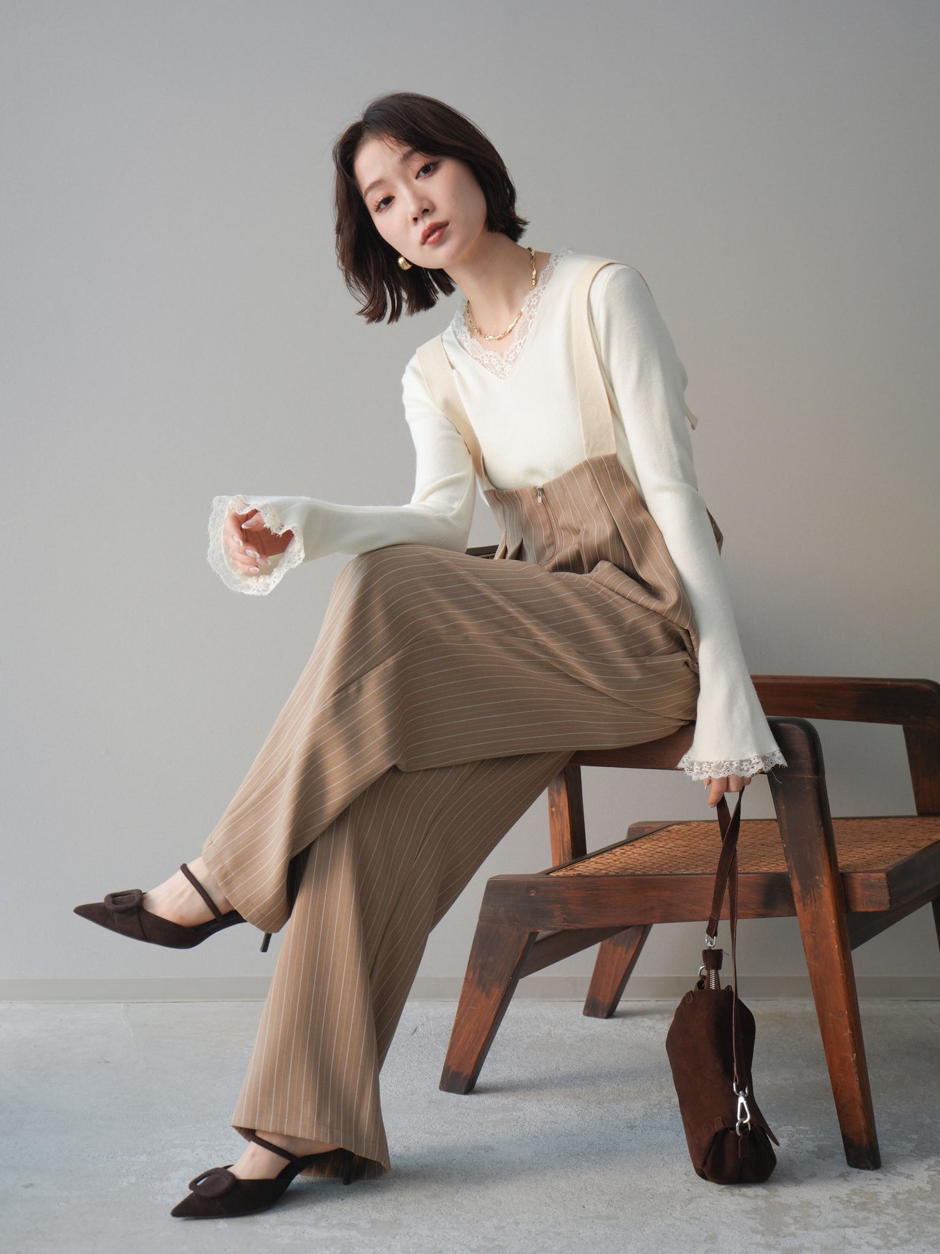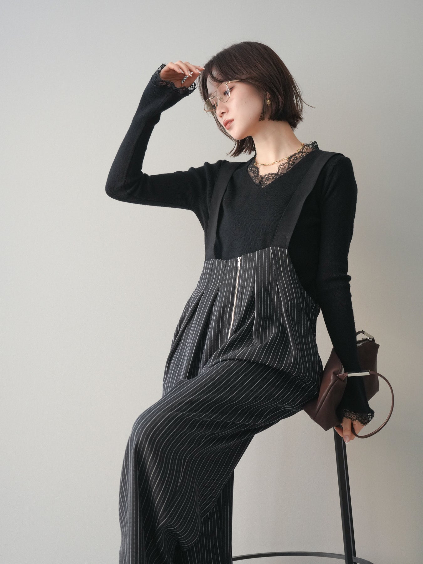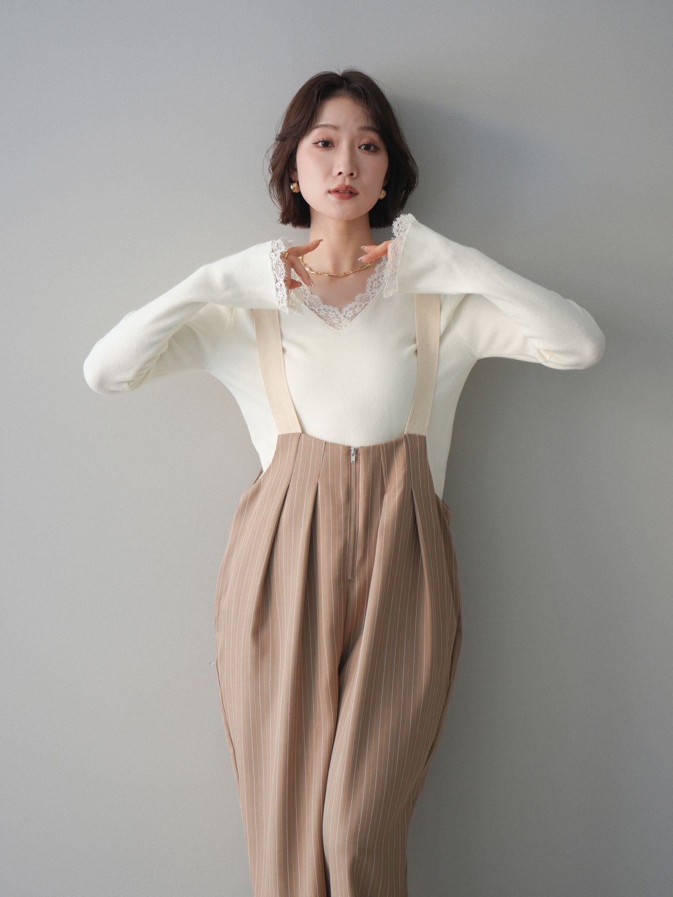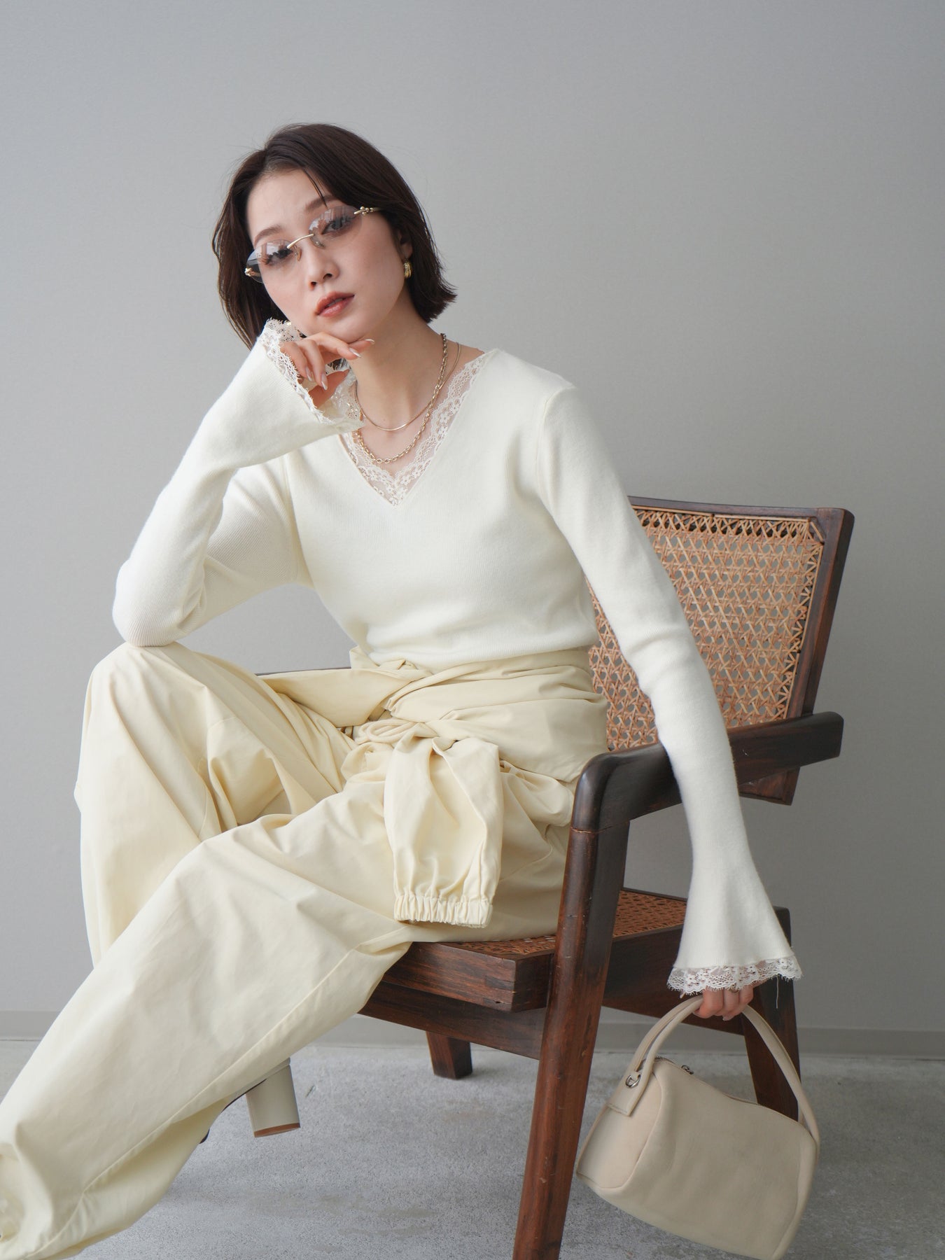 繊細なレースを重ねたVネックデザインが、さりげない表情を添えるニットトップス。 首元から覗くレースが上品な抜け感を生み、シンプルながらも印象に残る一枚です。 程よくフィットするシルエットで、ボトムスにインしてもアウトでもバランスよく着用可能。 ニットの柔らかな風合いとレースの軽やかさが調和し、デニムなどのカジュアルなアイテムと合わせても、どこか洗練された雰囲気にまとまります。 一枚着としてはもちろん、ジャケットやカーディガンのインナーとしても活躍するトップスです。 ※ボトムス、キャミソール(インナー)以外の商品は一律でインナーは付属していません。