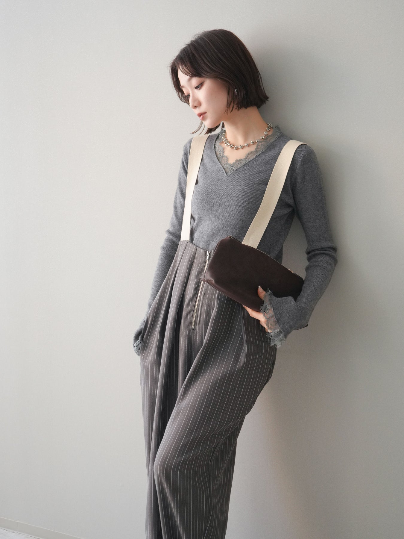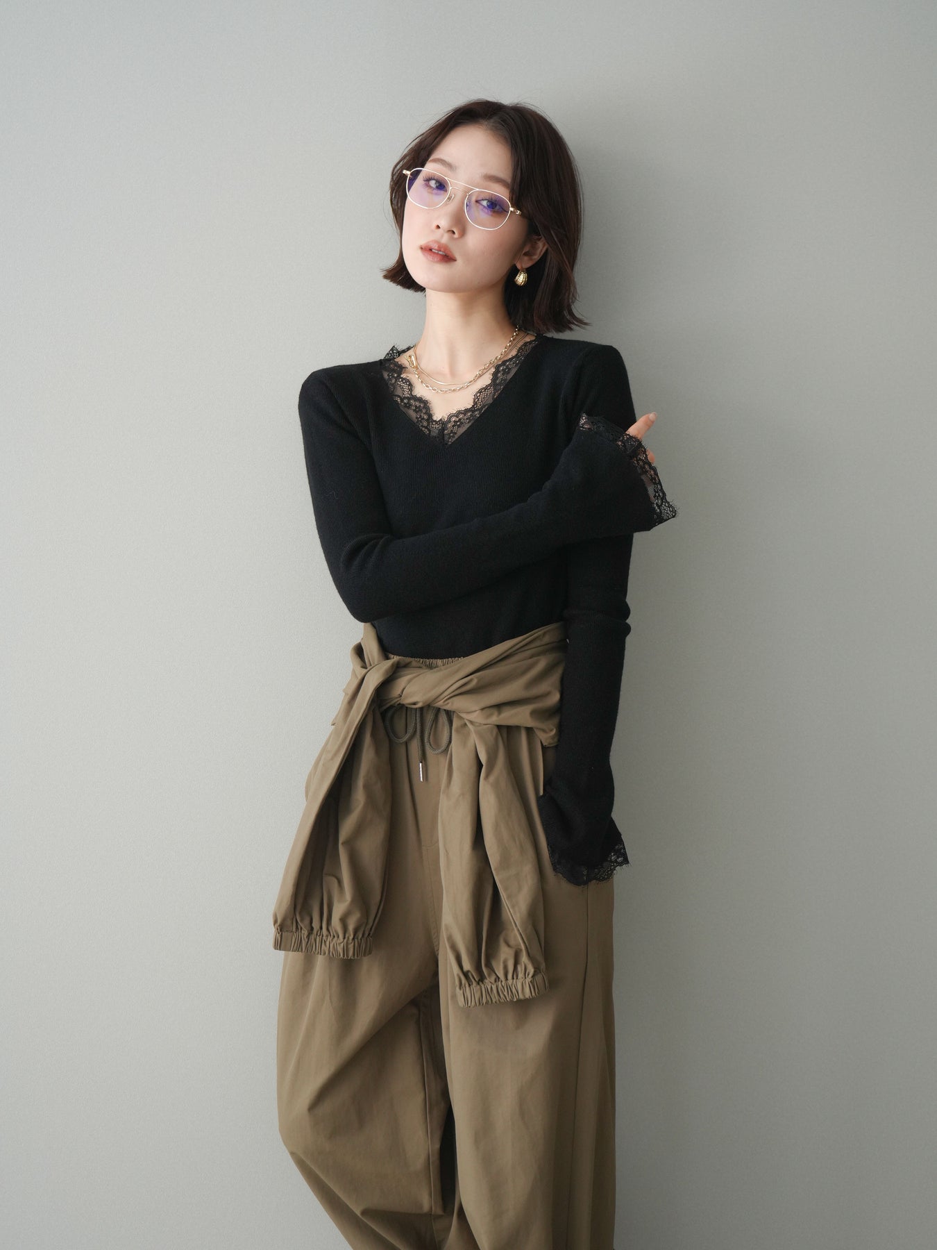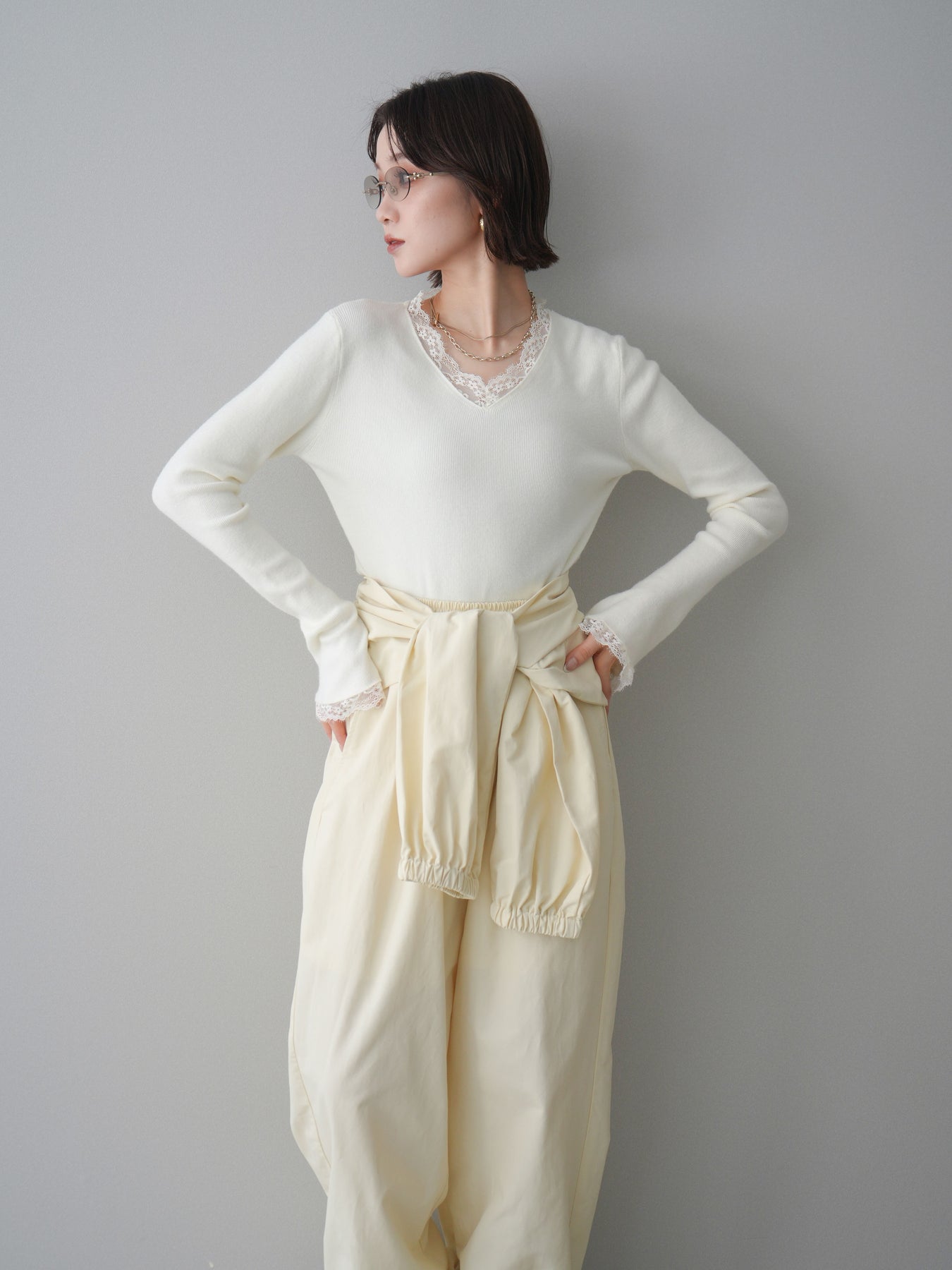 繊細なレースを重ねたVネックデザインが、さりげない表情を添えるニットトップス。 首元から覗くレースが上品な抜け感を生み、シンプルながらも印象に残る一枚です。 程よくフィットするシルエットで、ボトムスにインしてもアウトでもバランスよく着用可能。 ニットの柔らかな風合いとレースの軽やかさが調和し、デニムなどのカジュアルなアイテムと合わせても、どこか洗練された雰囲気にまとまります。 一枚着としてはもちろん、ジャケットやカーディガンのインナーとしても活躍するトップスです。 ※ボトムス、キャミソール(インナー)以外の商品は一律でインナーは付属していません。