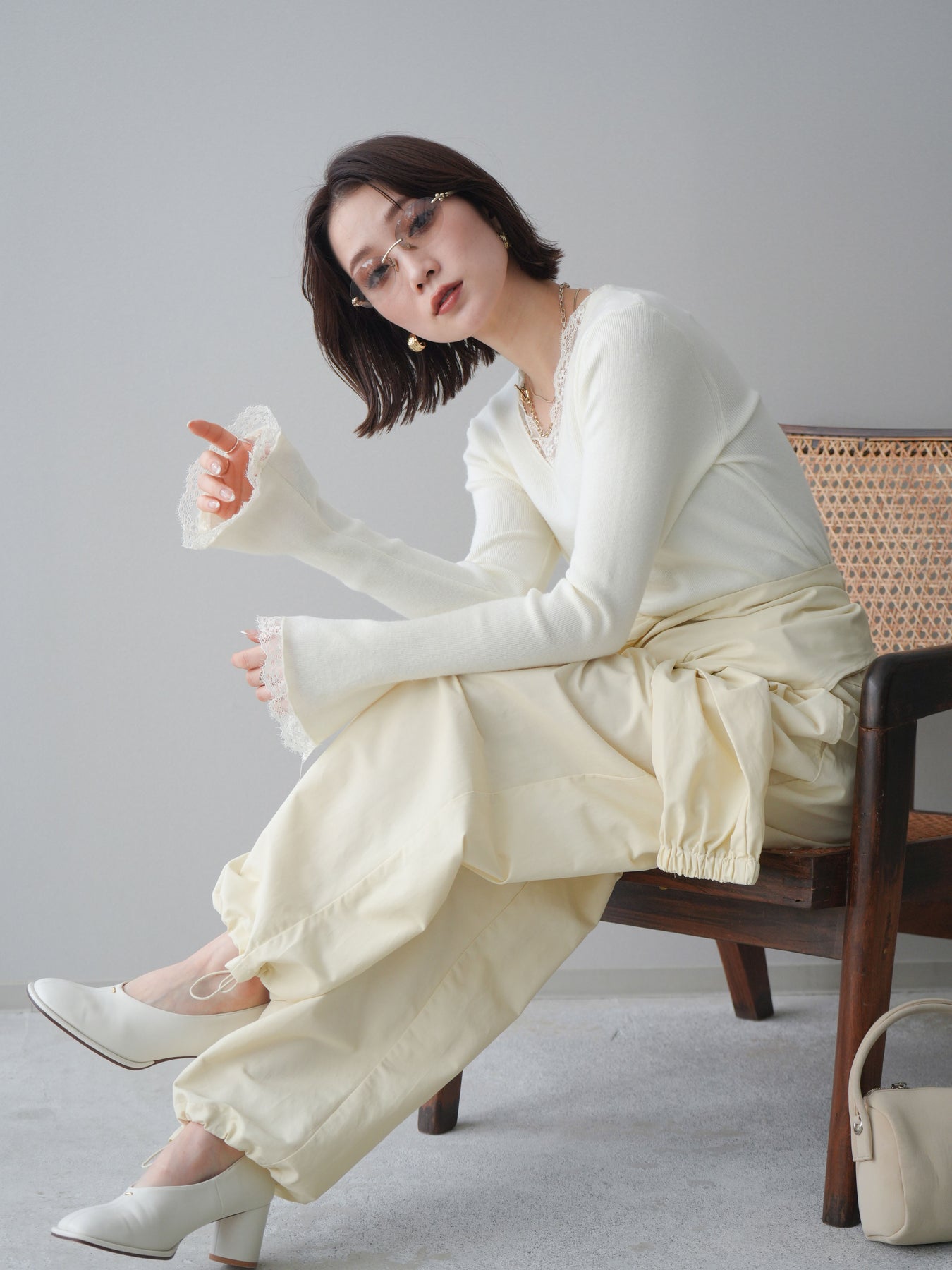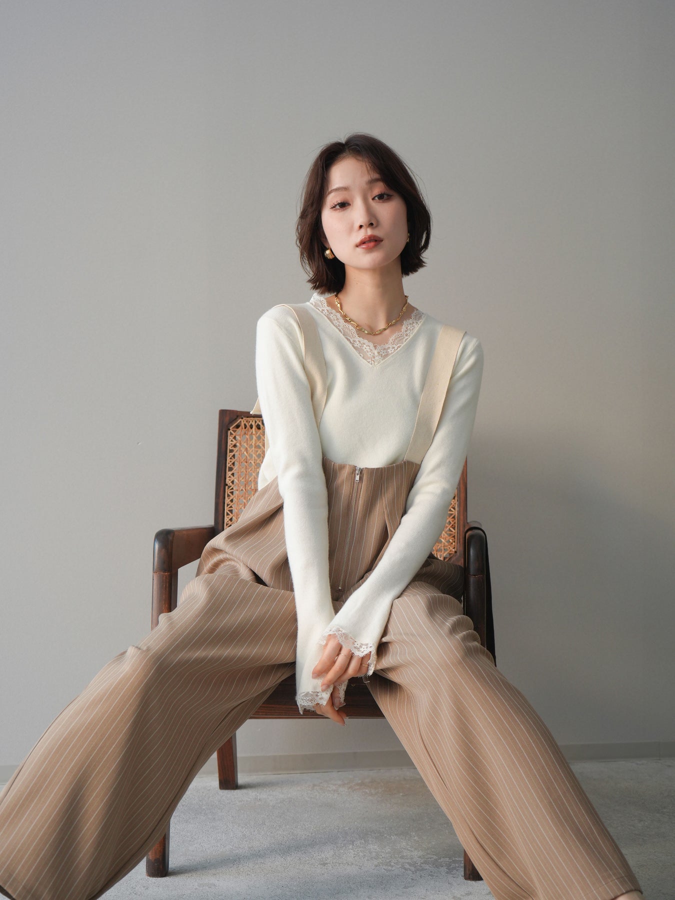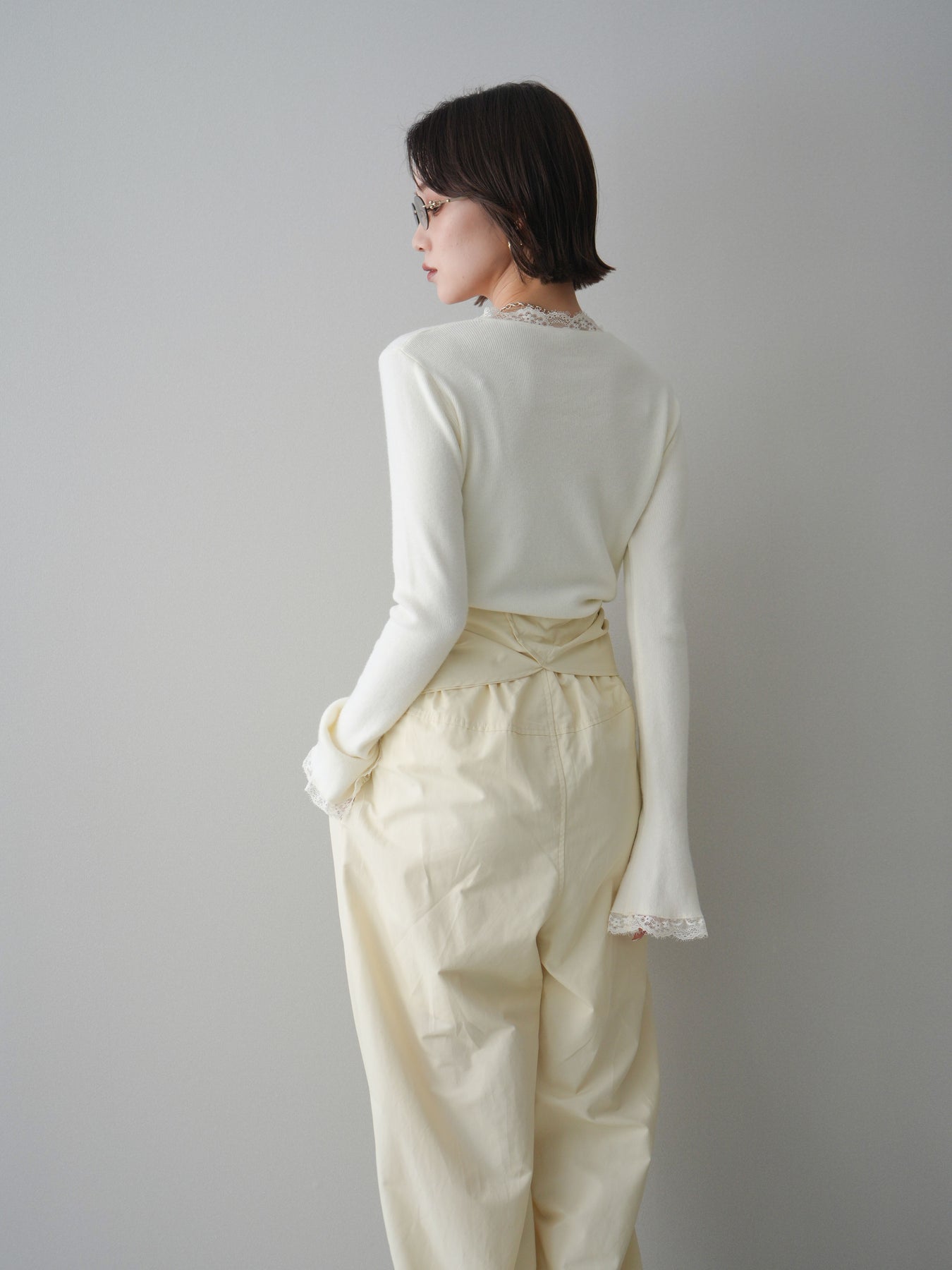 繊細なレースを重ねたVネックデザインが、さりげない表情を添えるニットトップス。 首元から覗くレースが上品な抜け感を生み、シンプルながらも印象に残る一枚です。 程よくフィットするシルエットで、ボトムスにインしてもアウトでもバランスよく着用可能。 ニットの柔らかな風合いとレースの軽やかさが調和し、デニムなどのカジュアルなアイテムと合わせても、どこか洗練された雰囲気にまとまります。 一枚着としてはもちろん、ジャケットやカーディガンのインナーとしても活躍するトップスです。 ※ボトムス、キャミソール(インナー)以外の商品は一律でインナーは付属していません。