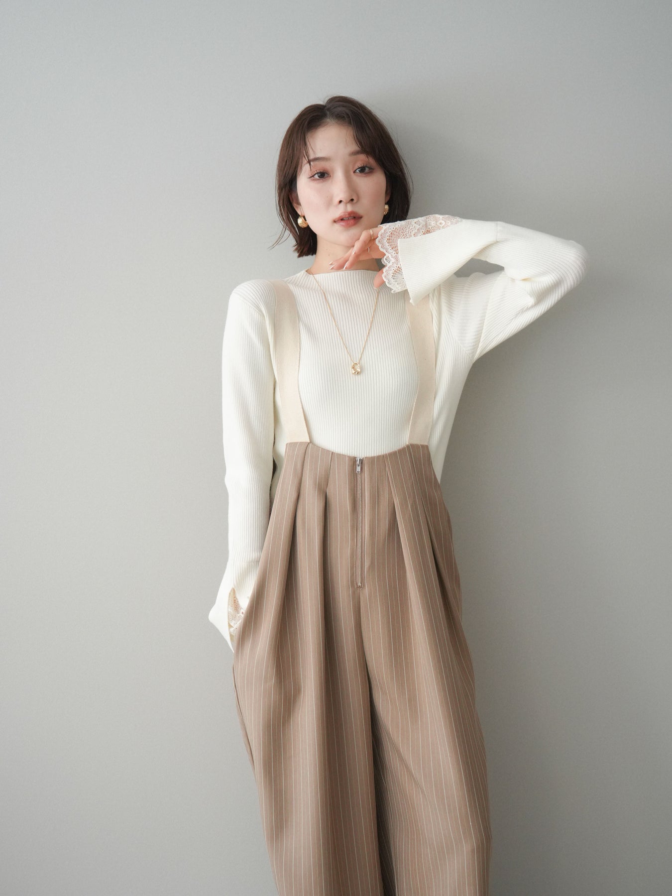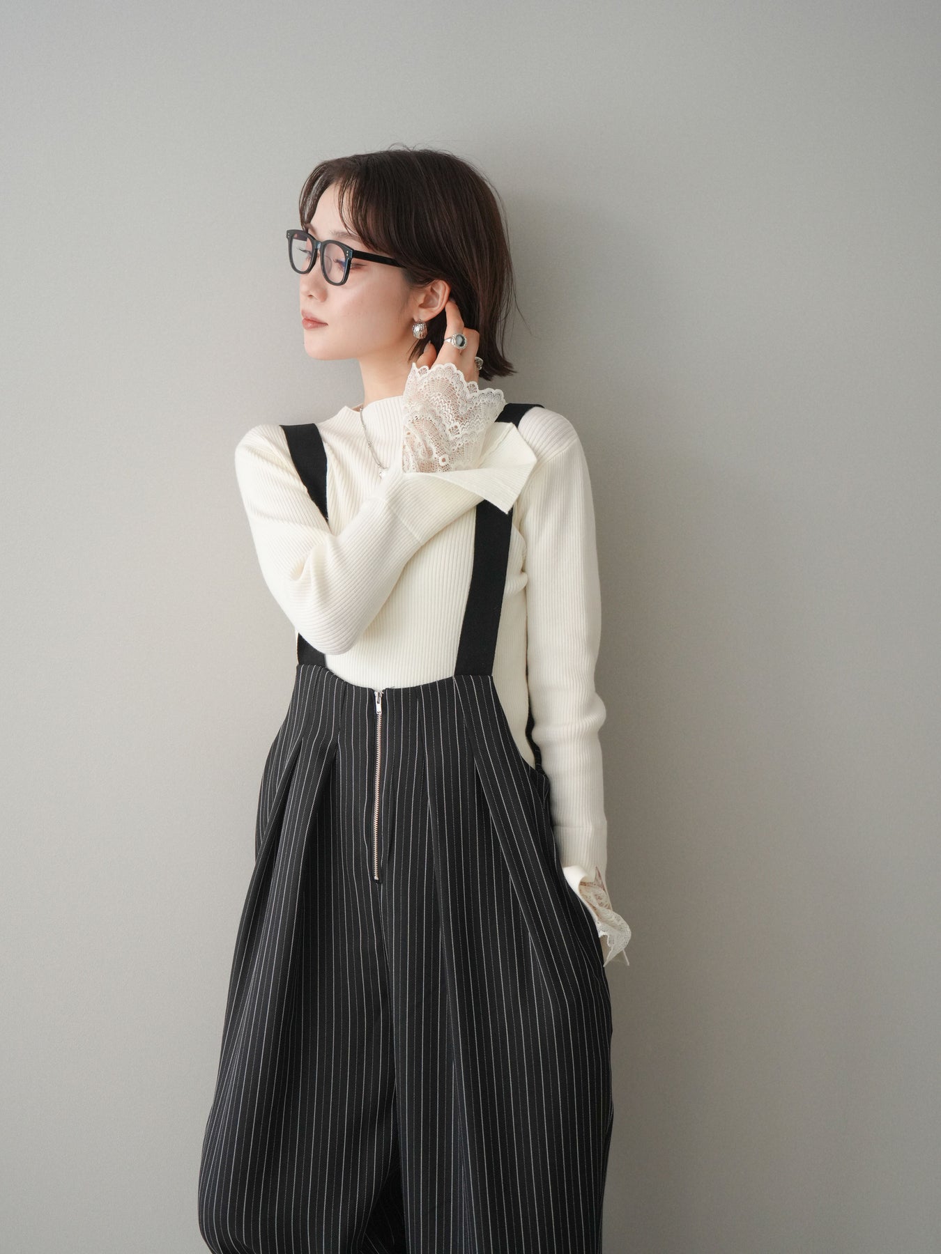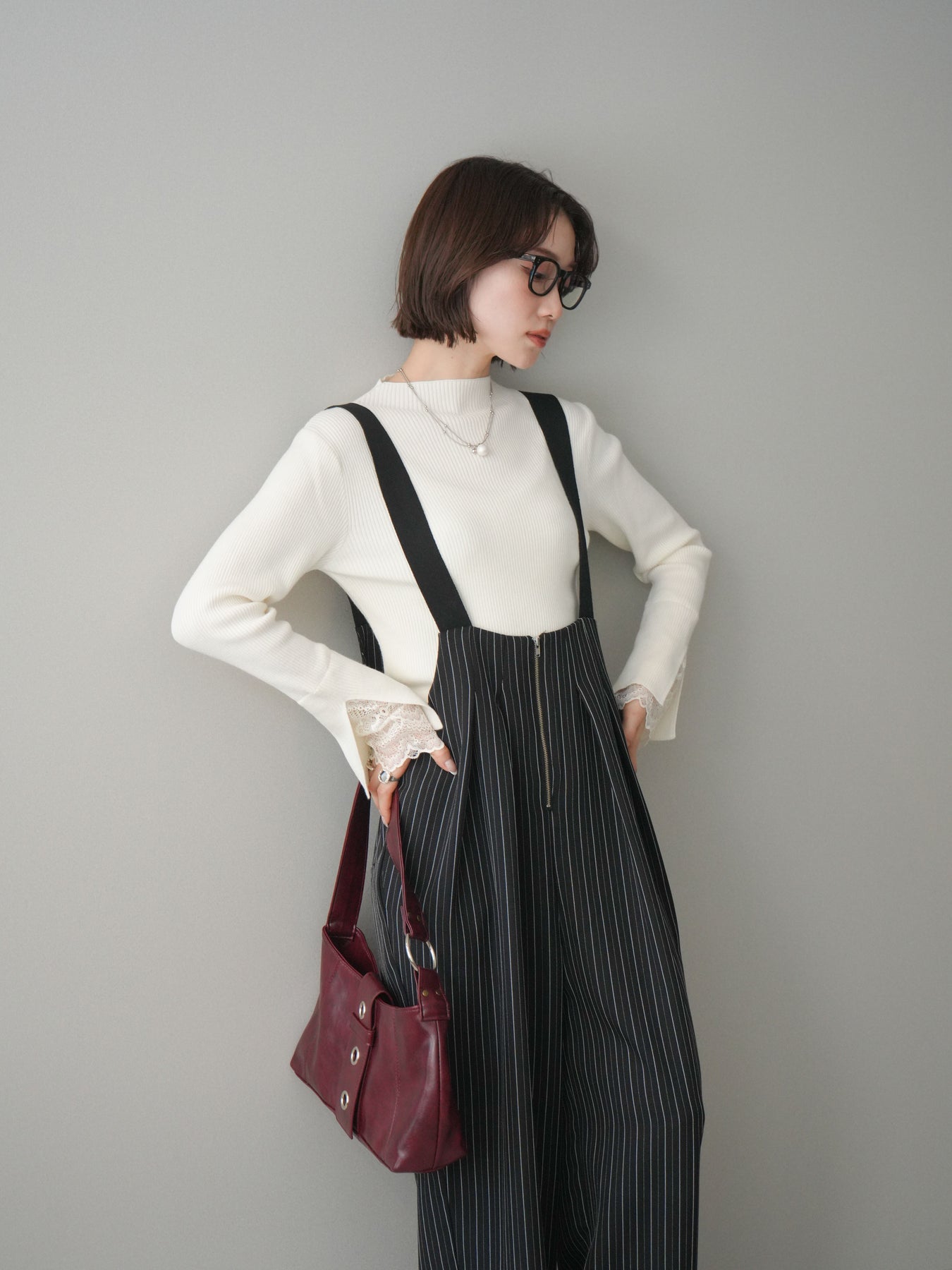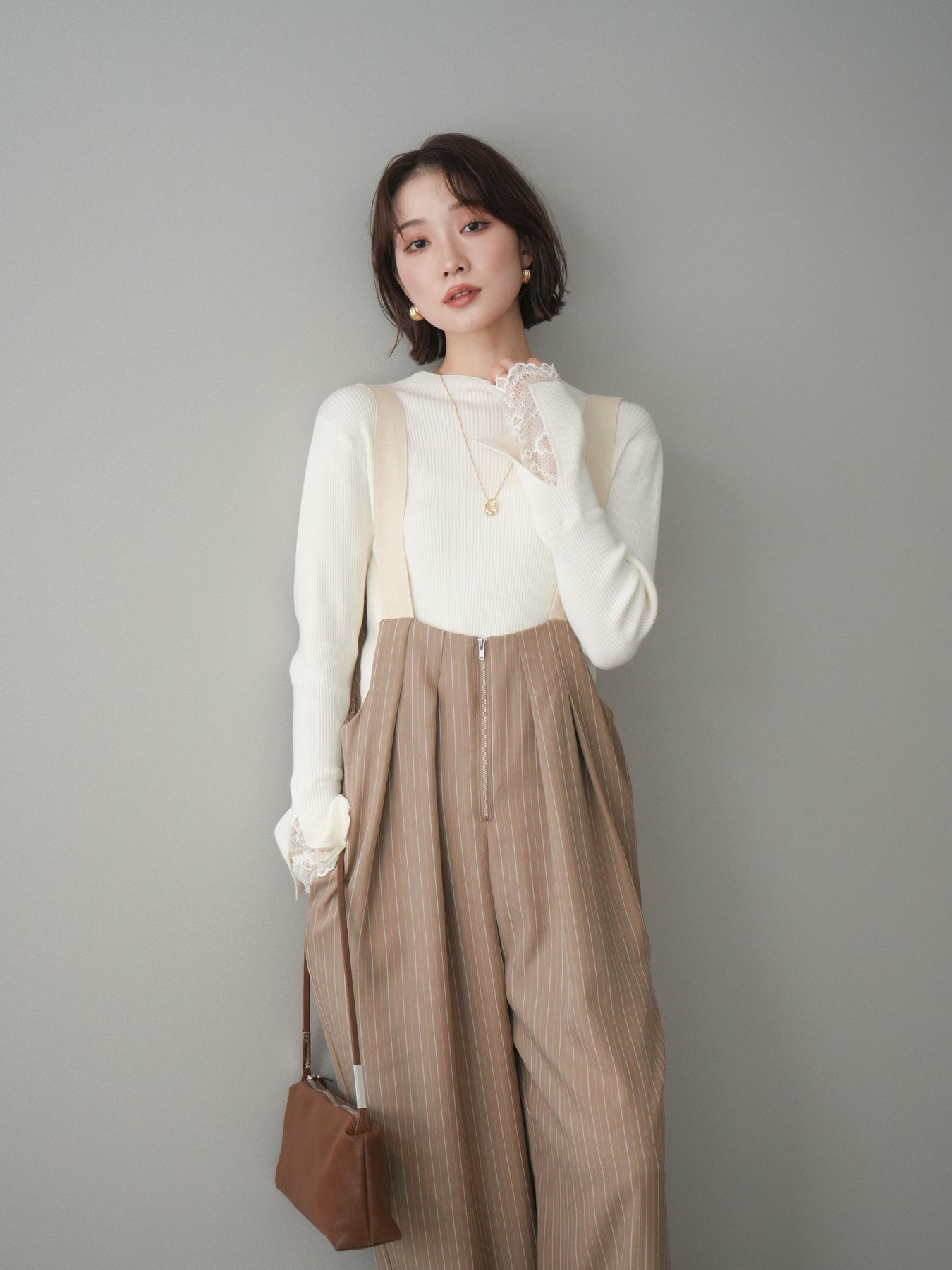 ストライプの縦ラインがすっきりとした印象をつくるサロペット。 胸元は程よくフィット感を持たせつつ、ウエスト下からはゆとりを出したシルエットで、動きやすさとバランスの良さを両立。 フロントジップのデザインが程よいアクセントになり、インナー次第で表情の変化も楽しめます。 トップスをコンパクトに合わせても、ボリュームのある袖デザインを重ねてもまとまりやすく、スタイリングの幅が広がる一着です。 ※ボトムス、キャミソール(インナー)以外の商品は一律でインナーは付属していません。