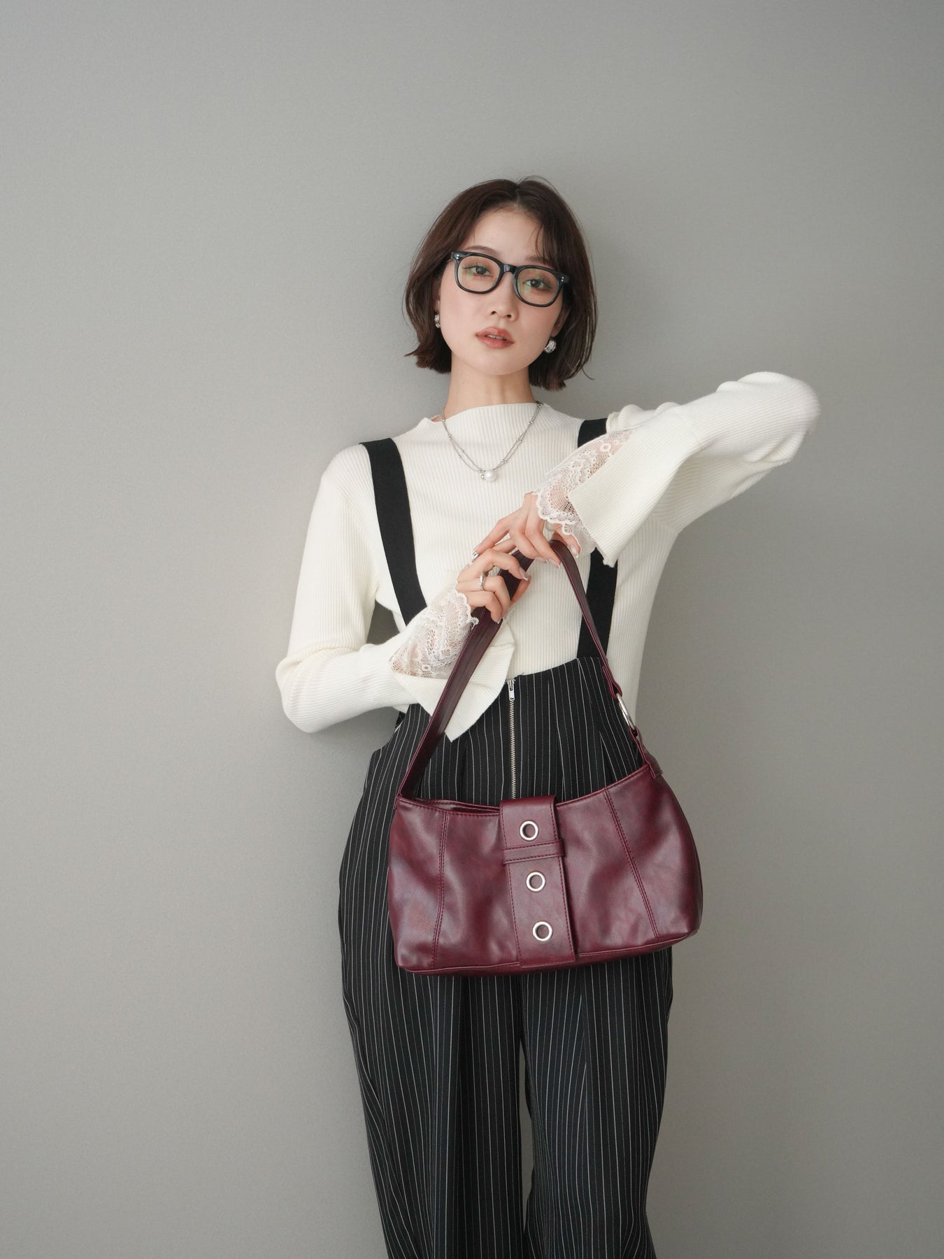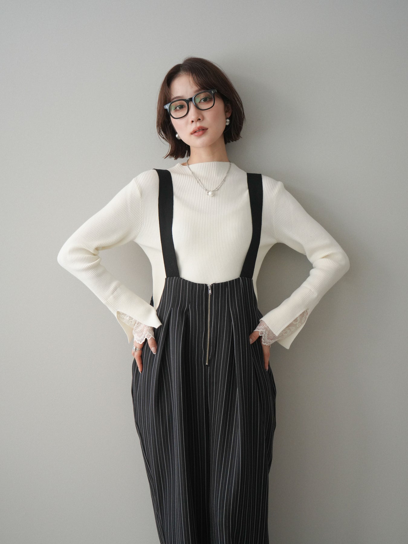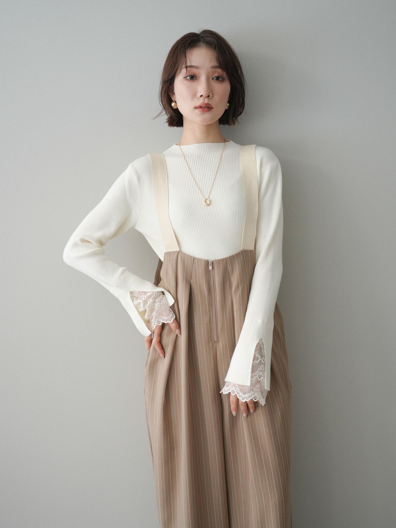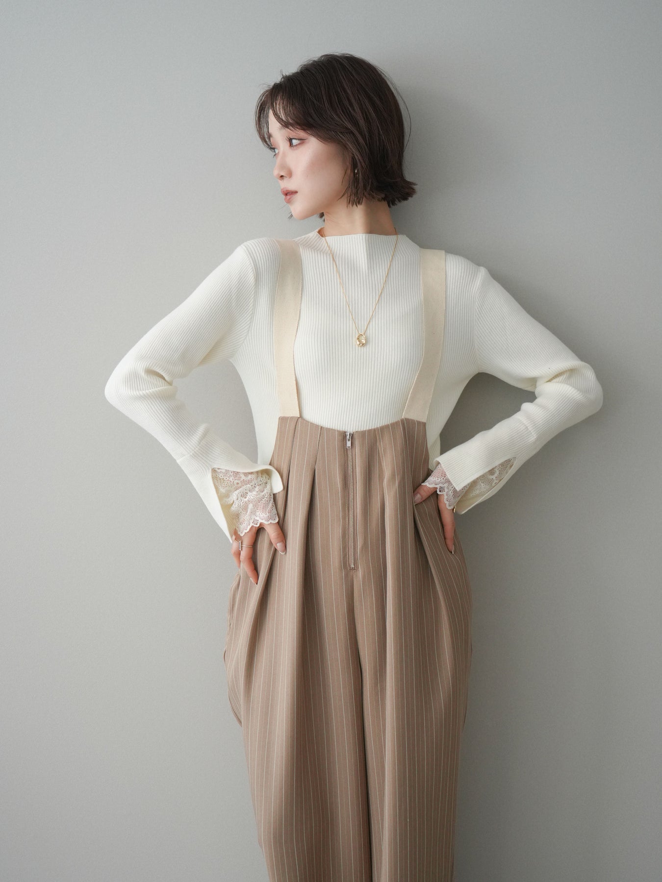 ストライプの縦ラインがすっきりとした印象をつくるサロペット。 胸元は程よくフィット感を持たせつつ、ウエスト下からはゆとりを出したシルエットで、動きやすさとバランスの良さを両立。 フロントジップのデザインが程よいアクセントになり、インナー次第で表情の変化も楽しめます。 トップスをコンパクトに合わせても、ボリュームのある袖デザインを重ねてもまとまりやすく、スタイリングの幅が広がる一着です。 ※ボトムス、キャミソール(インナー)以外の商品は一律でインナーは付属していません。
