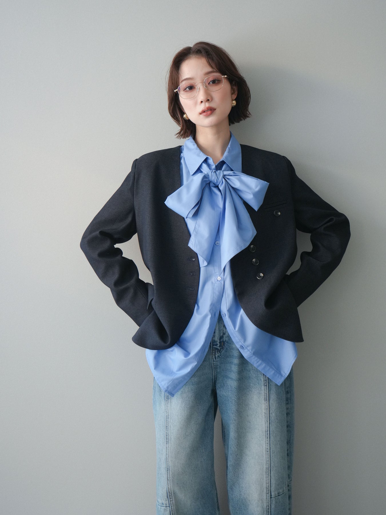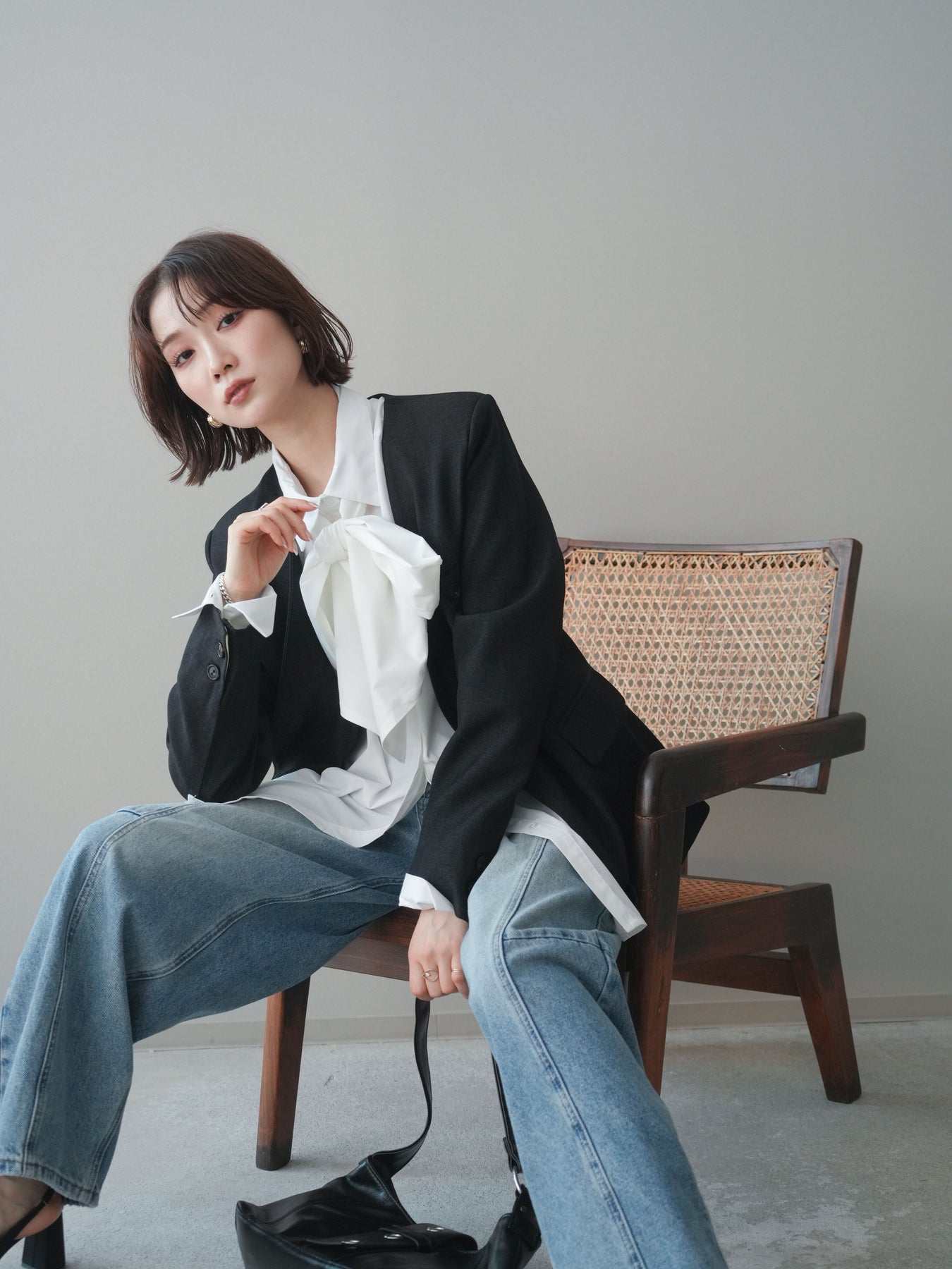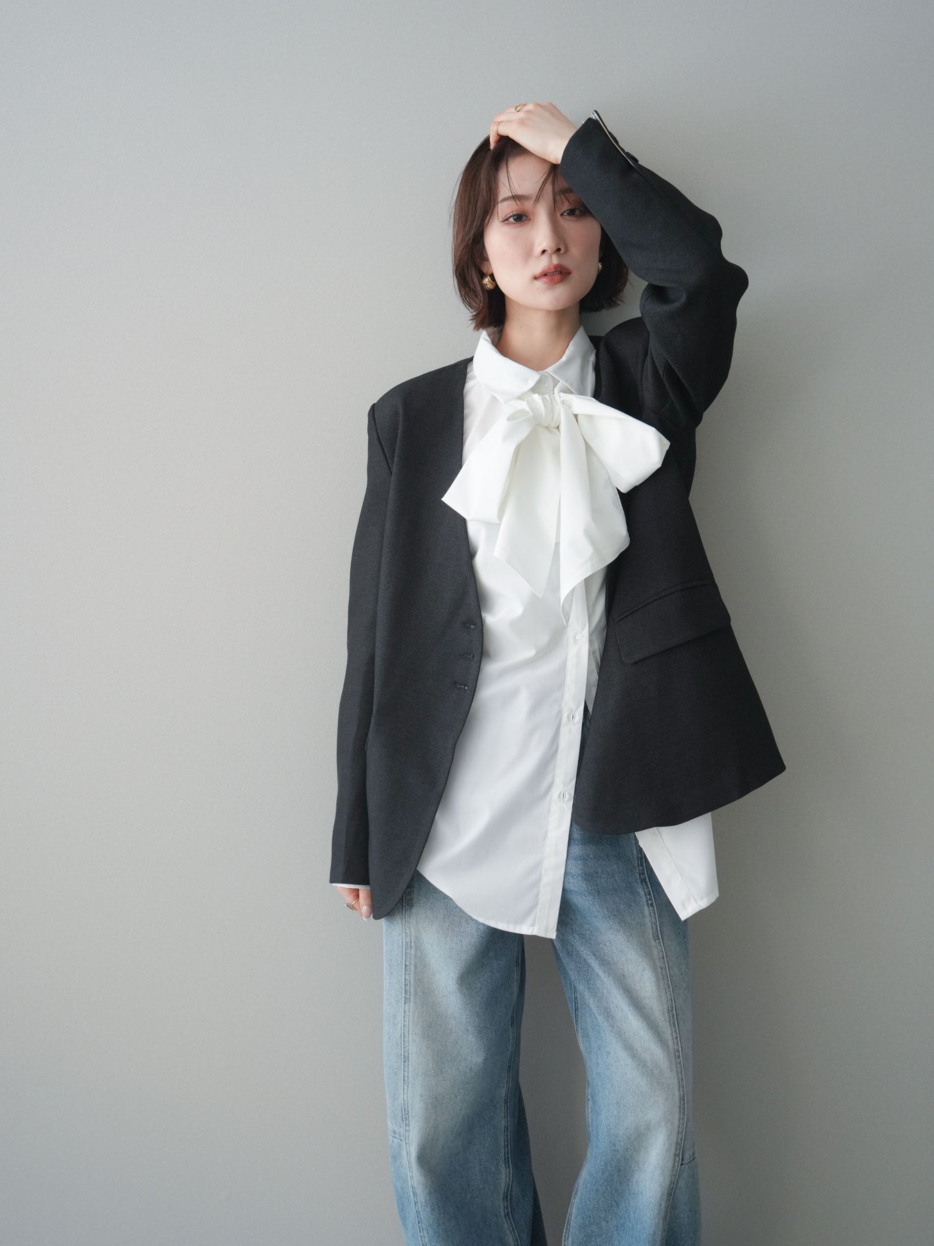 [SET]ノーカラージャケット+ボウタイ付オーバーシャツ+ガーメントウォッシュカーブデニムパンツ(3set)