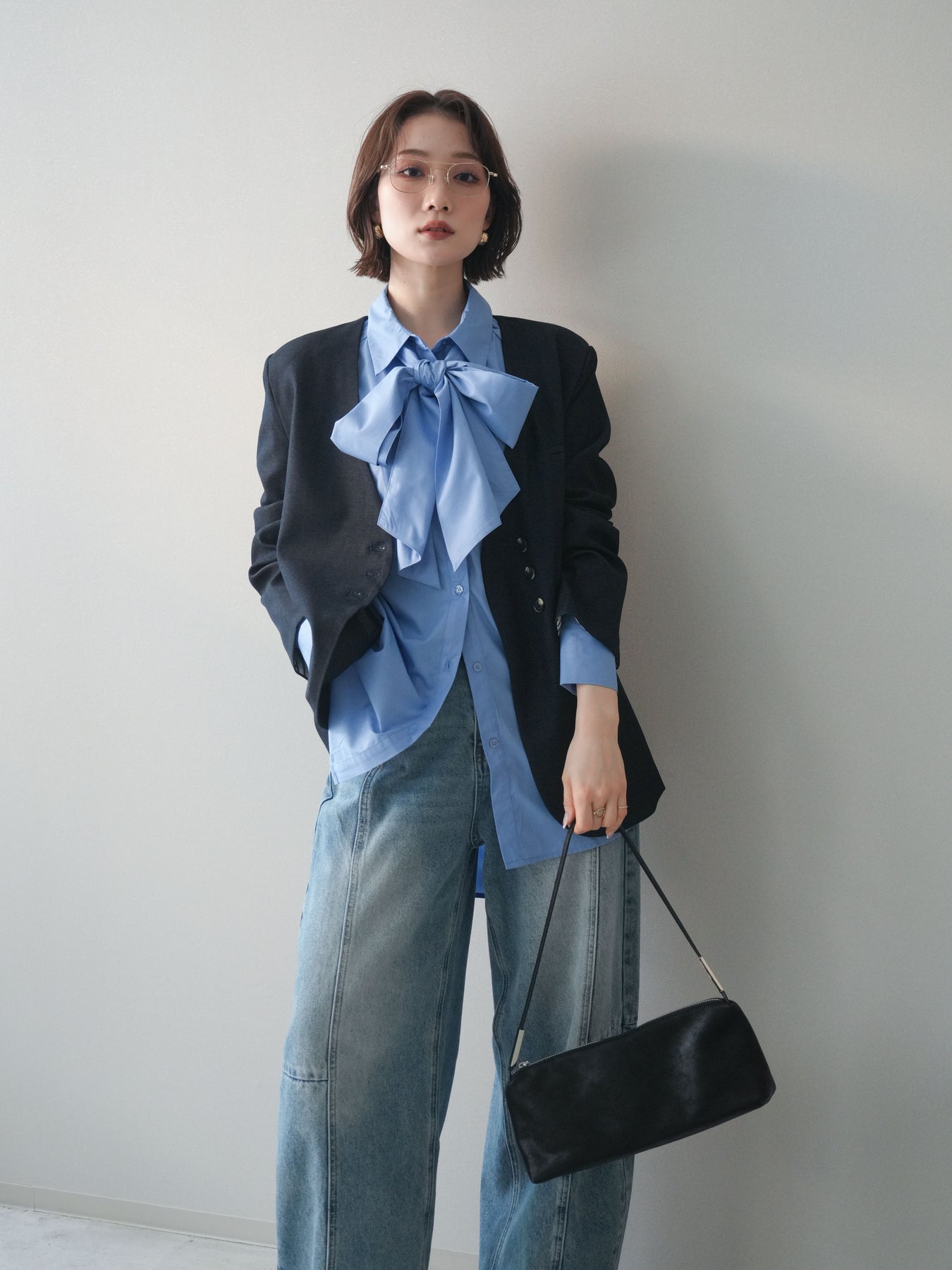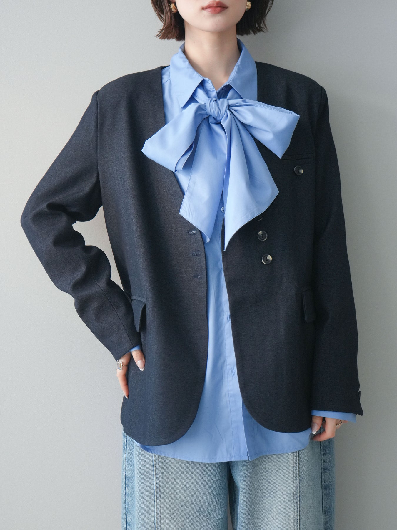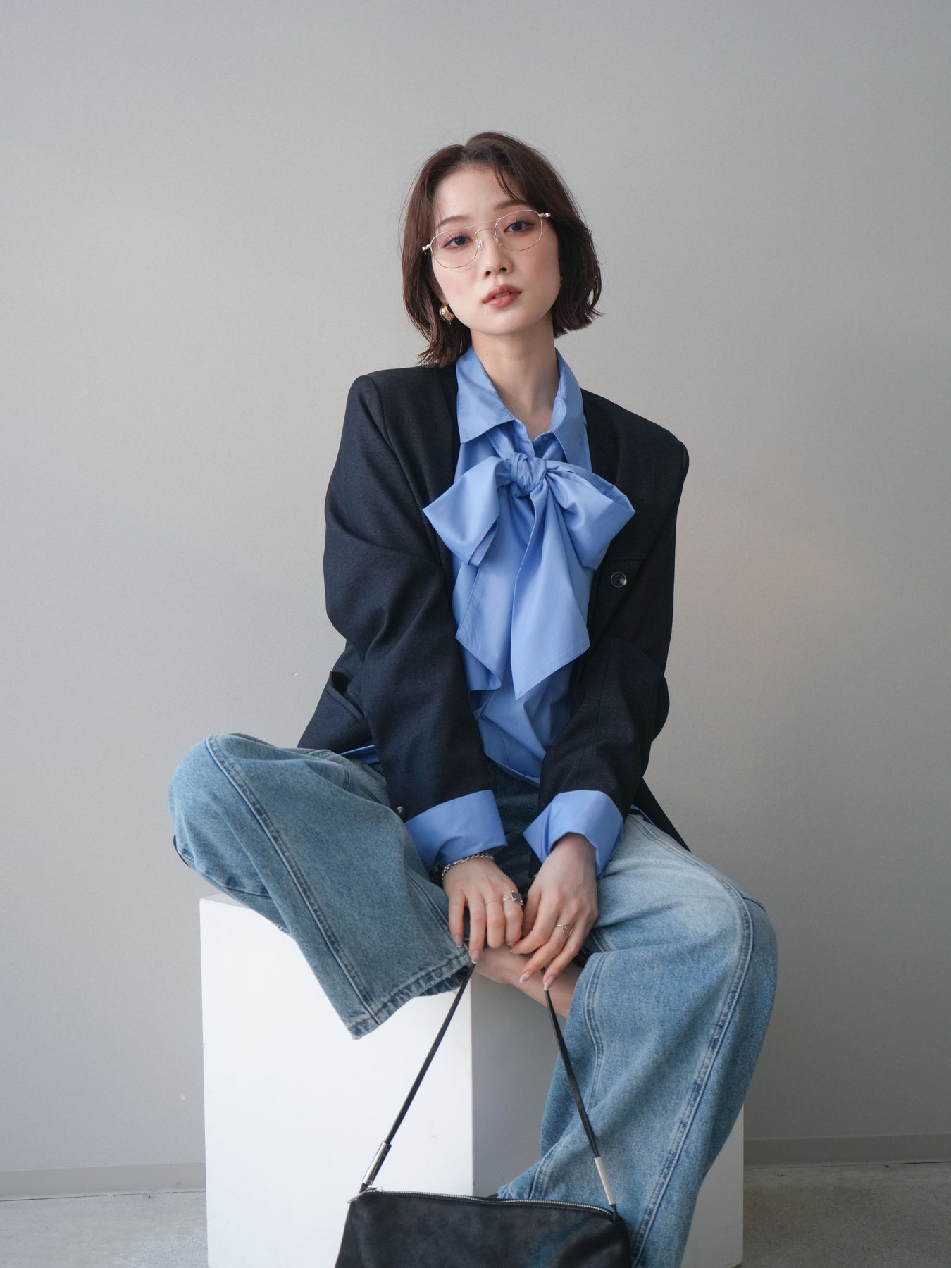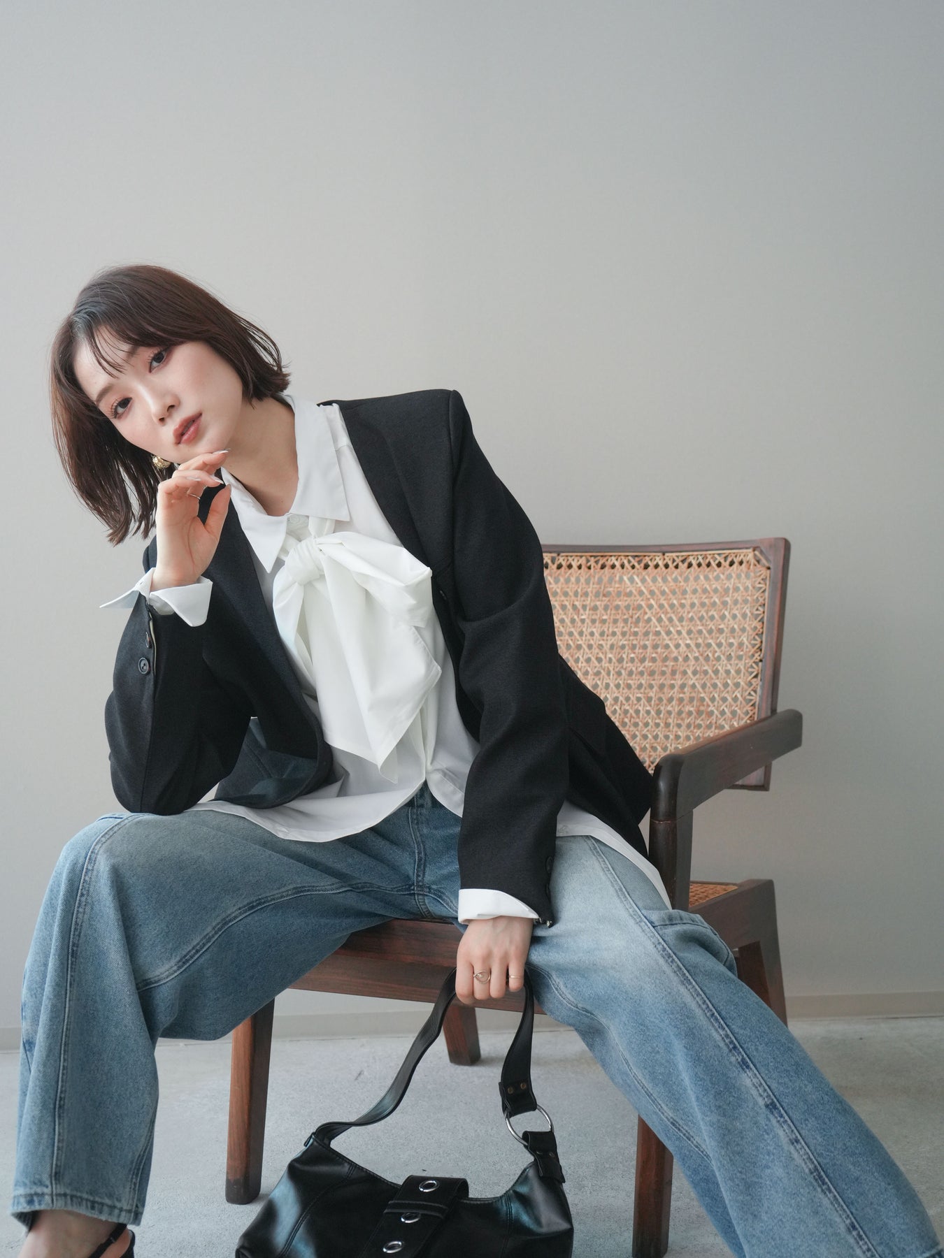 [SET]ノーカラージャケット+ボウタイ付オーバーシャツ+ガーメントウォッシュカーブデニムパンツ(3set)