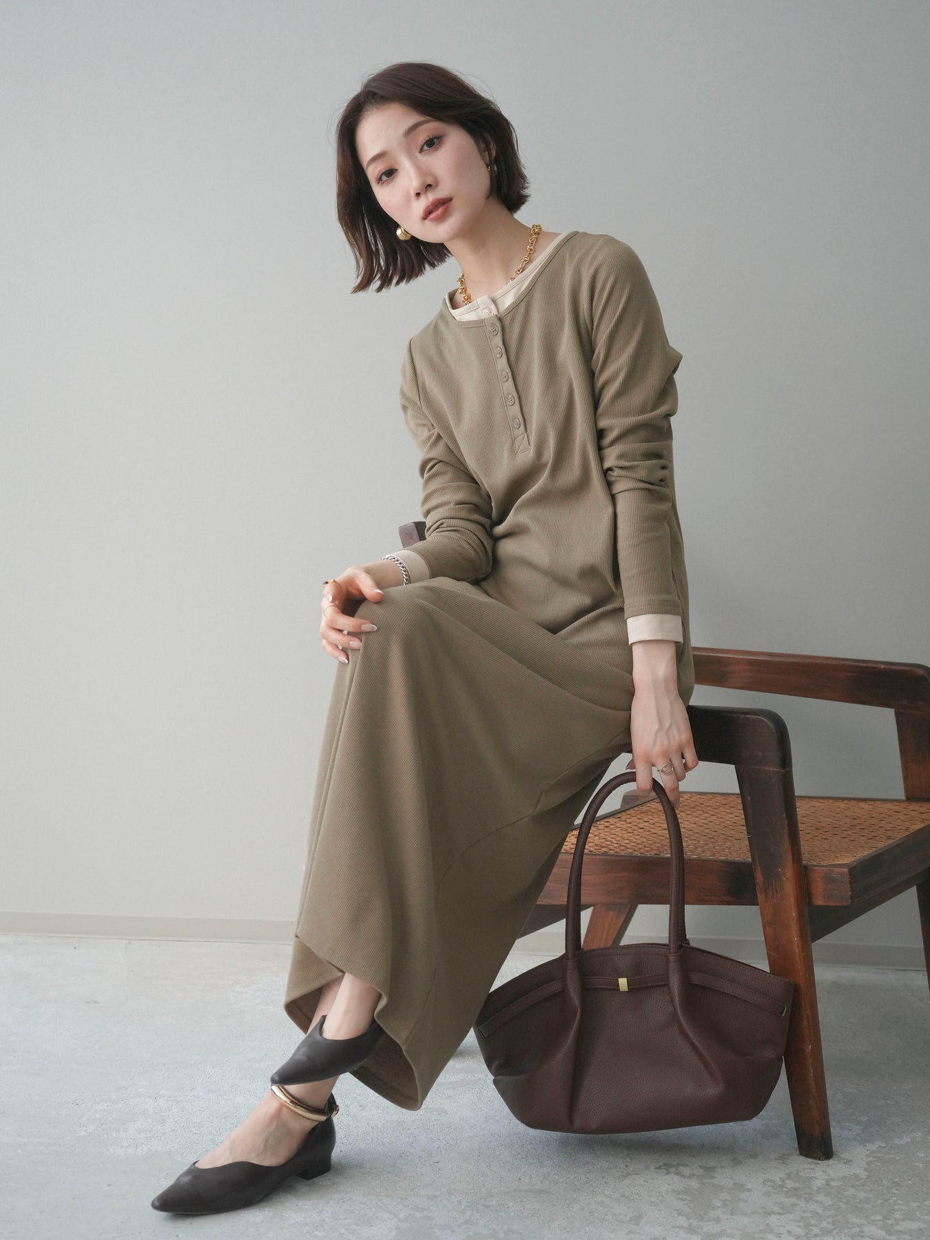 配色デザインを効かせたレイヤード風のヘンリーネックカットリブワンピース。 首元と袖口に覗くコントラストが、シンプルな中にさりげないアクセントを添えています。 程よく身体に沿うリブ素材は、縦ラインを強調し、すっきりとした印象に。 フロントのヘンリーネックデザインが抜け感を生み、ボタンの開け閉めで表情の変化も楽しめます。 一枚でスタイルが完成し、シューズや小物次第で雰囲気を切り替えられる、着回し力の高い一着です。 ※ボトムス、キャミソール(インナー)以外の商品は一律でインナーは付属していません。