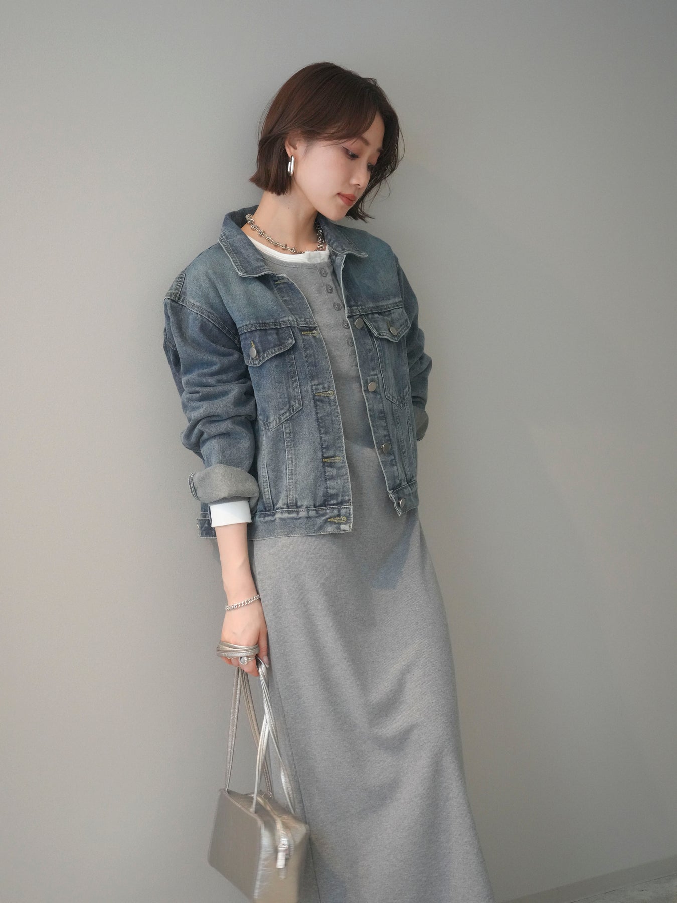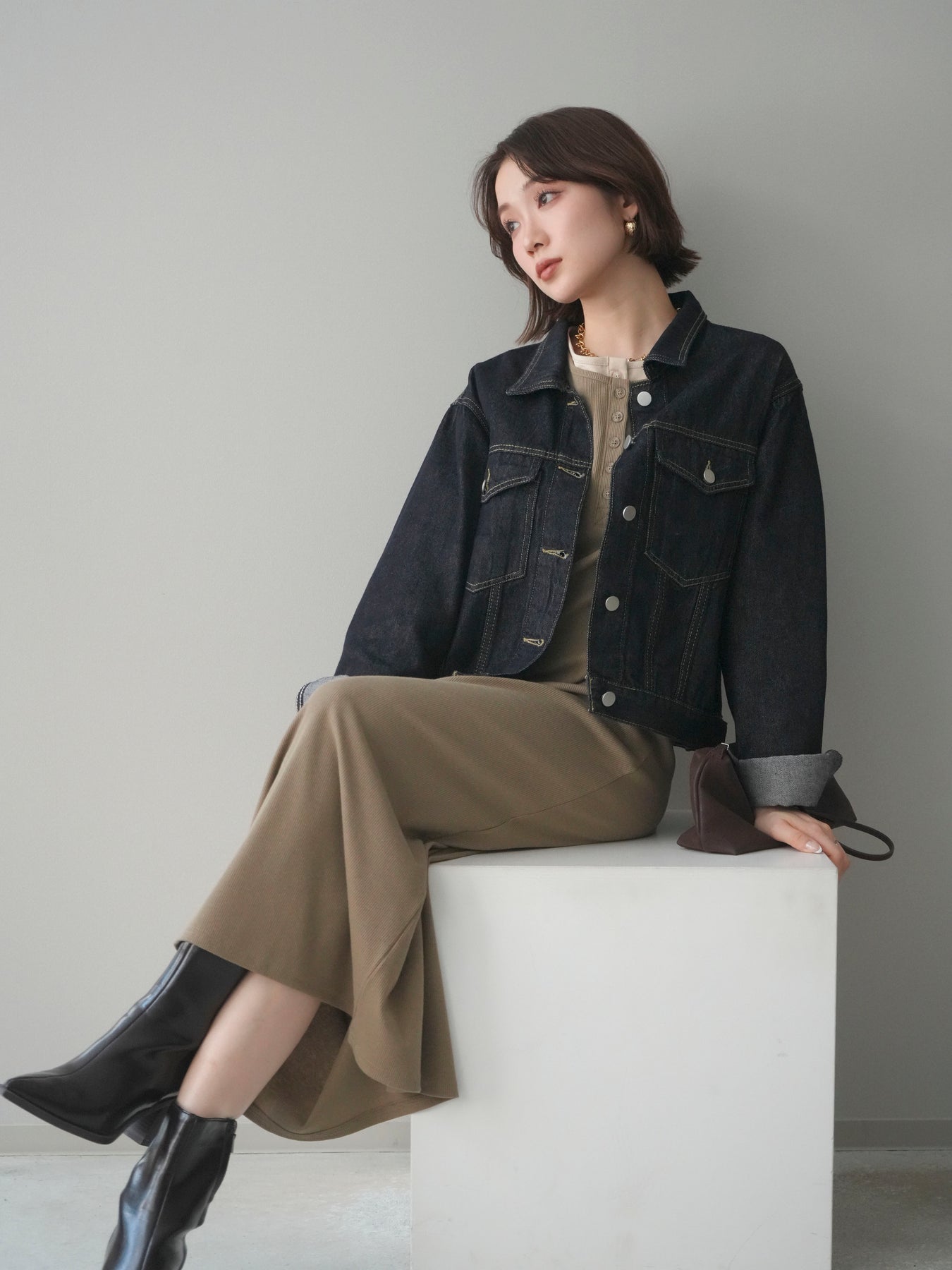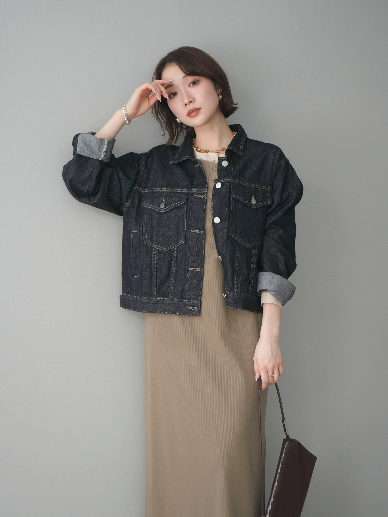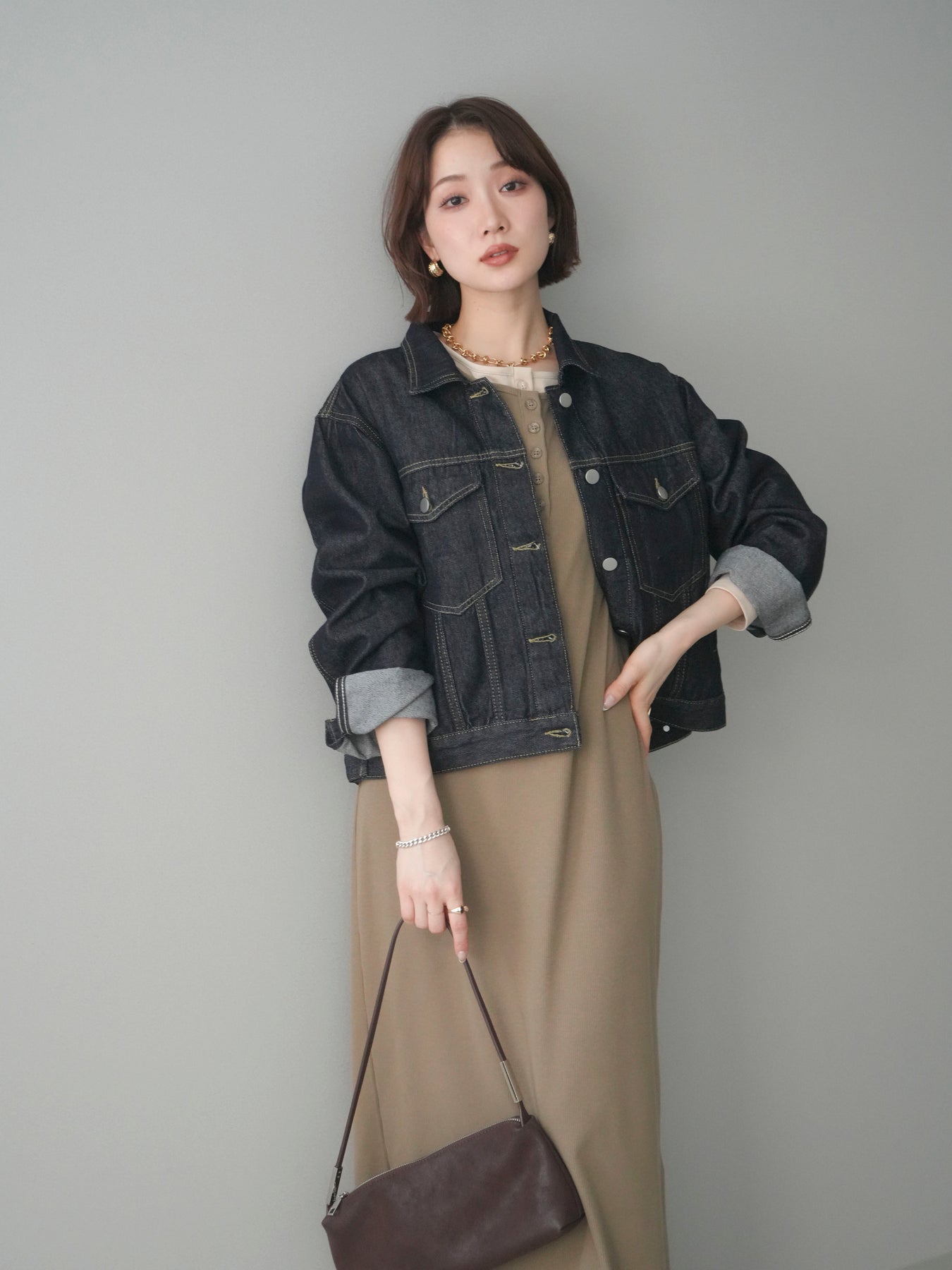 配色ステッチがさりげないアクセントになったデニムジャケット。 ベーシックなデザインをベースにしながら、ステッチ使いで表情を持たせ、シンプルすぎない仕上がりにまとめています。 程よくゆとりのあるシルエットで、インナーを選ばず重ねやすい一着。 袖をロールアップしたり、前を開けてラフに羽織ったりと、着こなしのアレンジも自在です。 ワンピースやスカート、パンツスタイルまで幅広く合わせやすく、スタイリングに程よいカジュアル感をプラスしてくれます。 季節の変わり目にも活躍し、長くワードローブに寄り添うデニムジャケットです。 ※ボトムス、キャミソール(インナー)以外の商品は一律でインナーは付属していません。