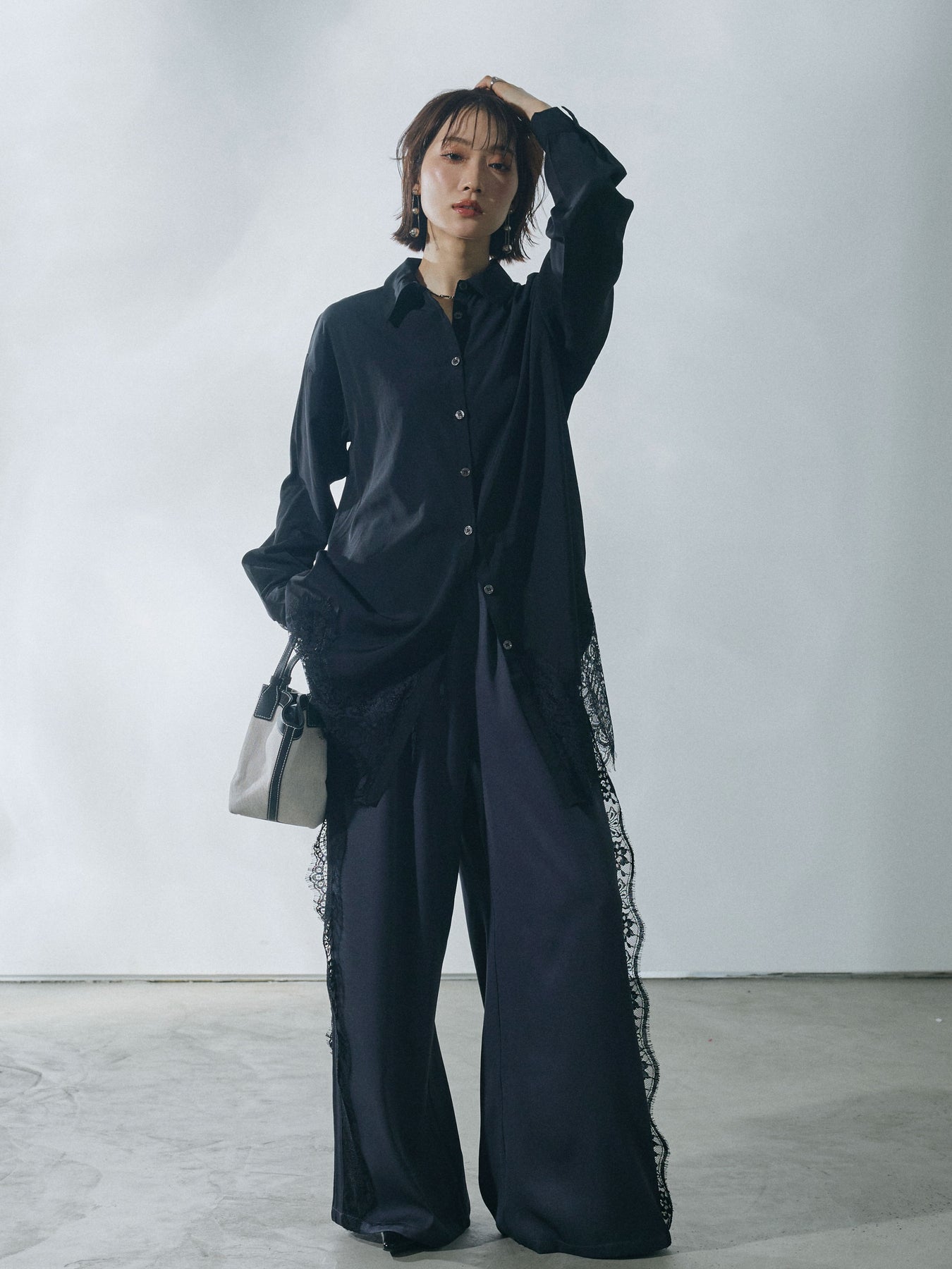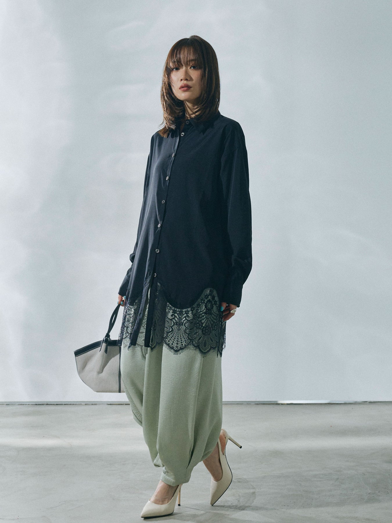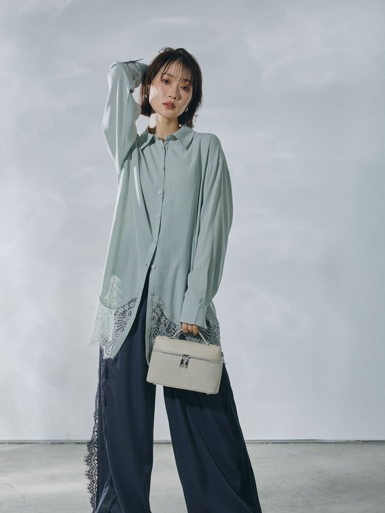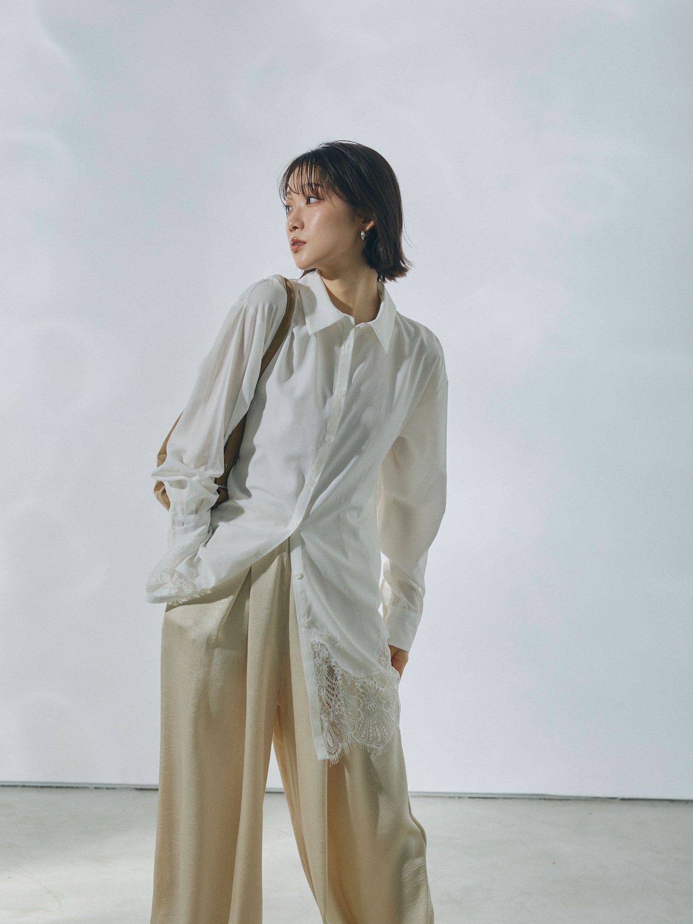 ハリ感のあるポプリン素材に、裾レースをあしらった上品な印象のシャツ。シンプルなデザインをベースに、裾のレースディテールがさりげない華やかさと抜け感をプラスします。程よくゆとりのあるシルエットで一枚着としてはもちろん、レイヤードスタイルにも取り入れやすく、デイリーからお出かけまで幅広く活躍する一着です。