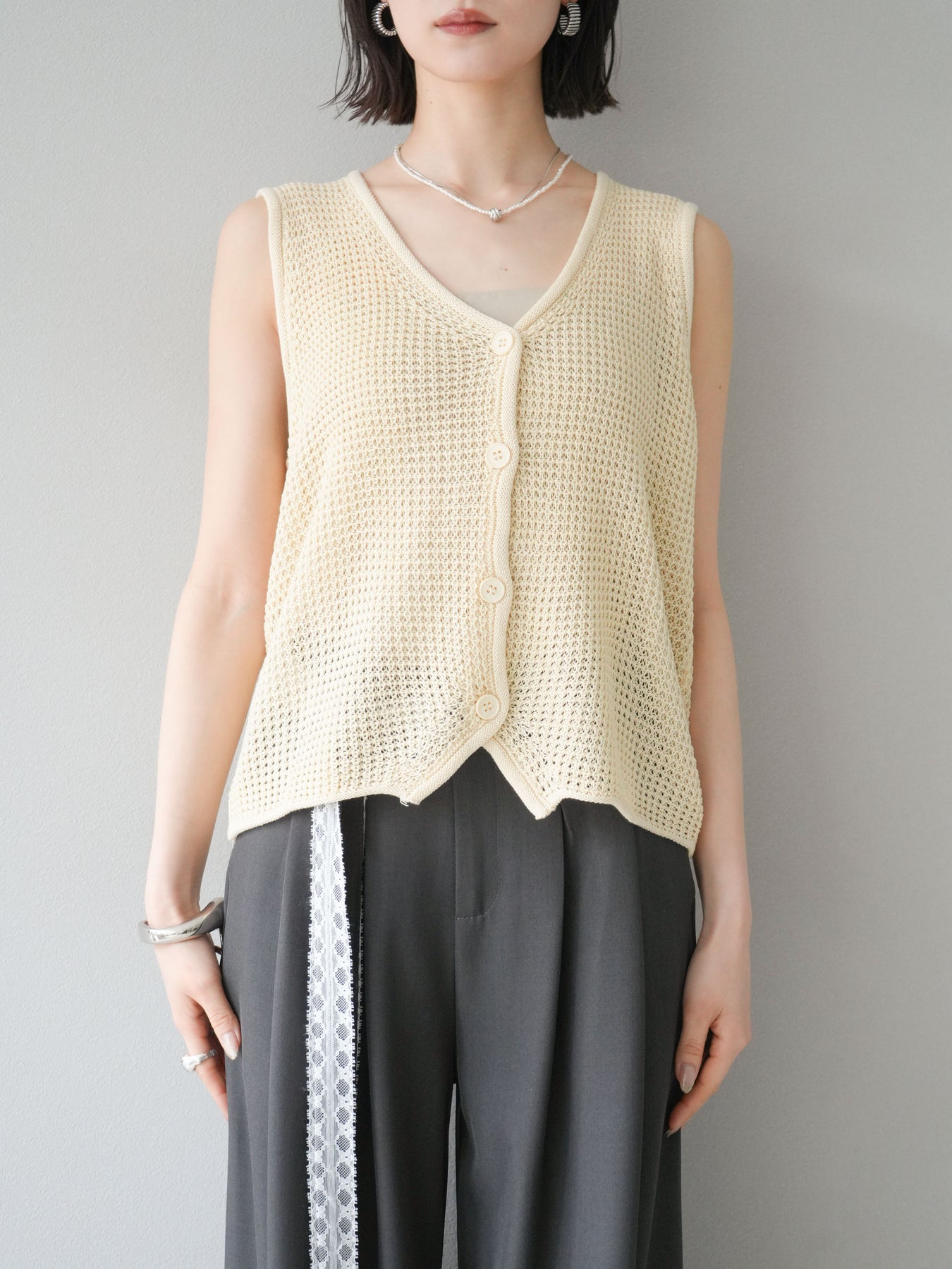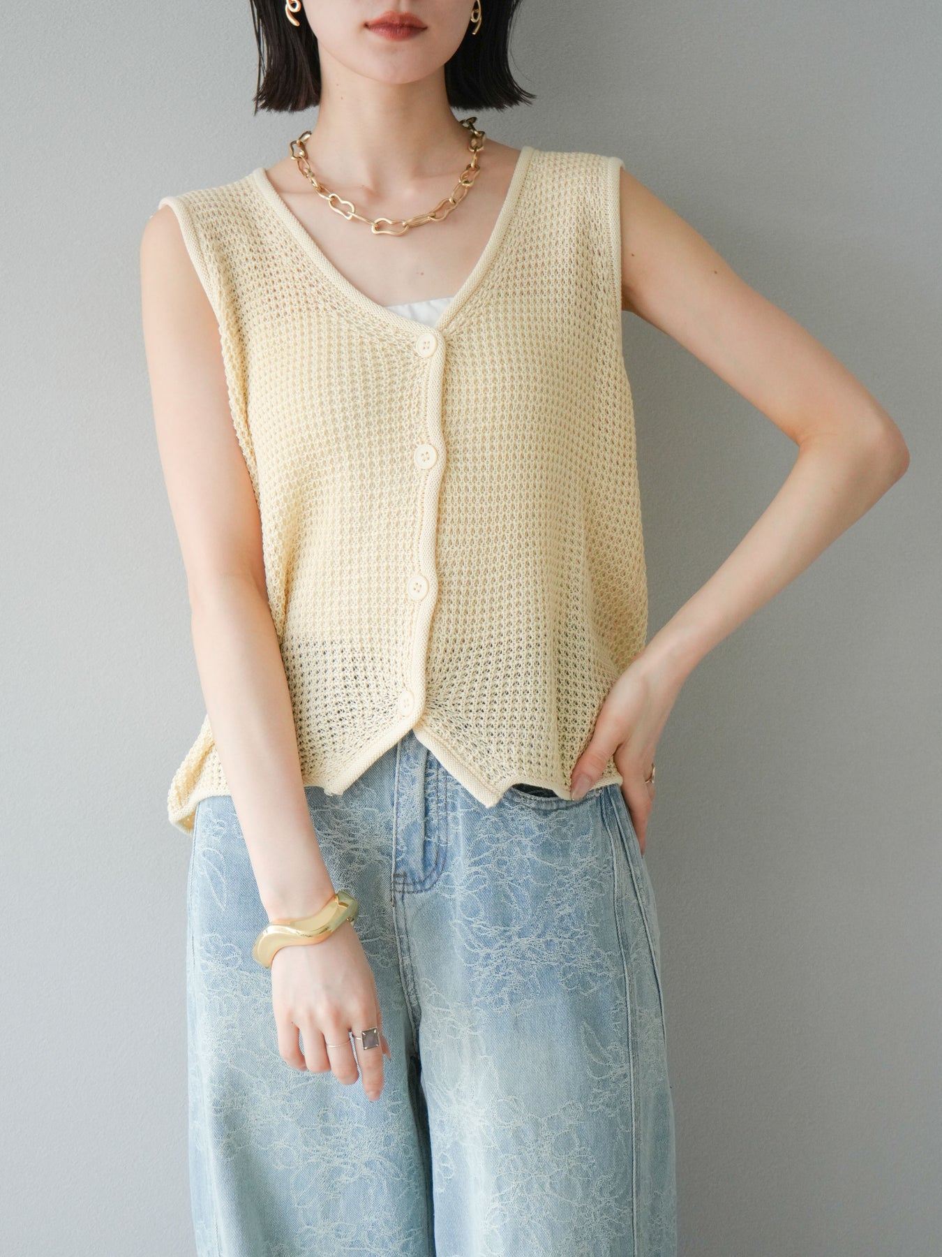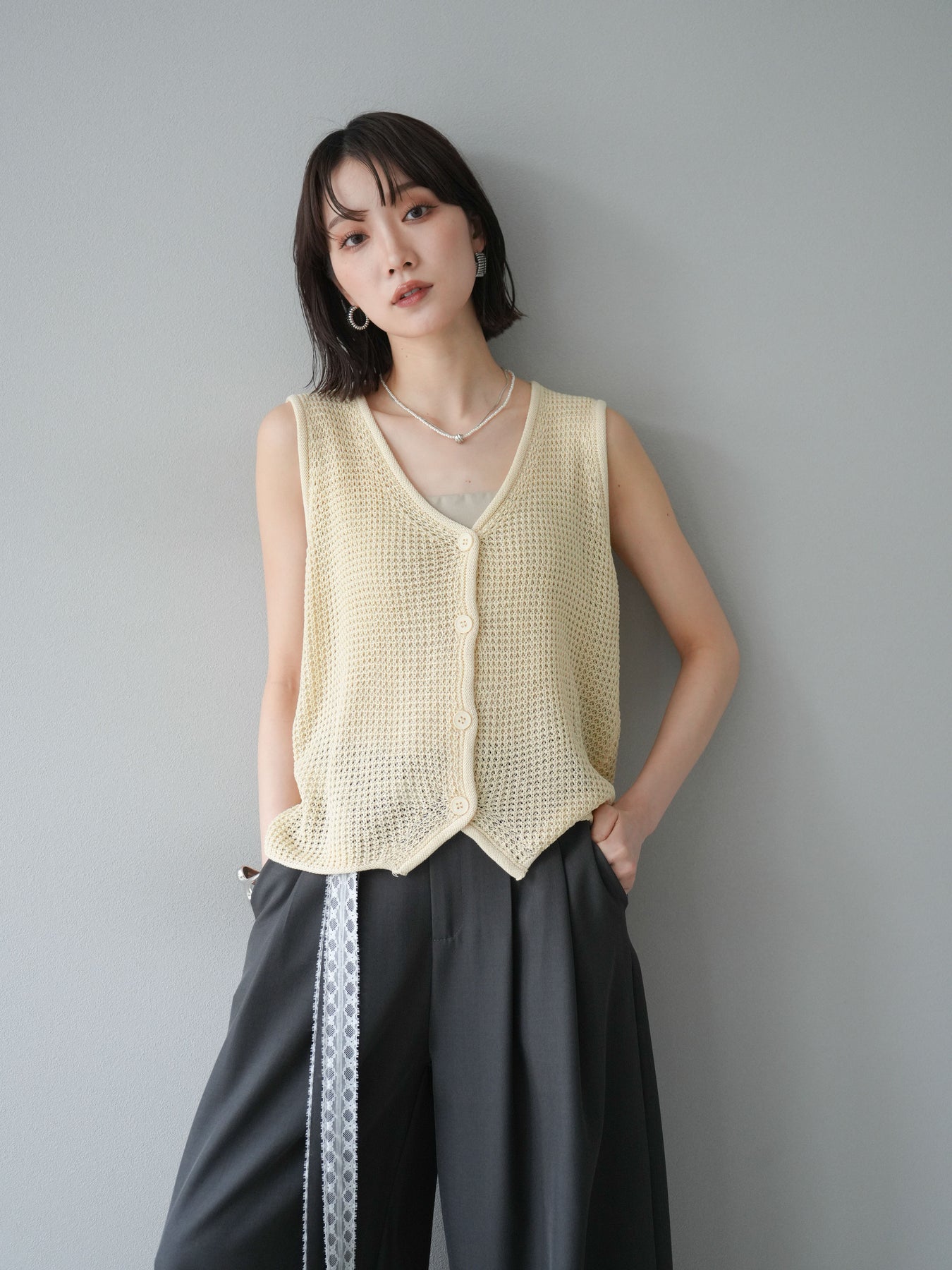 立體華夫格針織背心,非常適合春夏季節。輕盈透氣的材質,即使在炎熱天氣也能保持舒適穿著。正面扣環設計,方便穿脫,也適合搭配各種風格的內搭。 V領設計,打造乾淨俐落的臉部造型,可搭配各種內衣。色彩柔和,從自然到女性化的多種風格都能輕鬆搭配。 *除下裝和吊帶背心(內衣)外,其他商品均不含內衣。