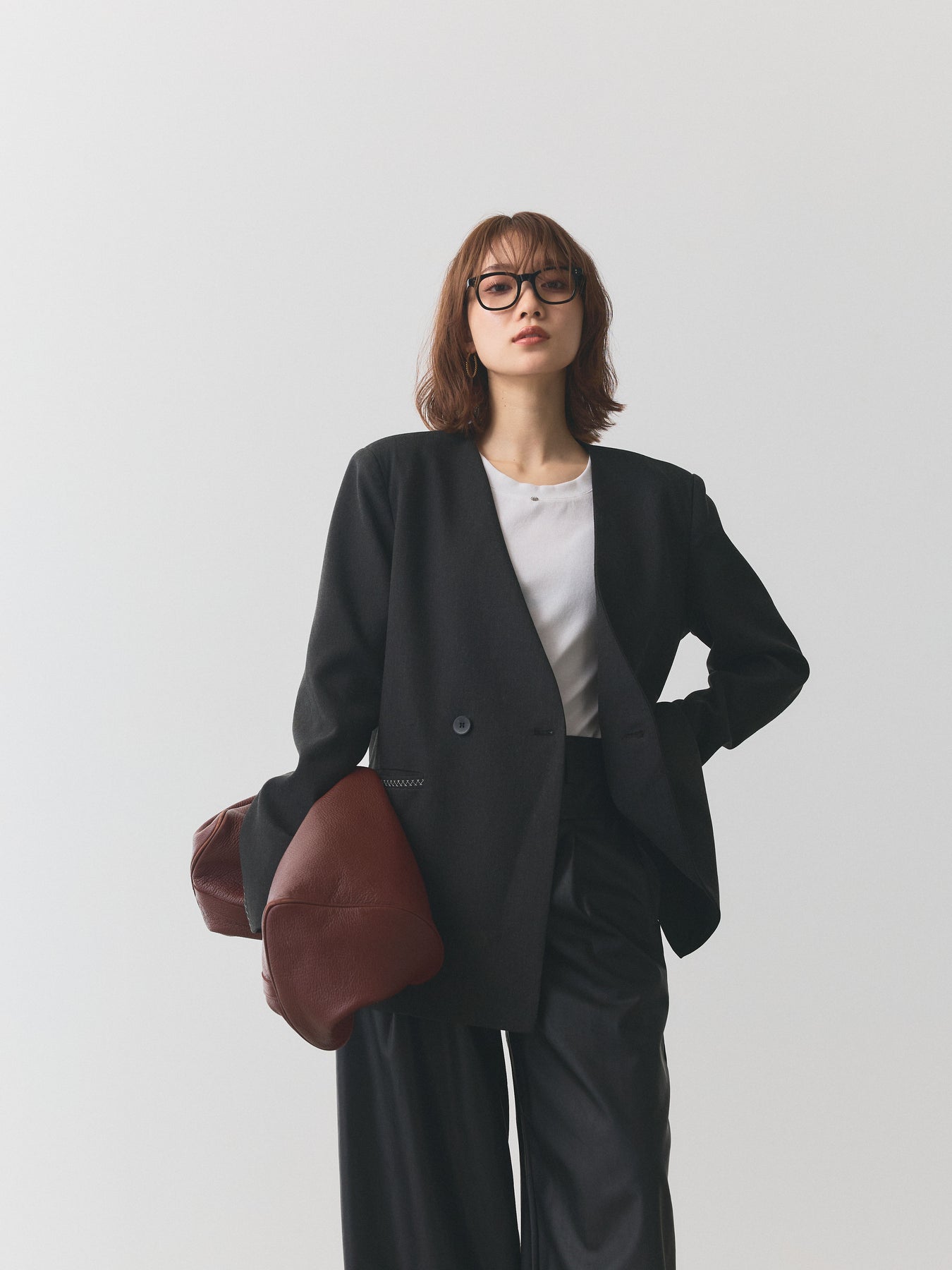 すっきりとしたノーカラーに、フロントポケット部分へさりげなく施されたステッチがアクセントになったジャケット。シンプルで洗練されたデザインながらも、細部にこだわりを感じられる一着です。程よいオーバーシルエットで抜け感を演出し、オンオフ問わず着回しやすい万能アイテム。ブラウスやワンピースに羽織ればきれいめに、カットソーやデニムと合わせればカジュアルにと、幅広いスタイリングで活躍します。 ※ボトムス、キャミソール(インナー)以外の商品は一律でインナーは付属していません。