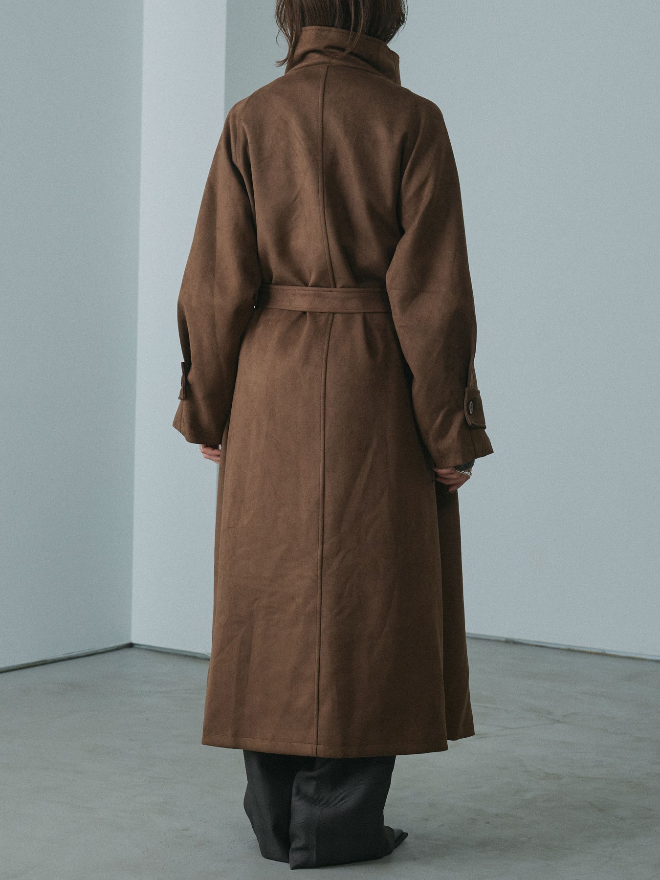 しなやかなスウェード調素材とフェイクレザーを組み合わせた、上品なムード漂うロングコート。 異素材のコントラストが洗練された印象を与え、羽織るだけでスタイルが完成する存在感のある一枚です。 ゆったりとしたシルエットながらも、落ち感のある生地が身体のラインを美しく見せ、抜け感のある大人の雰囲気を演出。 柔らかな質感で軽く羽織れるため、季節の変わり目にも活躍します。 デイリーから特別なシーンまで、幅広いスタイリングにマッチする主役アウターです。 ※ボトムス、キャミソール(インナー)以外の商品は一律でインナーは付属していません。