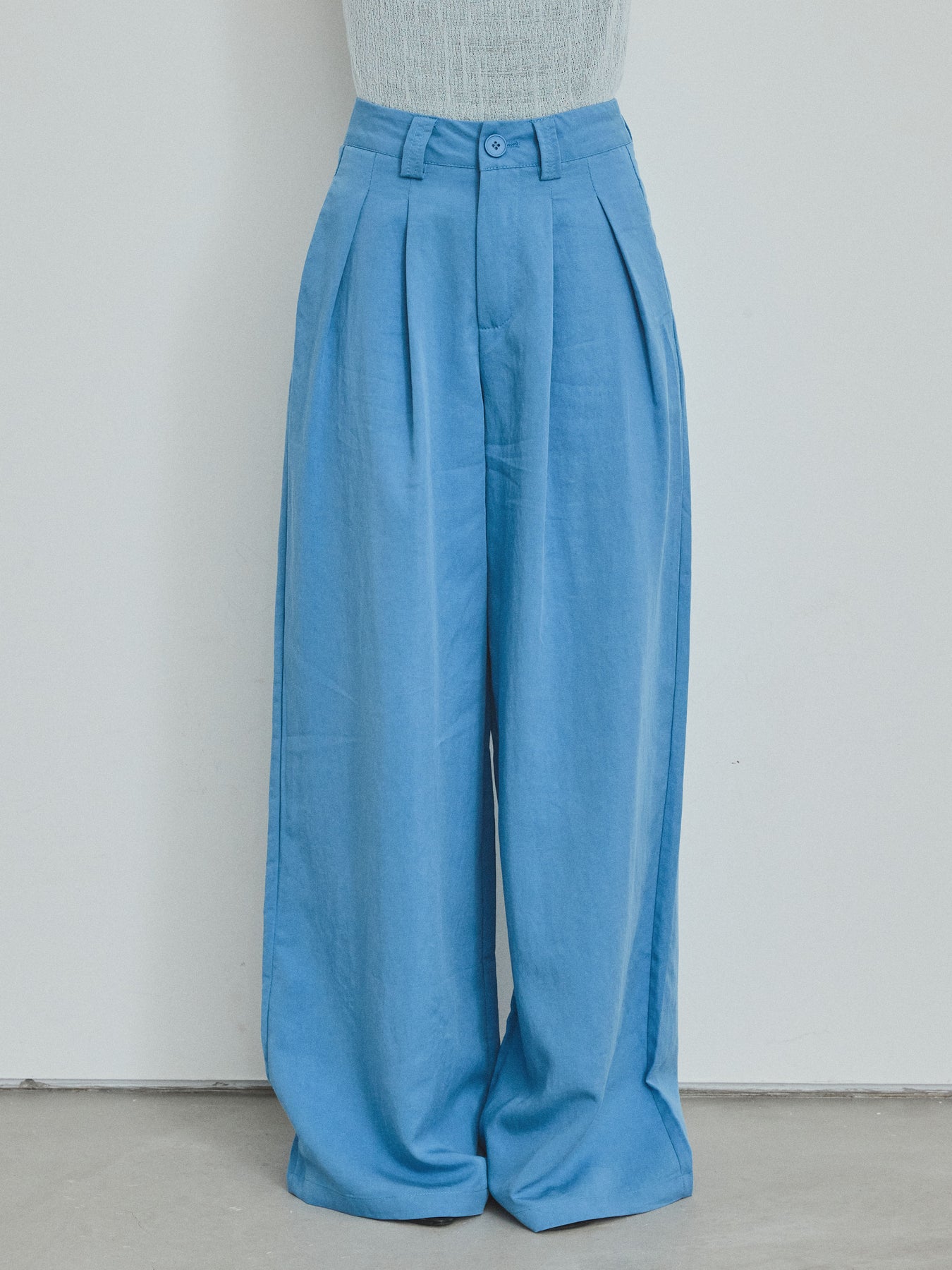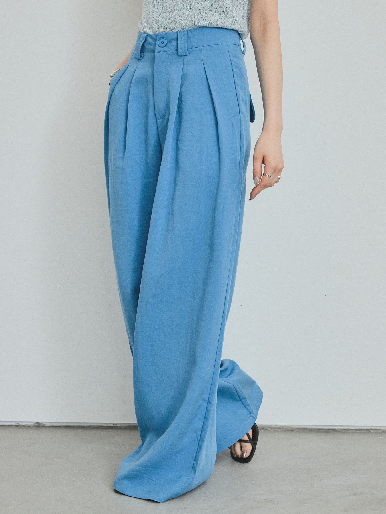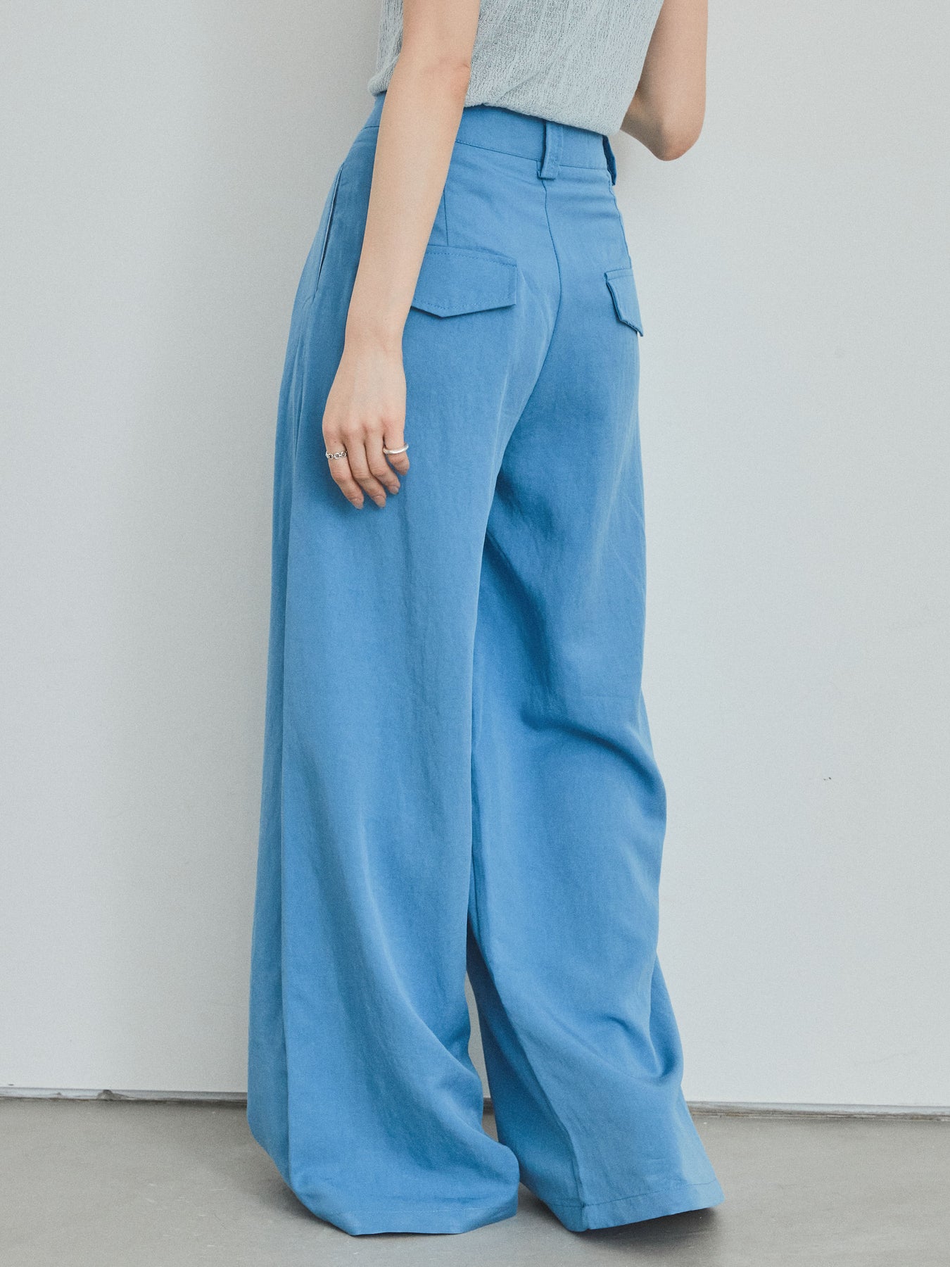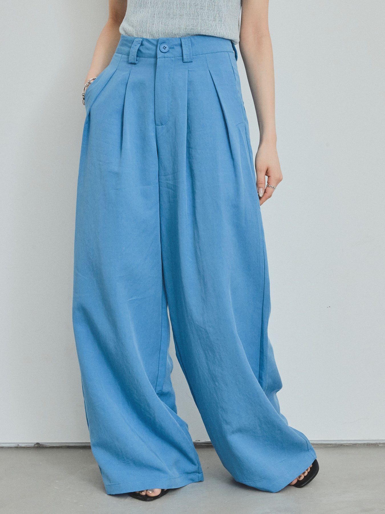 【預訂】亞麻觸感褶邊闊腿褲/藍色