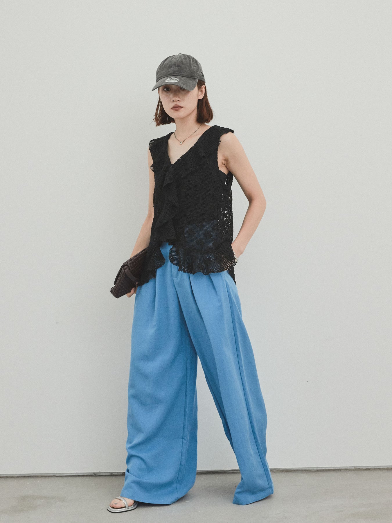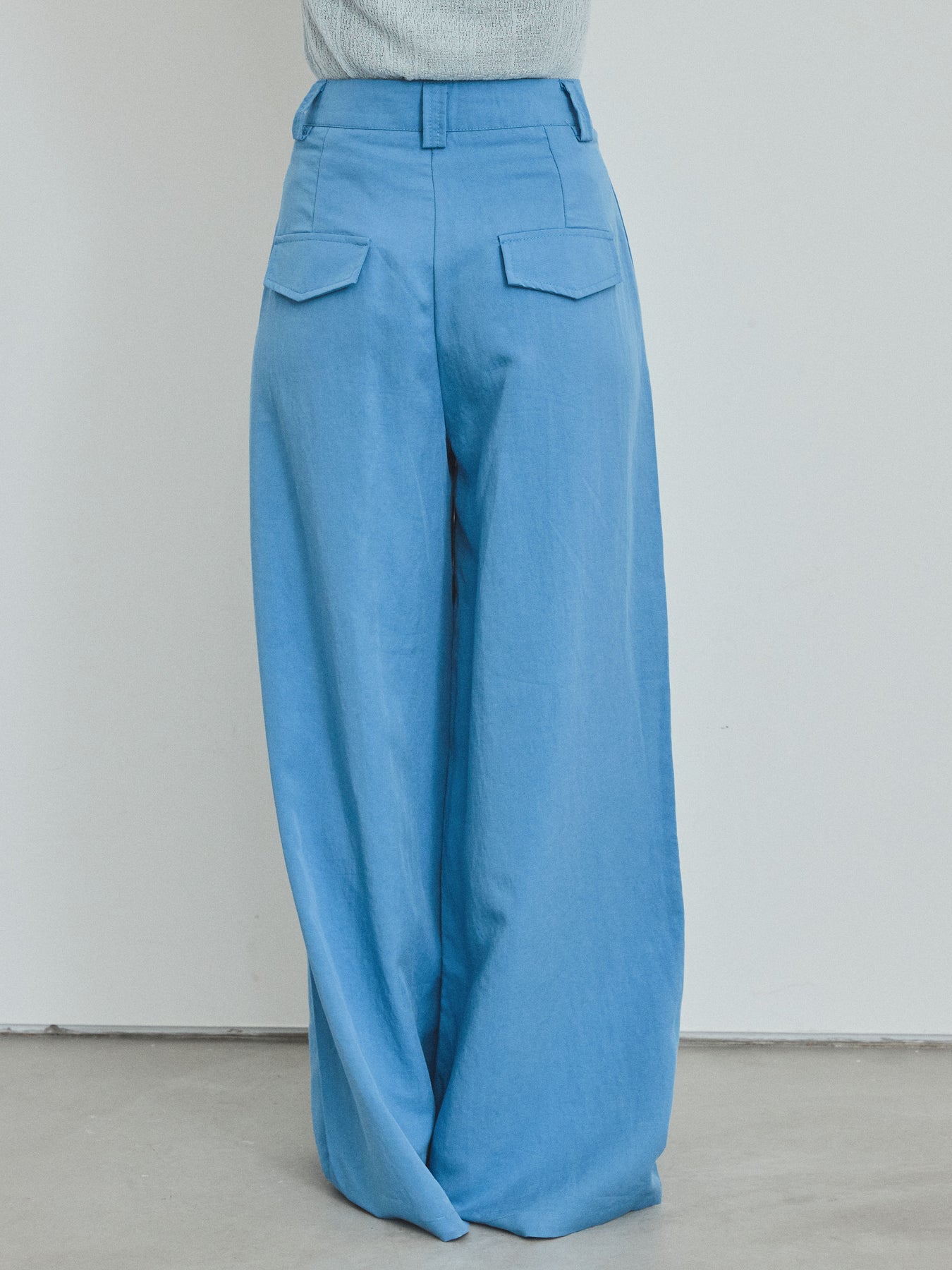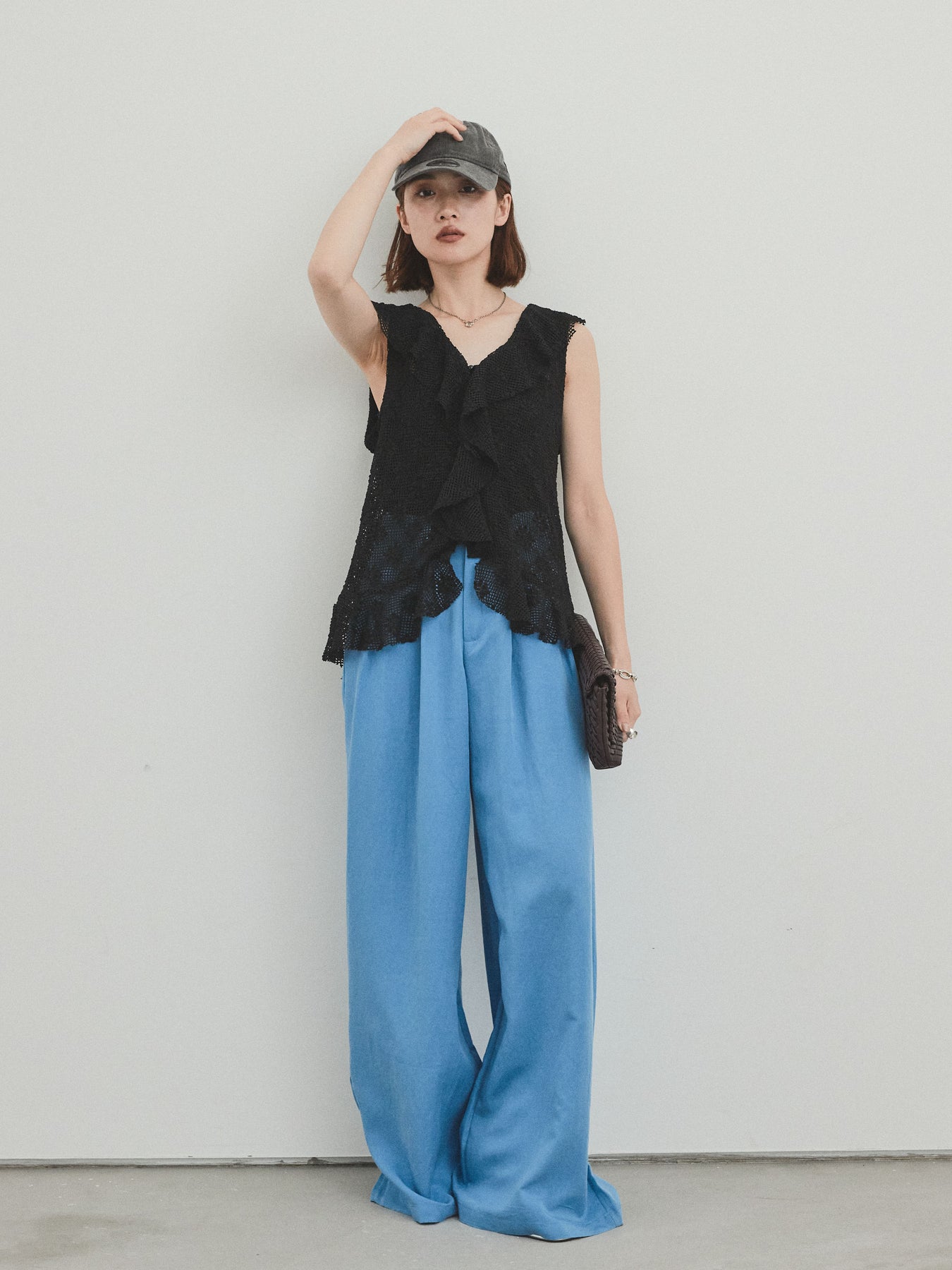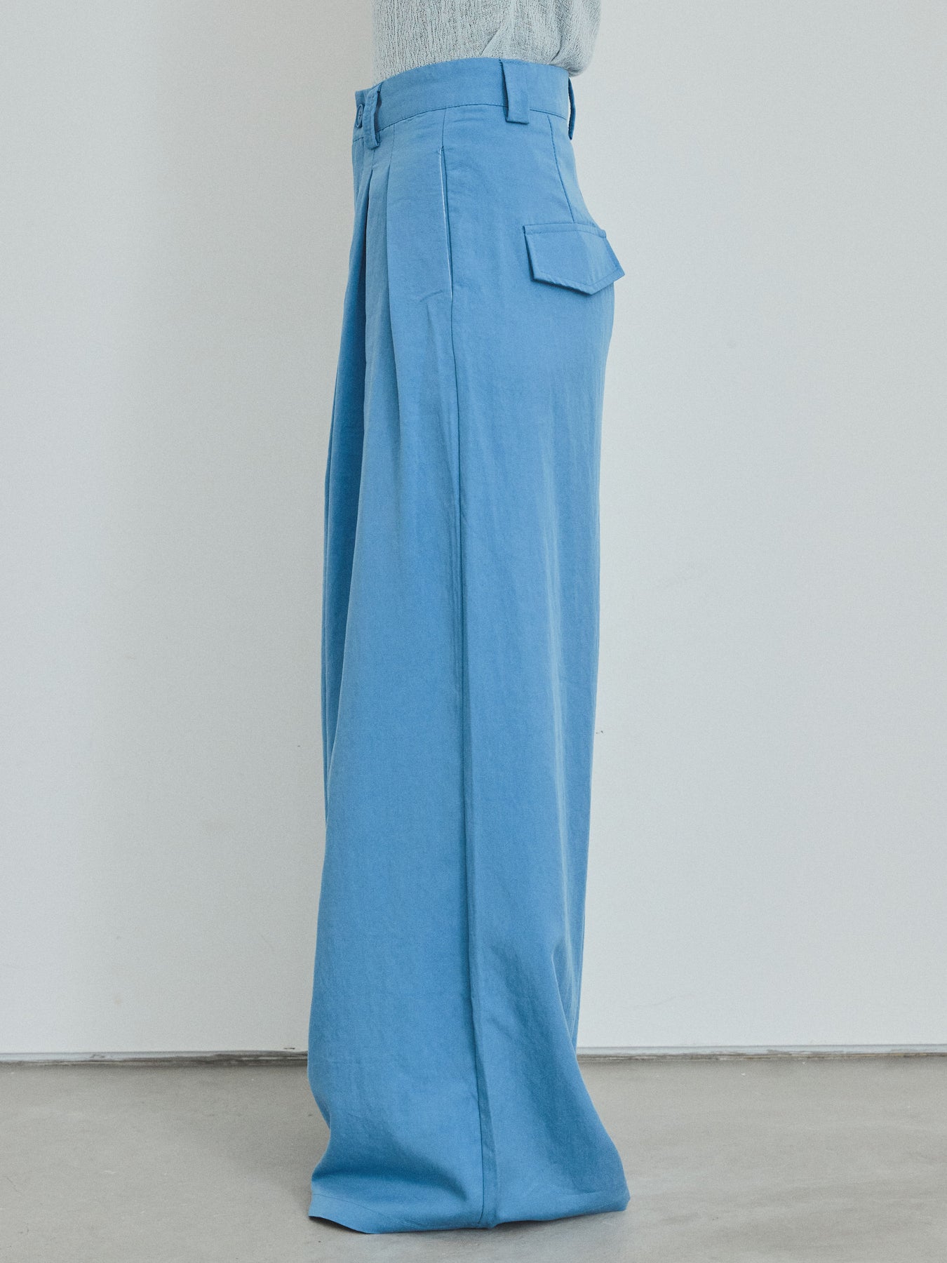 【預訂】亞麻觸感褶邊闊腿褲/藍色