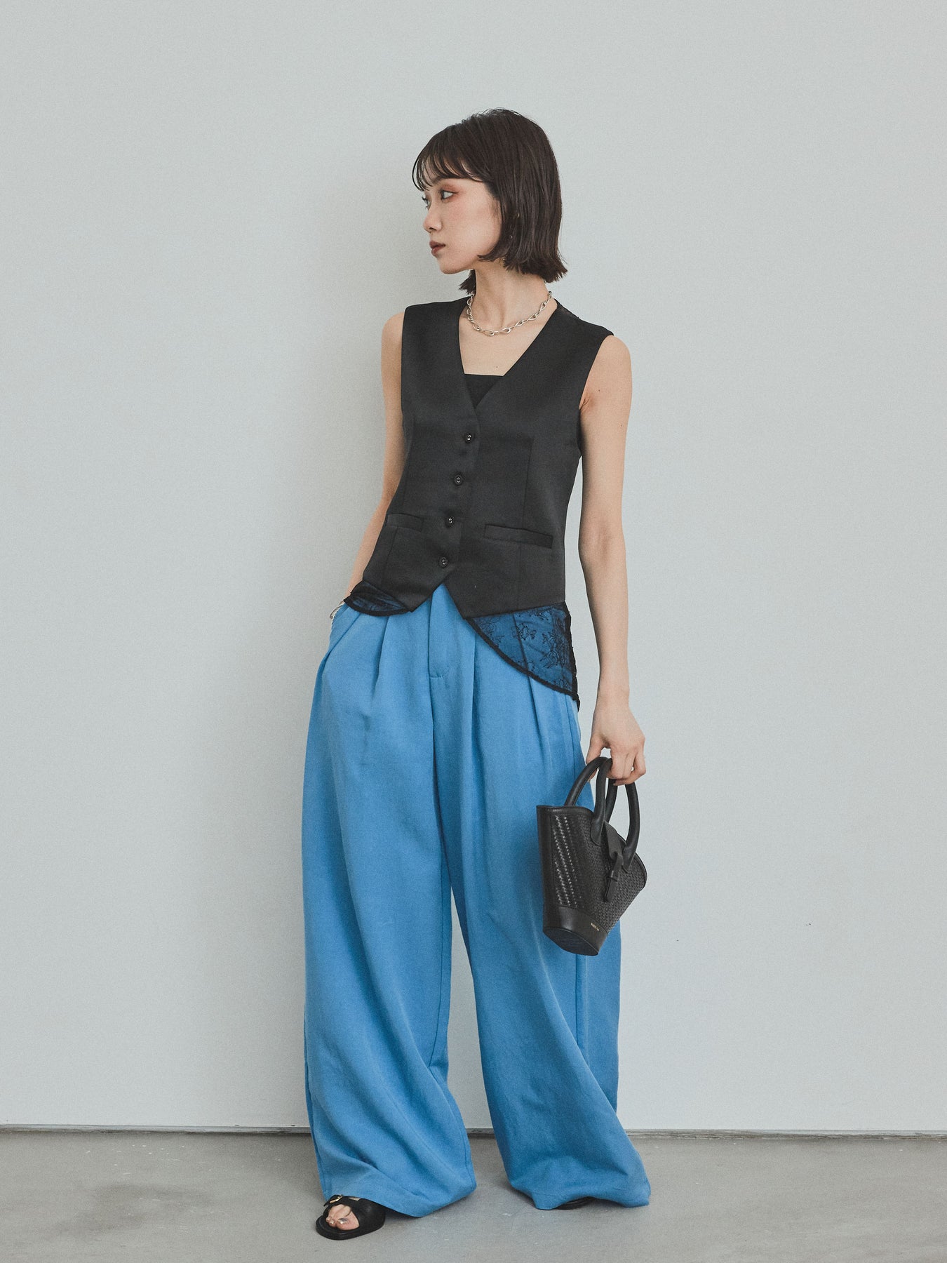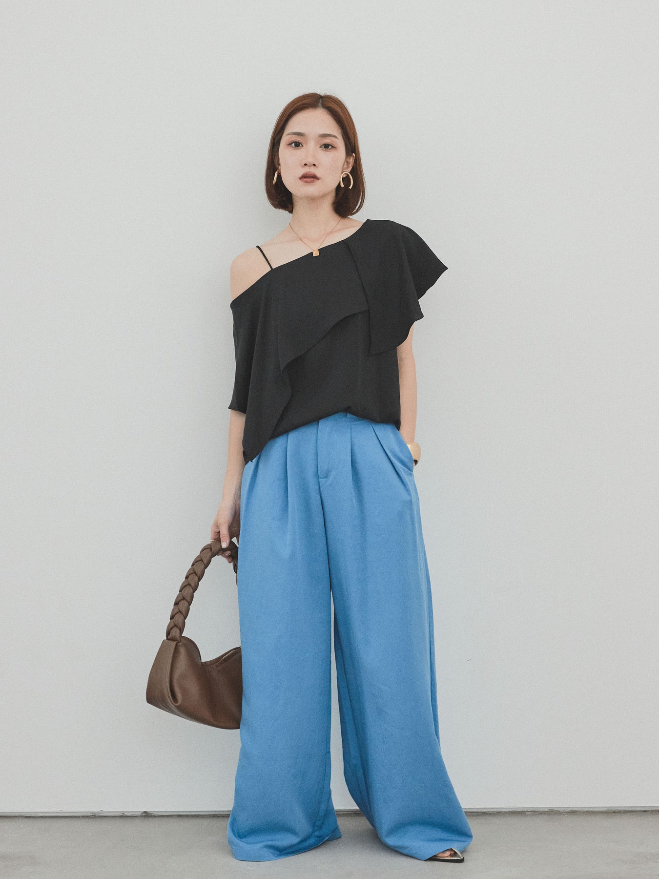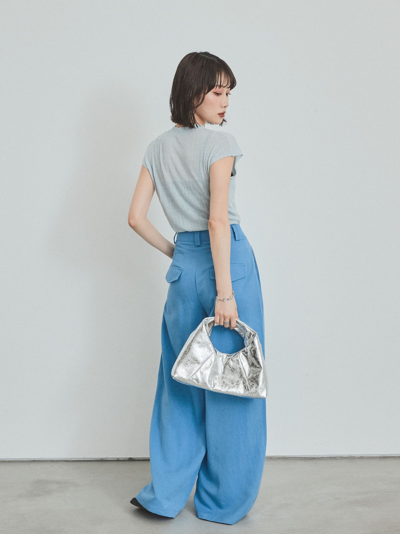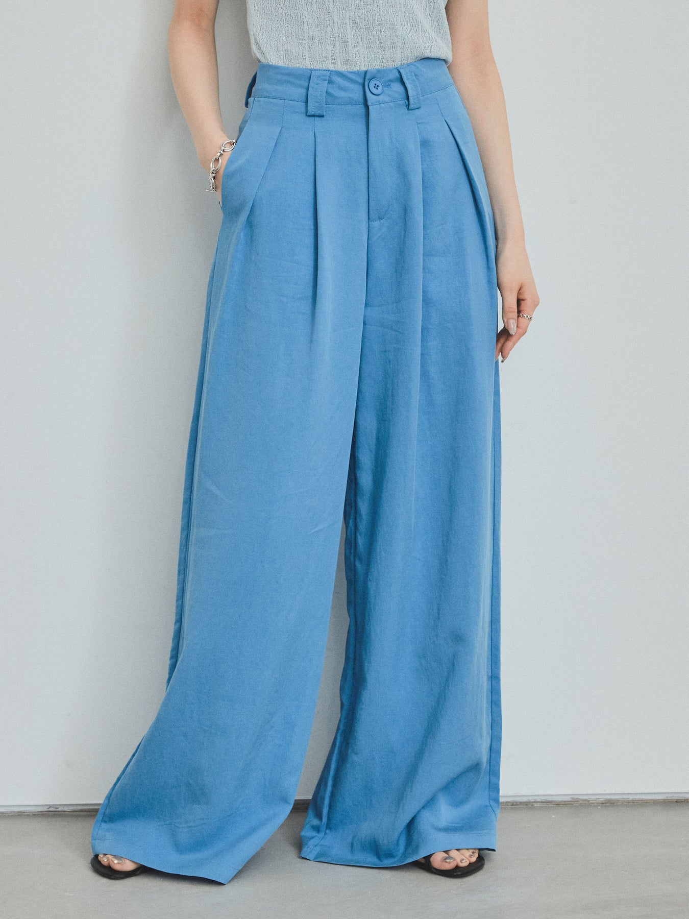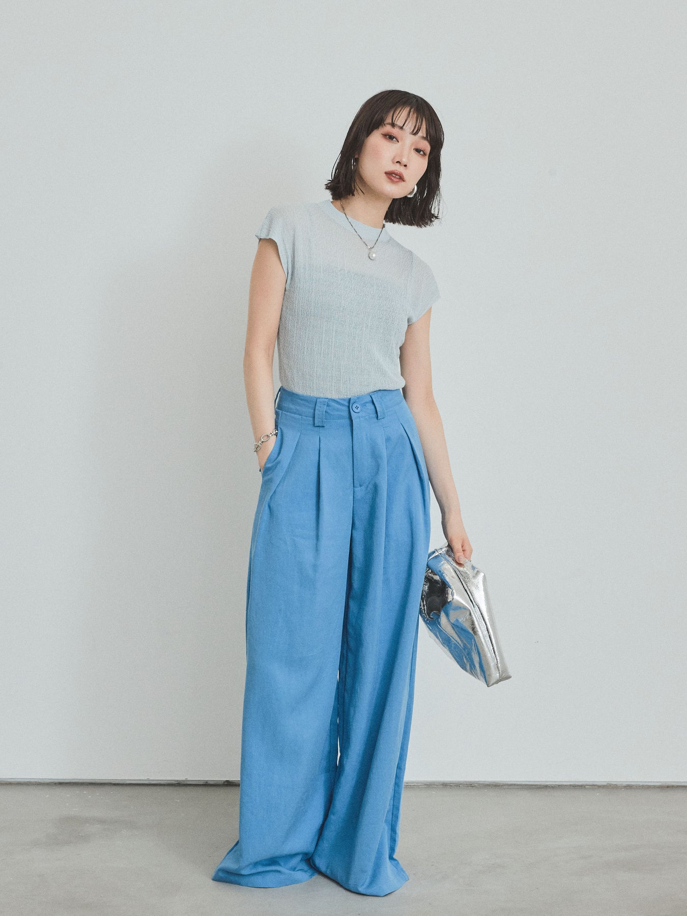 【預訂】亞麻觸感褶邊闊腿褲/藍色