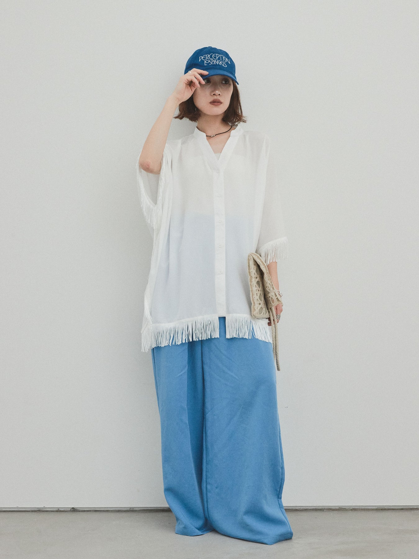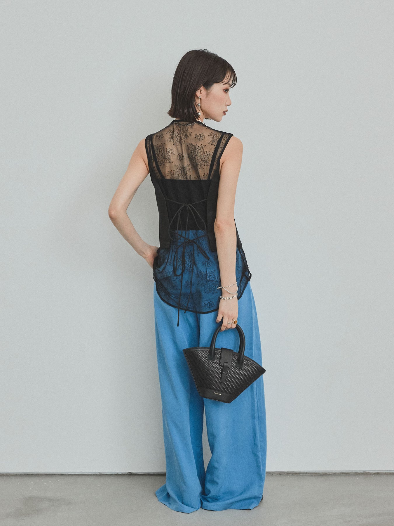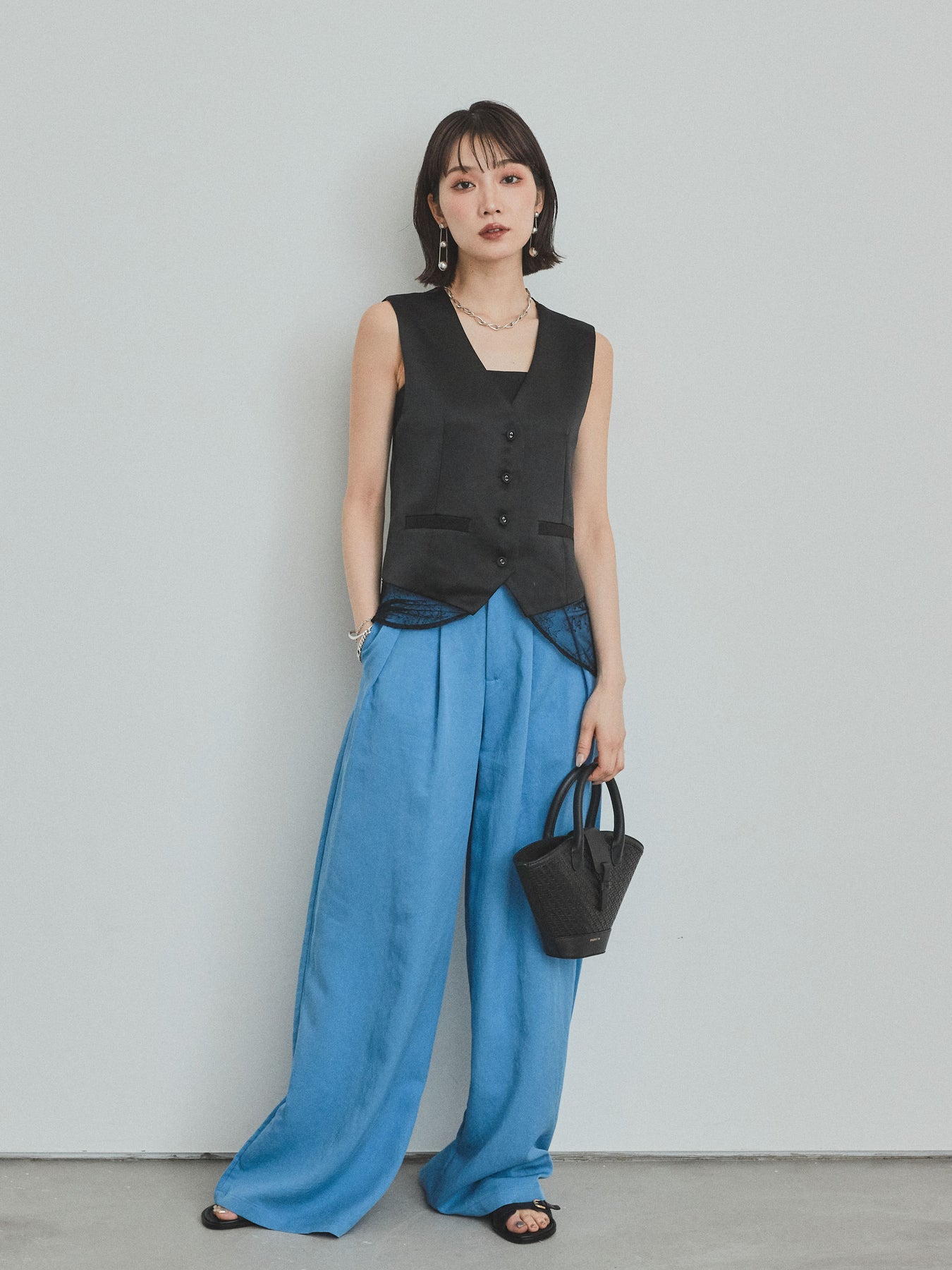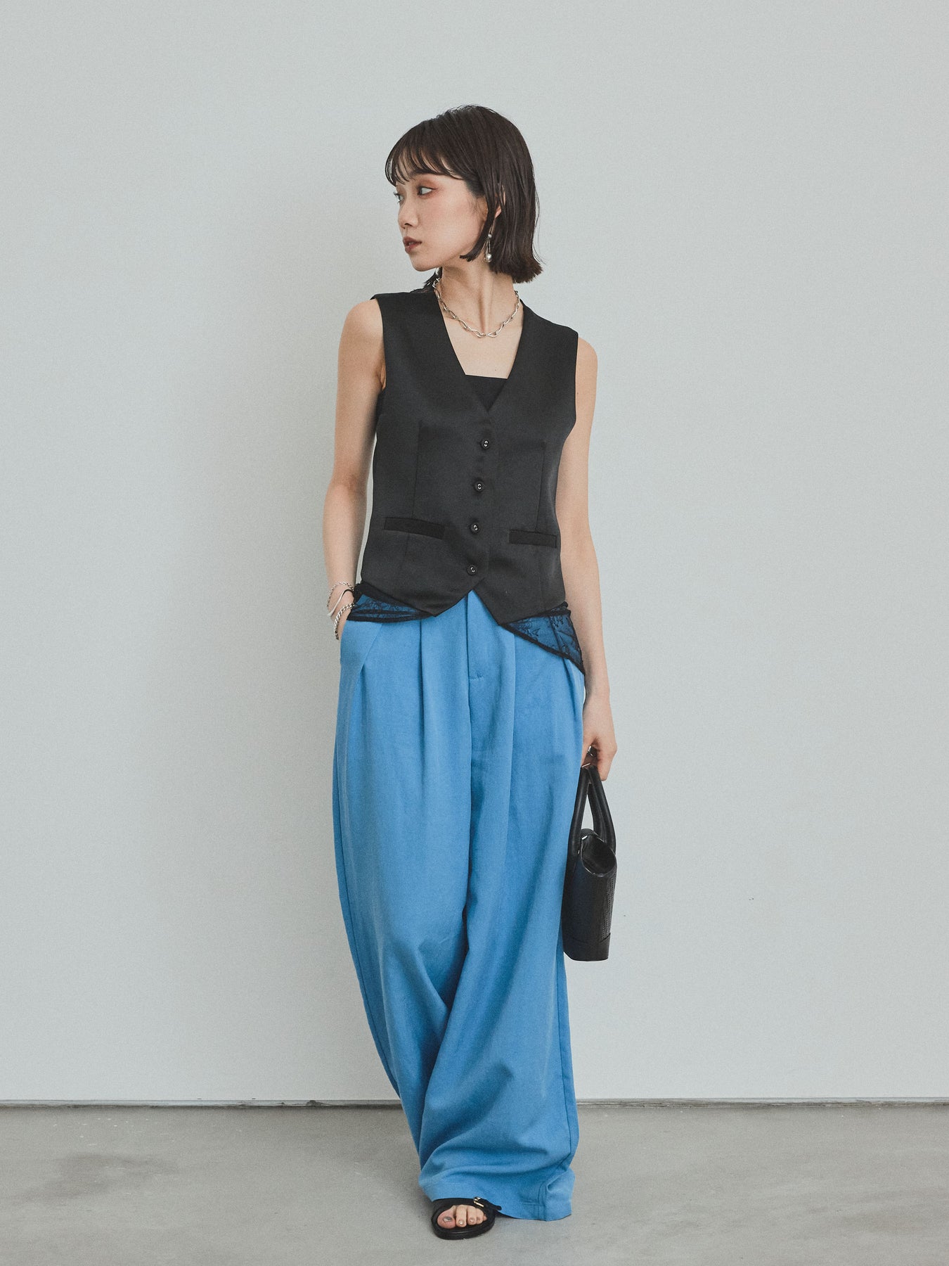 【預訂】亞麻觸感褶邊闊腿褲/藍色