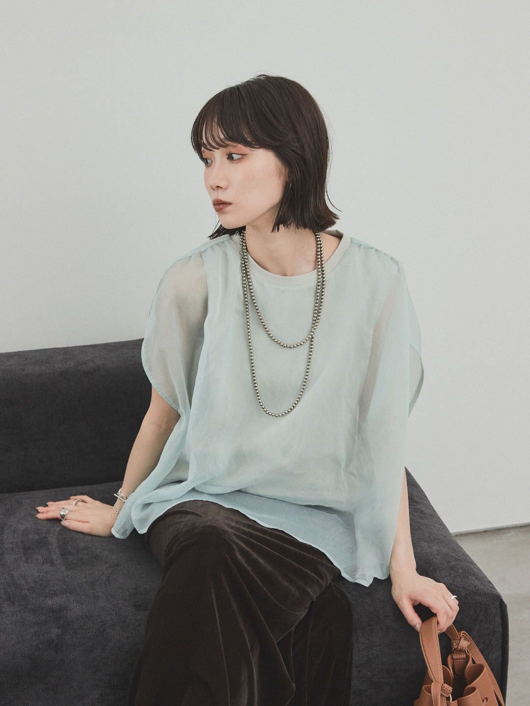 [預訂] 緊湊光滑透視多層上衣/薄荷綠