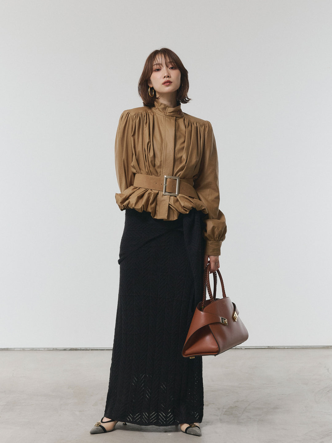 【Allure】[SET]透かし編みニットトップス&スカート3SET+ベルト付バルーンレザーブルゾン(2set)