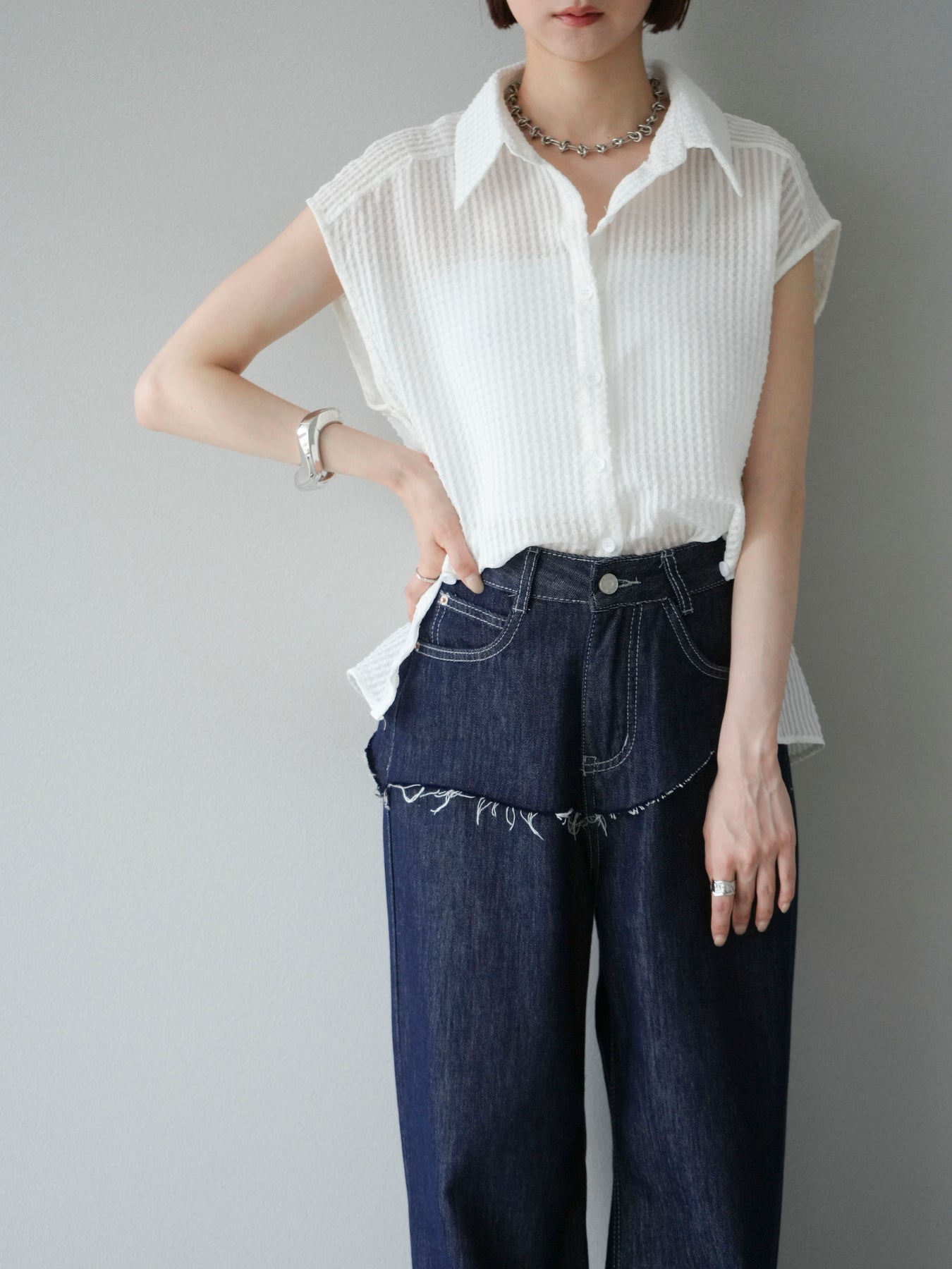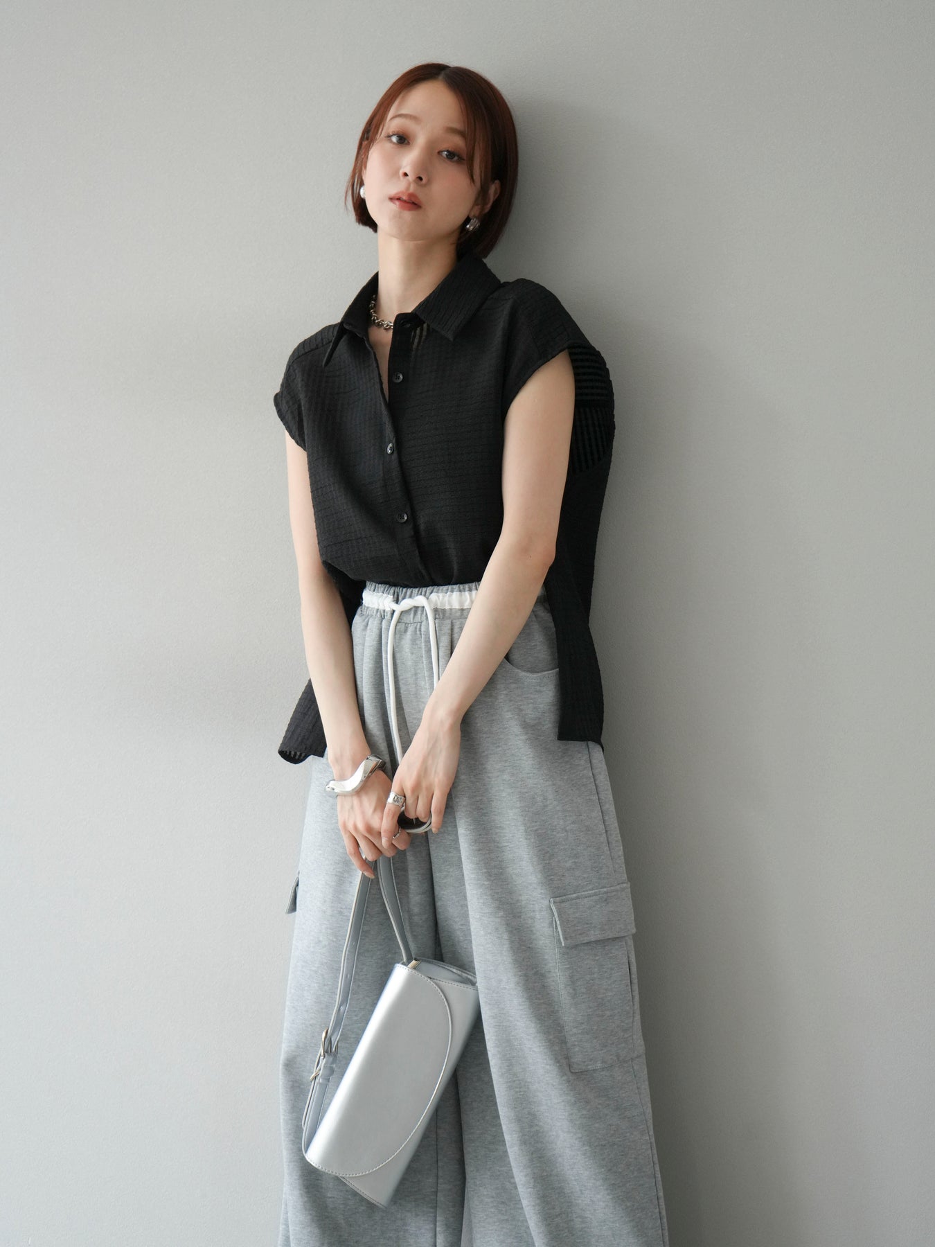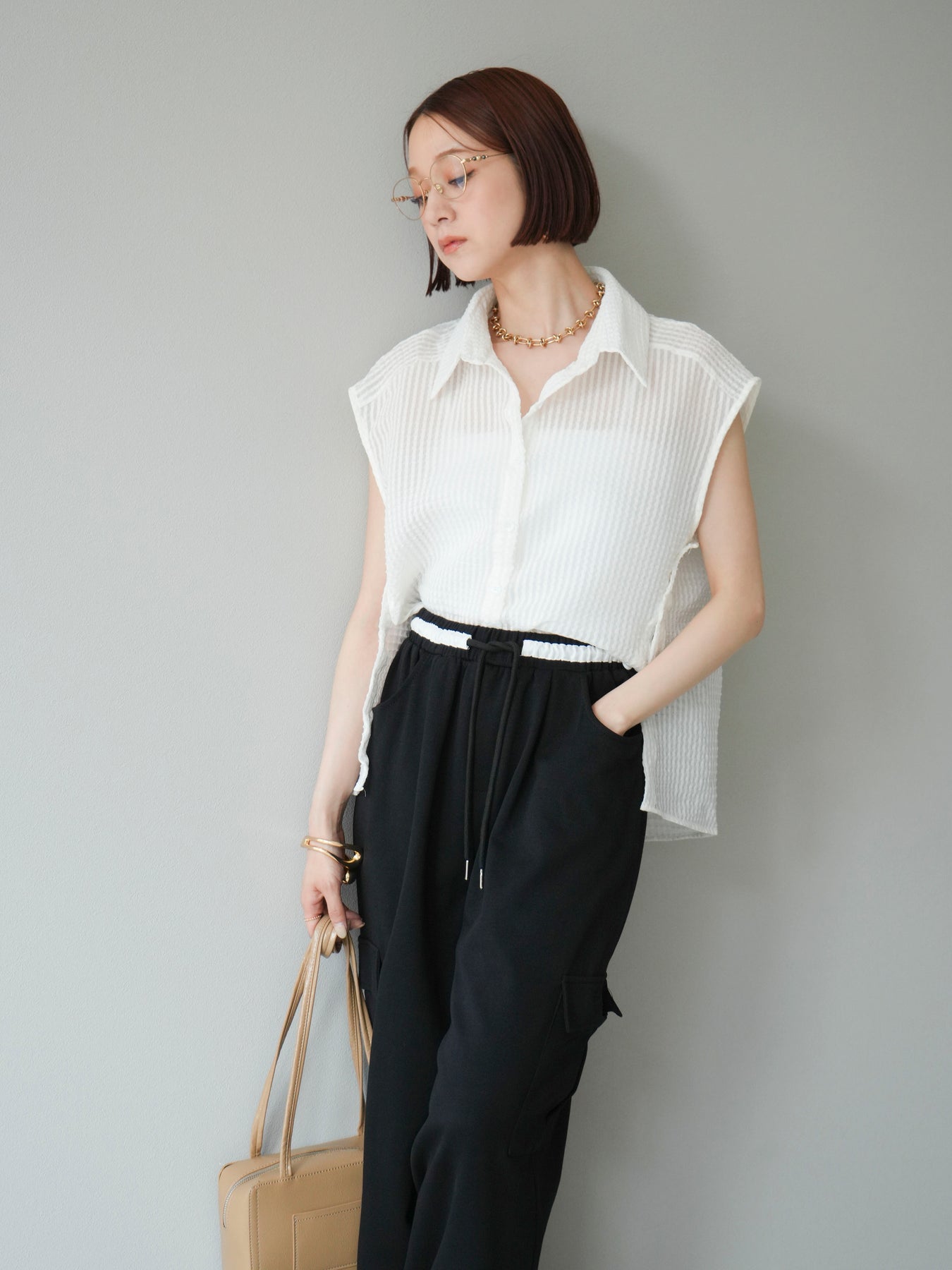 這款透視格紋無袖襯衫,散發清涼夏日氣息。精緻的格紋圖案織入半透明材質,營造出時尚輕盈的造型。側邊飾有精緻的荷葉邊,更添柔美氣質。立領與隱形紐扣設計,賦予其幹練俐落的氣質。它既可單穿,也可內搭背心或夾克。 ※除下裝、吊帶背心(內衣)以外的商品均不含內衣。