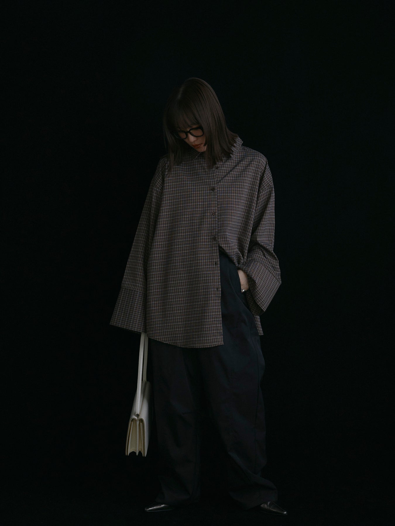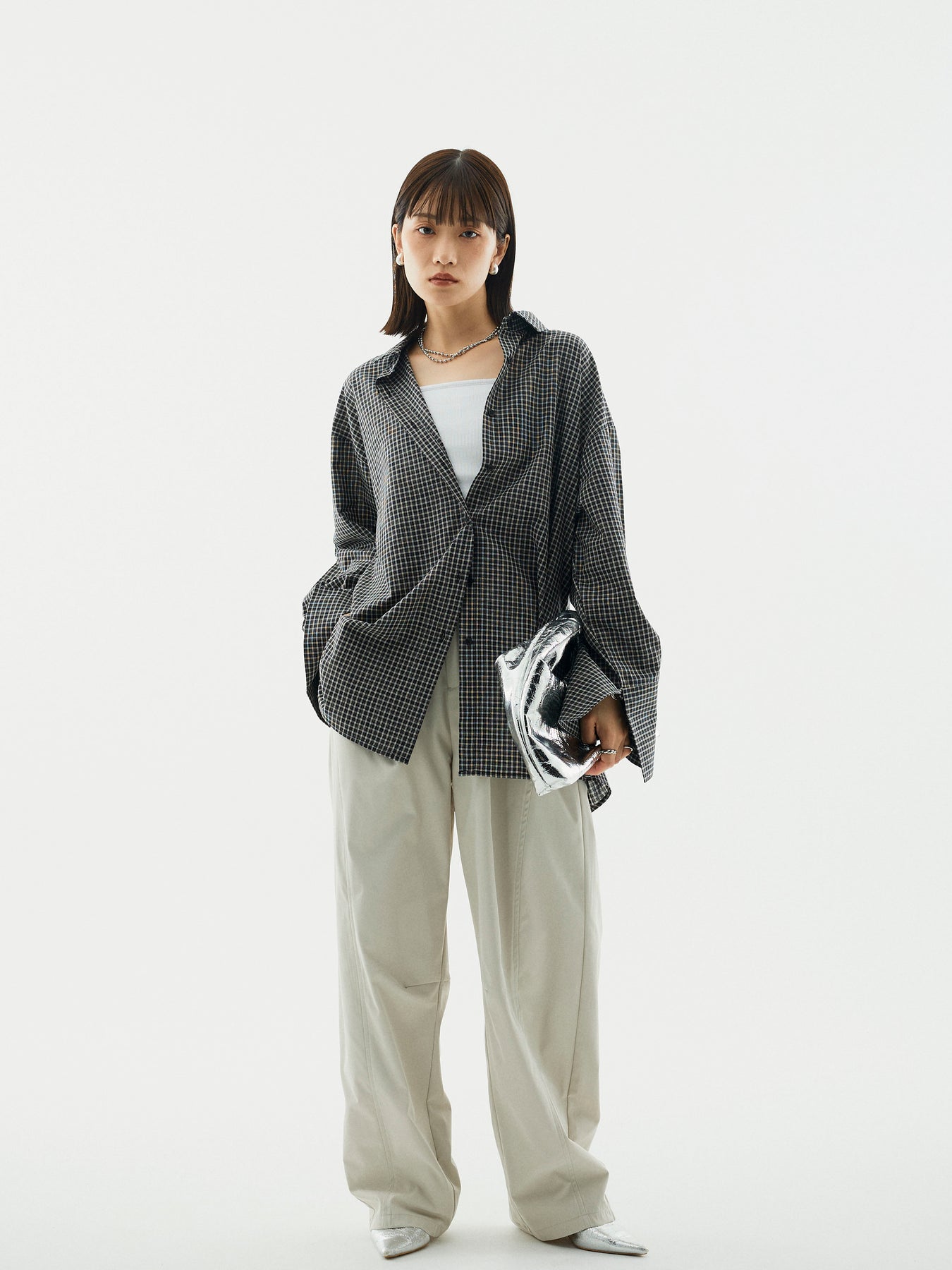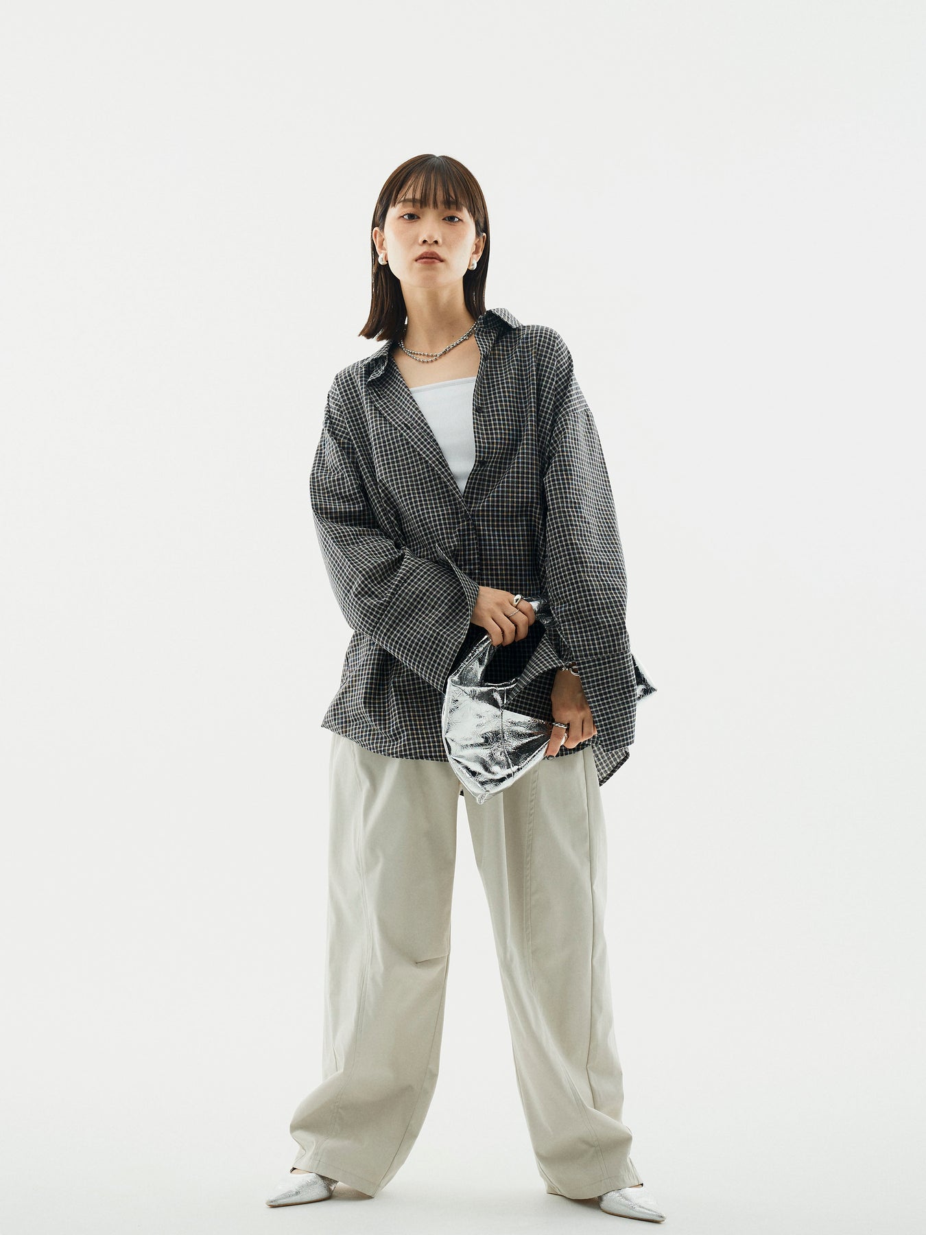 【Allure】[SET]チェックBIGカフスオーバーシャツ+タフタワイドカーブパンツ(2set)