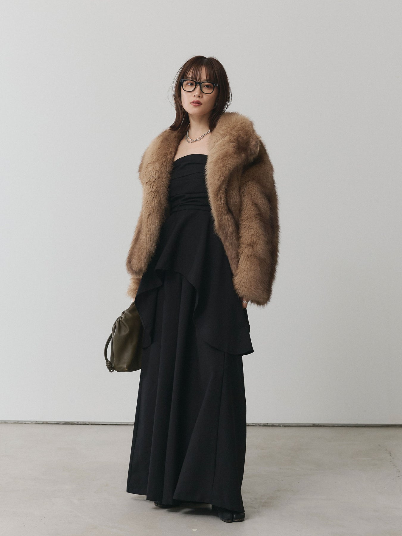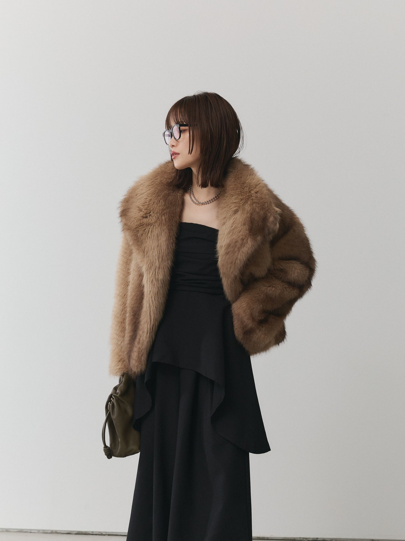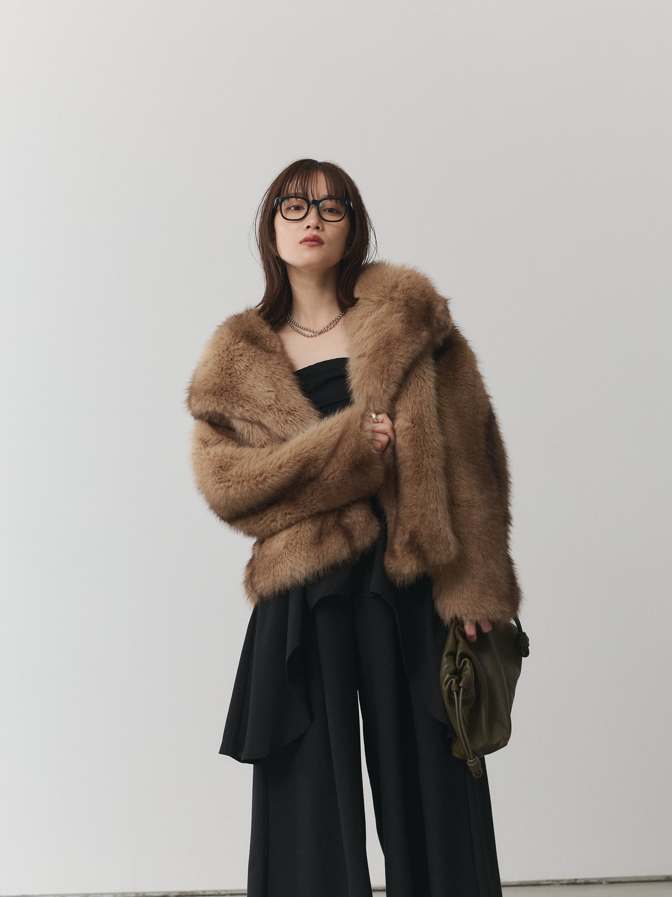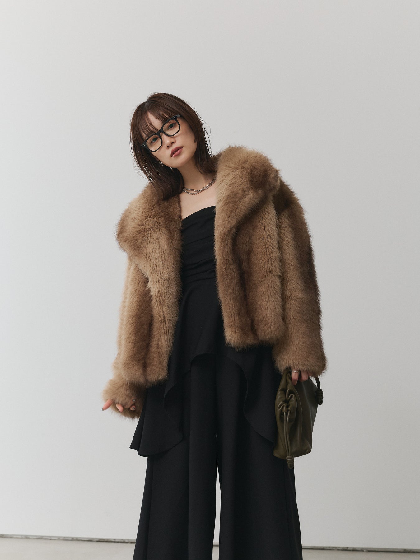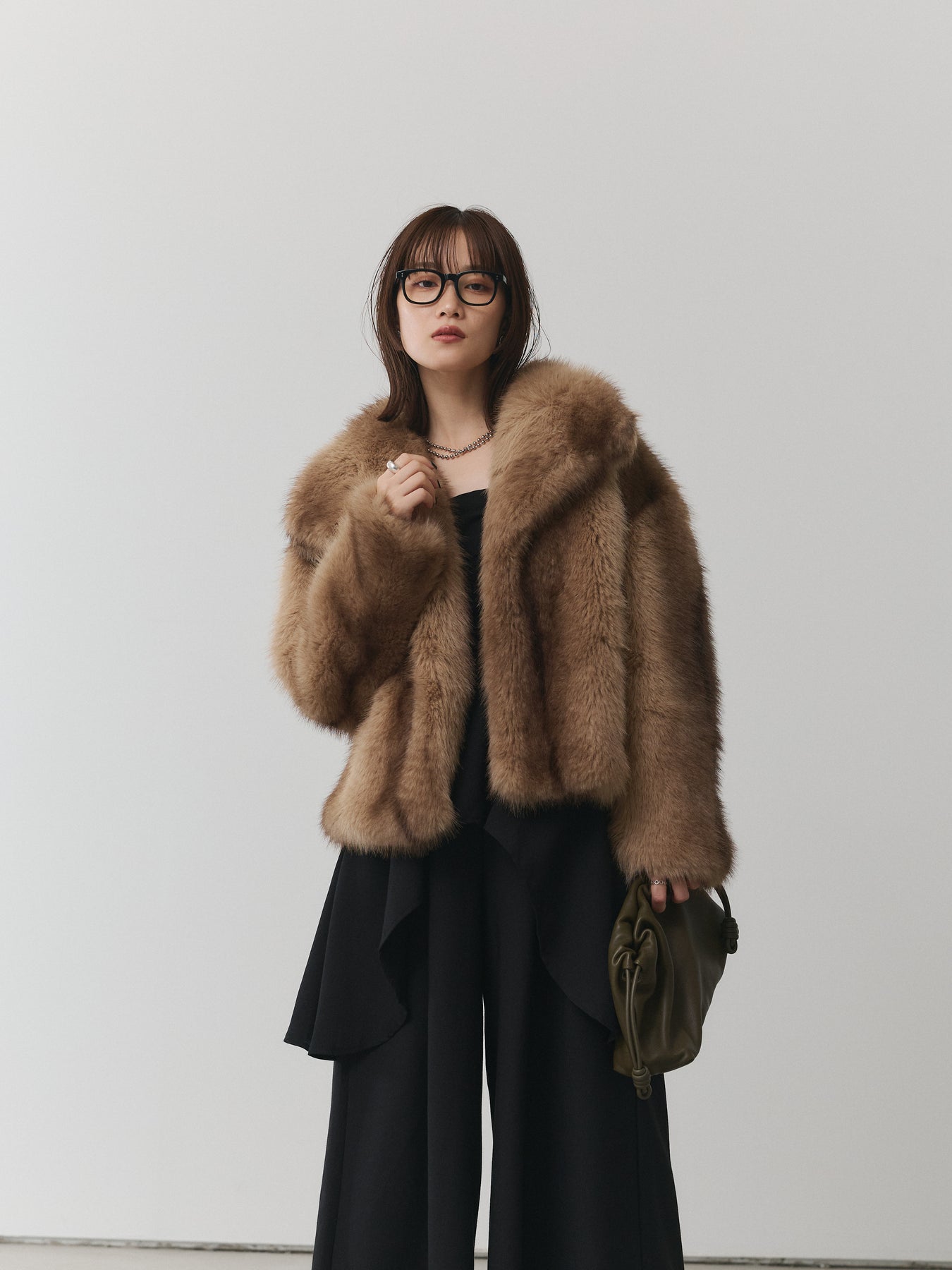 存在感抜群のフェイクファーを贅沢に使用したビッグカラージャケット。ボリュームのある衿デザインが小顔効果を引き立て、羽織るだけで華やかな印象を与えます。ふんわりとした毛並みがリッチな雰囲気を漂わせつつ、フェイクファーならではの軽やかな着心地でデイリーにも取り入れやすい一枚。コンパクトな丈感がバランスを整え、ワイドパンツやスカートなどボリュームのあるボトムとも好相性です。パーティーシーンからデイリーコーデのアクセントまで幅広く活躍し、シーズンスタイルを格上げしてくれる主役級アウターです。 ※ボトムス、キャミソール(インナー)以外の商品は一律でインナーは付属していません。
