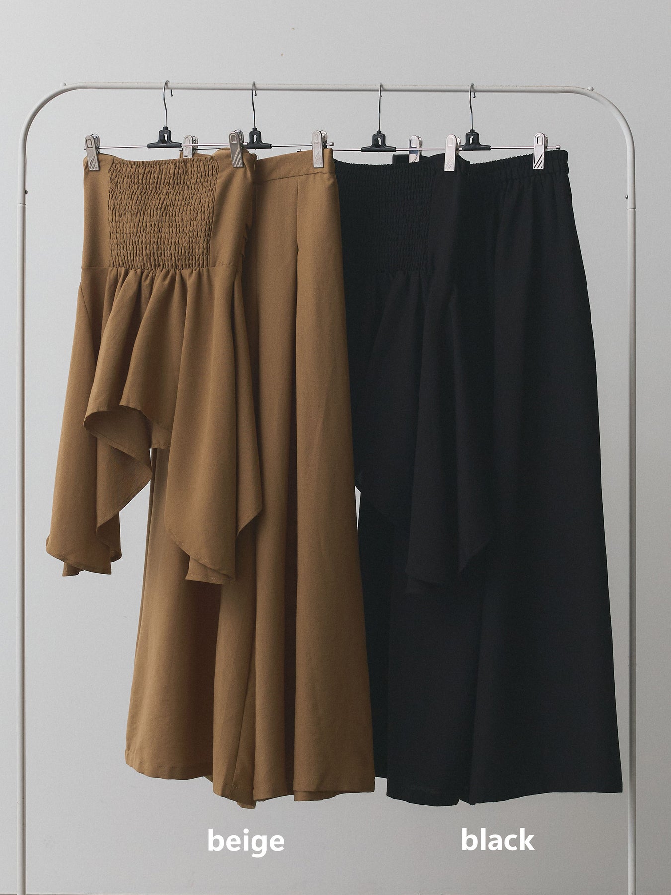 モード感漂うぺプラムベアトップスとワイドパンツのセットアップ。トップスはドレープ感のあるぺプラムデザインが女性らしいシルエットを演出し、ウエスト位置を高く見せることでスタイルアップ効果も抜群。ベア仕様でデコルテを美しく引き立て、特別なシーンにも映える華やかさを兼ね備えています。パンツは落ち感のあるワイドシルエットで、歩くたびにエレガントな揺れ感をプラス。セットでの着用はもちろん、単品使いでトップスはデニムと合わせてカジュアルに、パンツはシャツやニットと合わせてデイリーにも活躍します。オンからオケージョンまで幅広く対応できる主役級アイテムです。