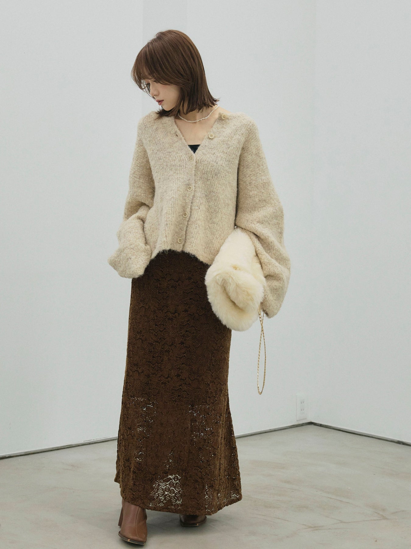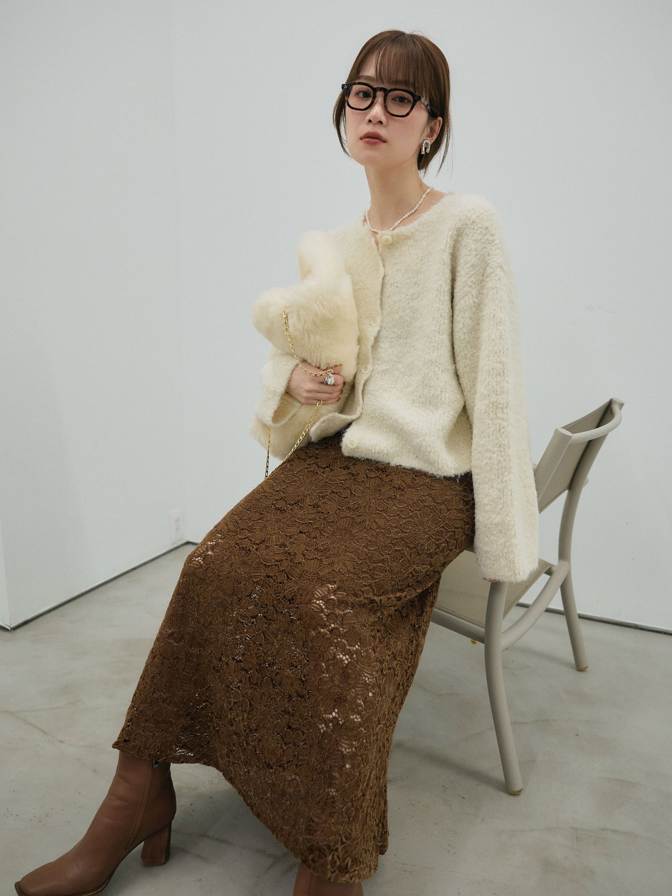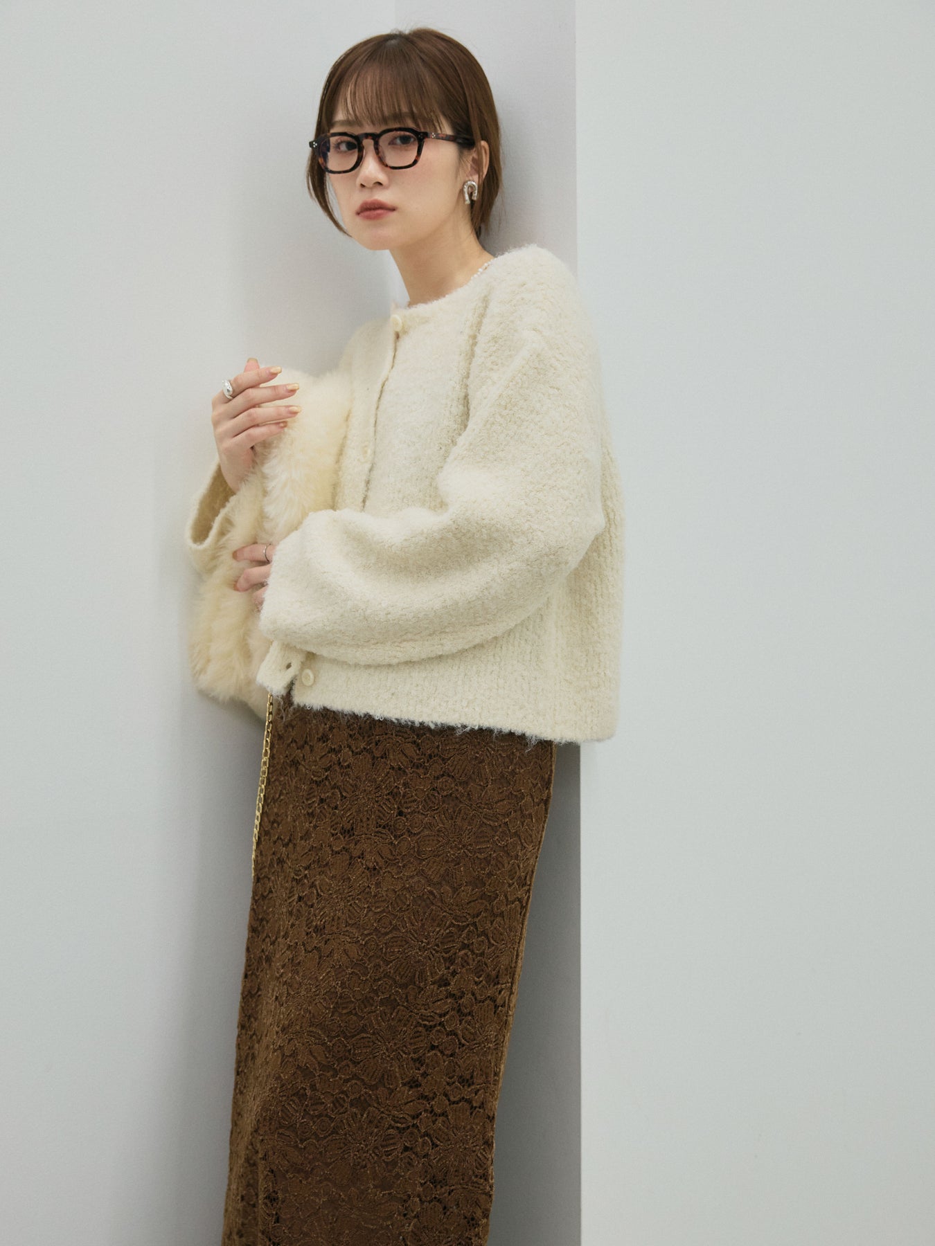 【Allure】[SET]ブークレニットカーディガン+起毛レースストレッチナロースカート(2set)