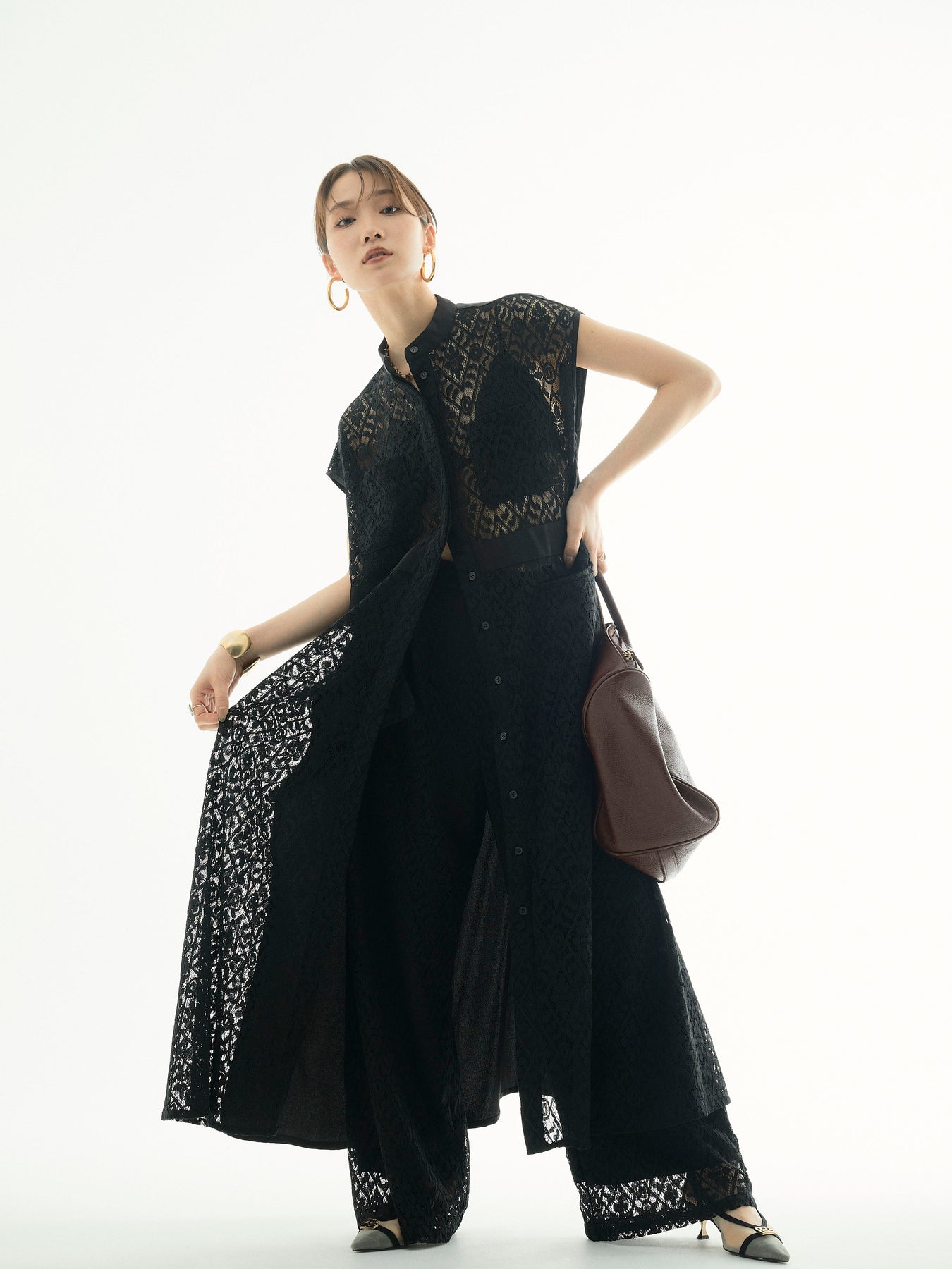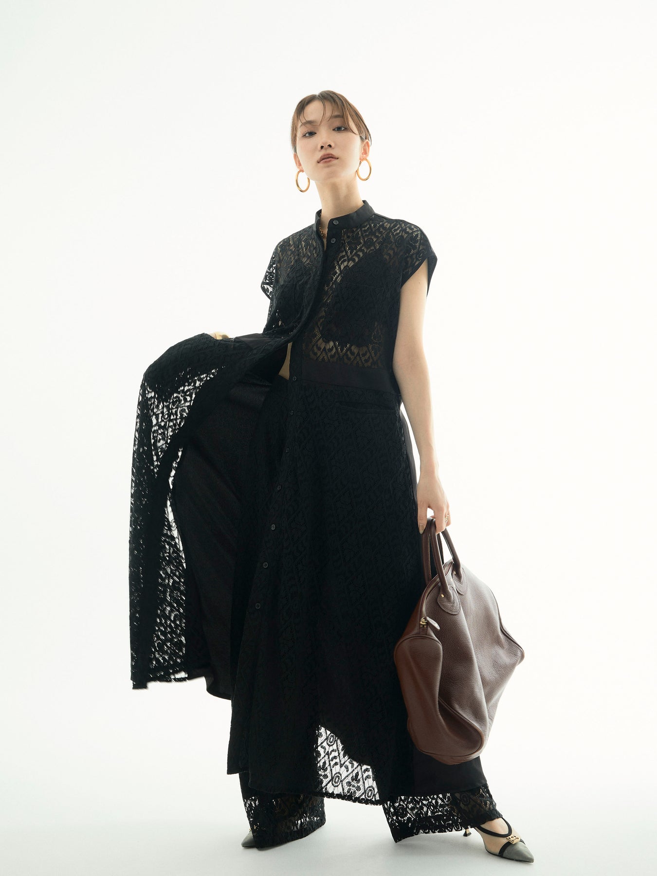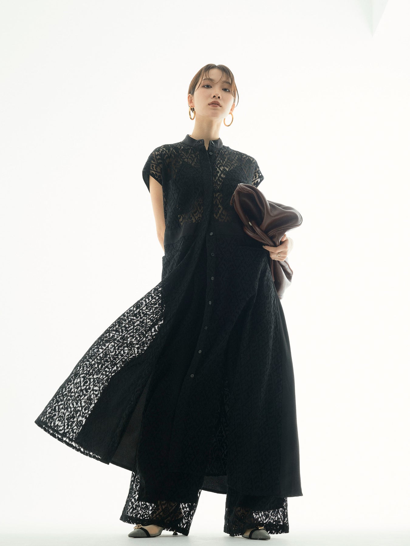 繊細なレースと微光沢のサテン地が組み合わさったロングワンピース。透け感のあるレースで軽やかな雰囲気を演出しつつ、フロントボタンとサテン切替で上品さをプラス。羽織りとしても使える前開き仕様で、コーディネートの幅が広がります。タンクトップやキャミソールとのレイヤードスタイルにも最適です。デイリーからオケージョンまで活躍する1着。